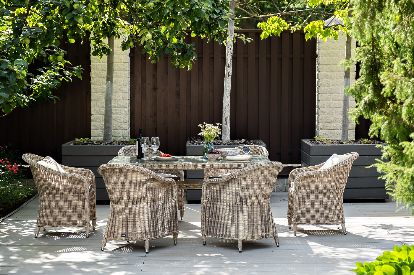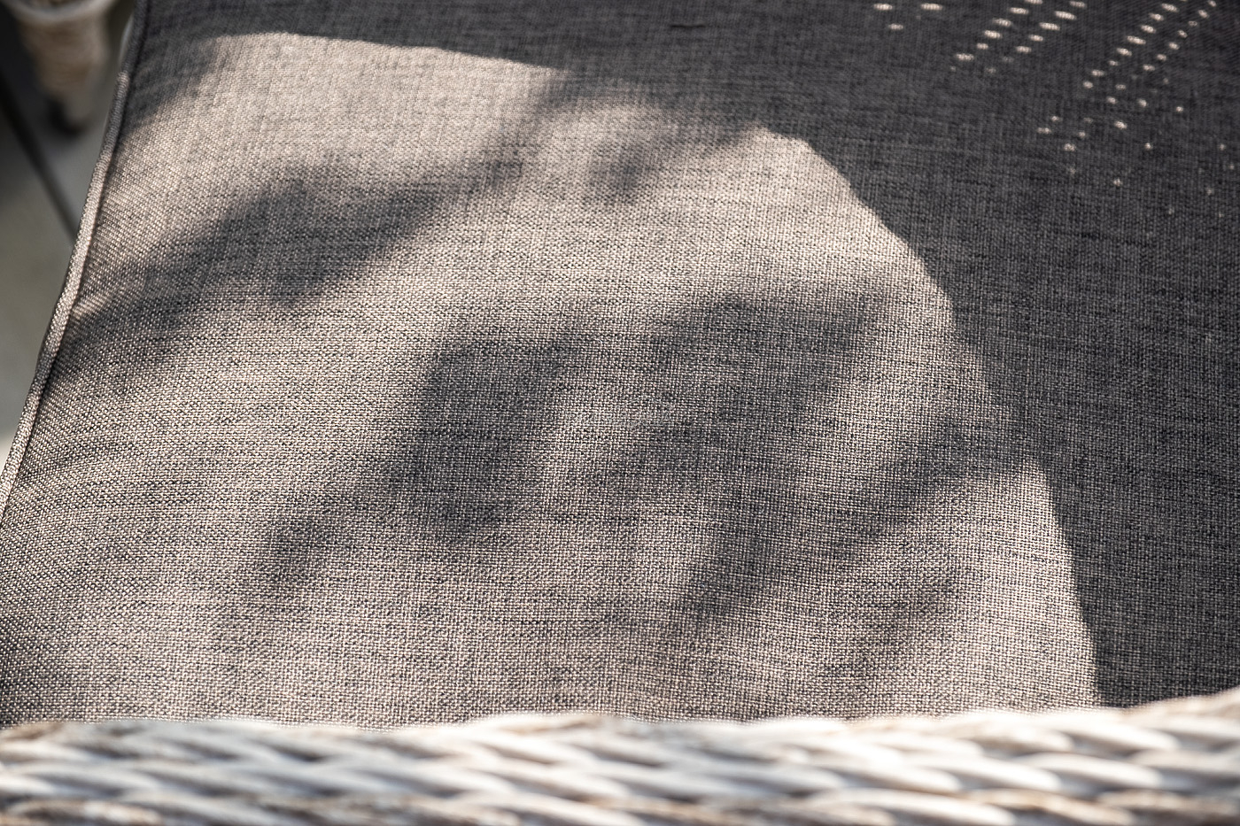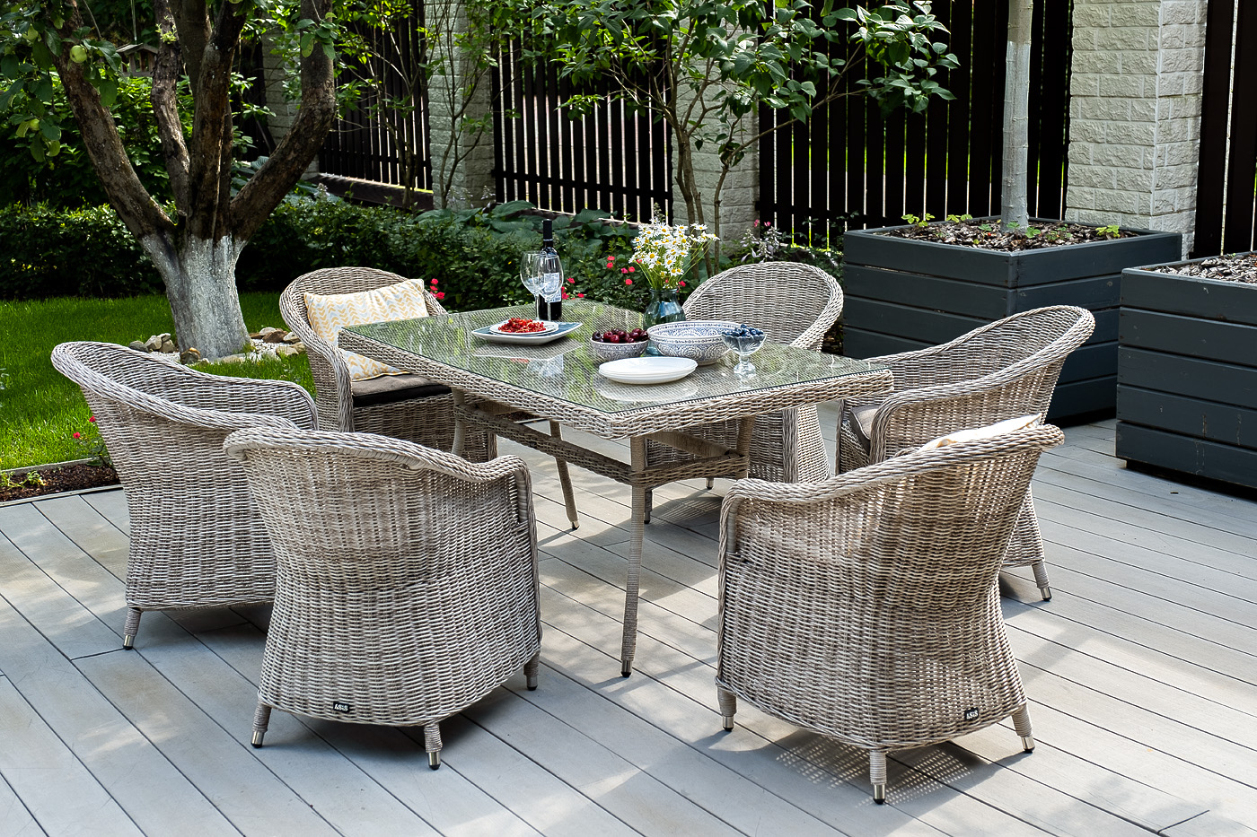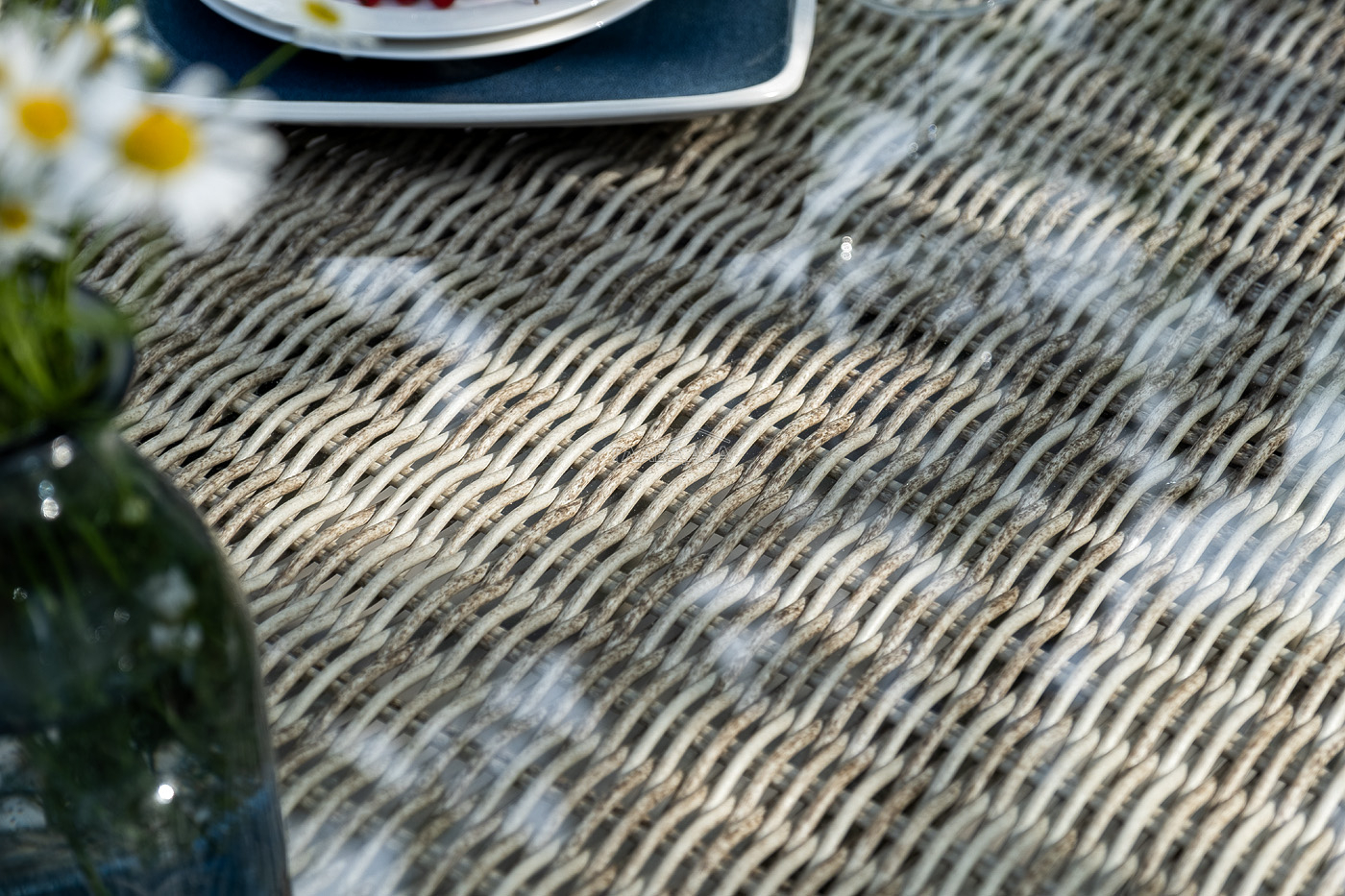 Каркас всех предметов мебели изготовлен из легкого и прочного алюминия, оплетенного вручную искусственным ротангом. Стол для удобства использования накрыт прочным стеклом, кресла укомплектованы подушками со съёмными чехлами серого цвета.