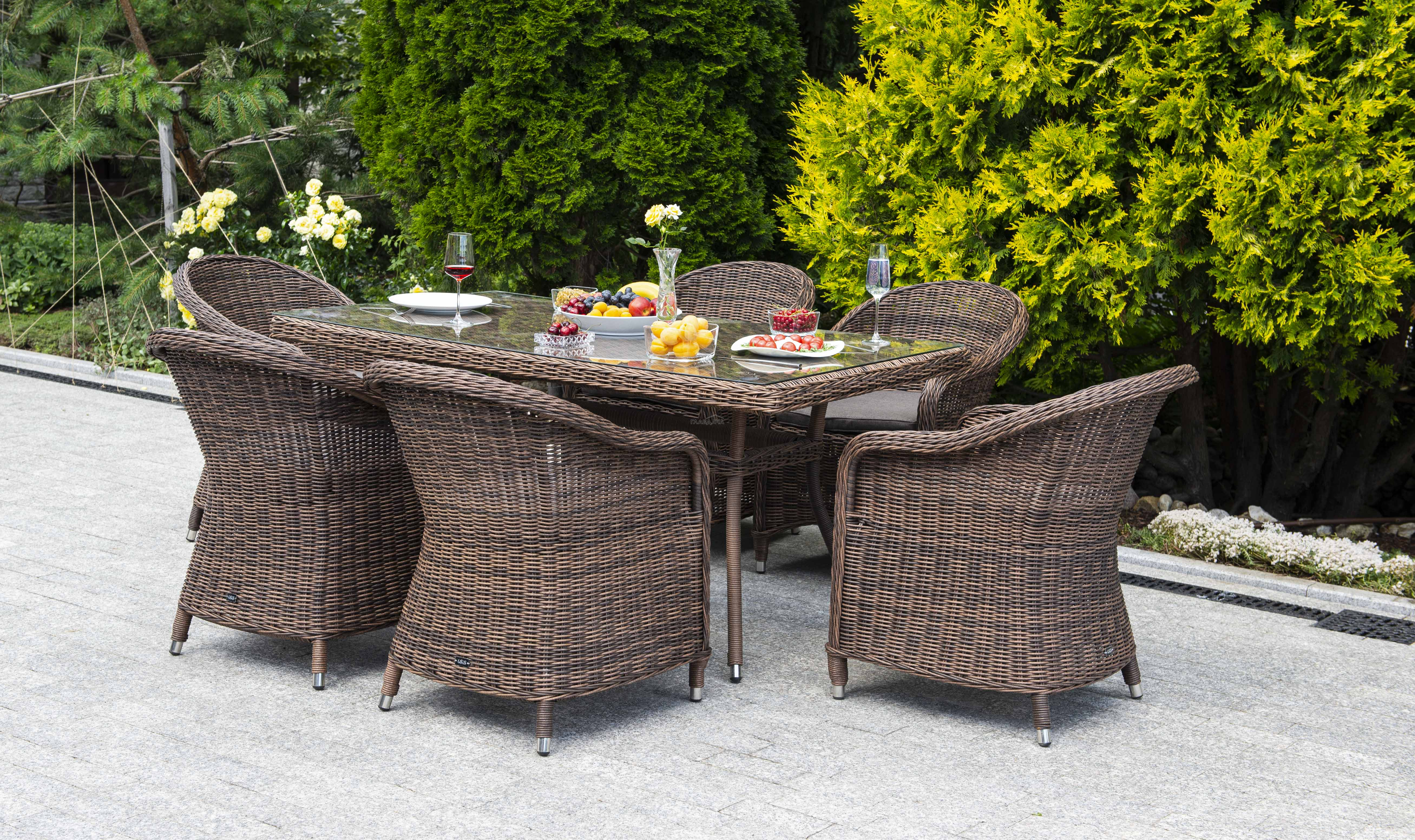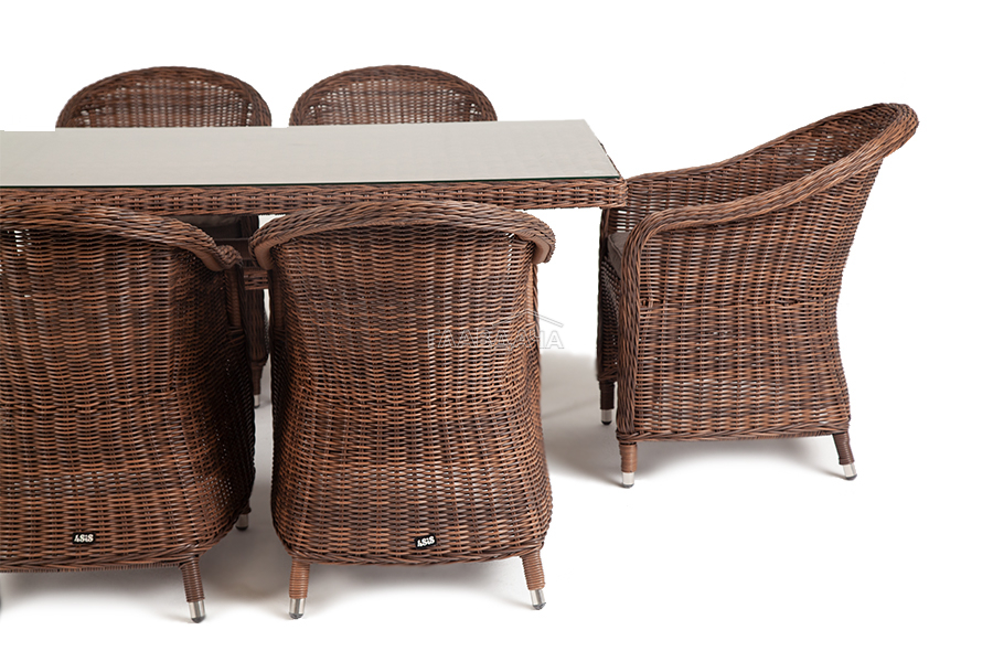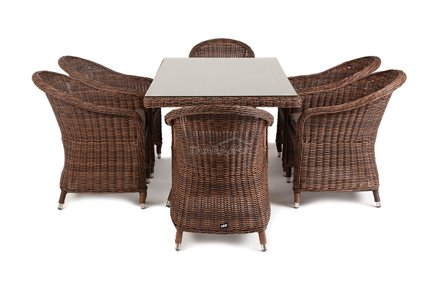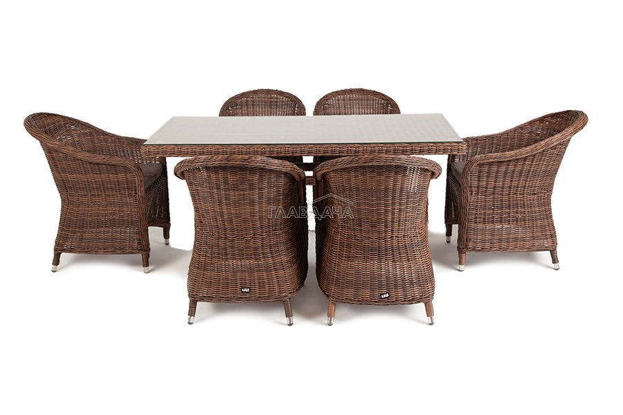 Премиальная обеденная группа для сада, веранды ресторана «Эспрессо» для большой компании. В набор входит большой прямоугольный стол «Латте», размером - 1600×900×750 мм и 6 кресел «Равенна», размер - 570×680×810 мм, в насыщенном коричневом оттенке.
