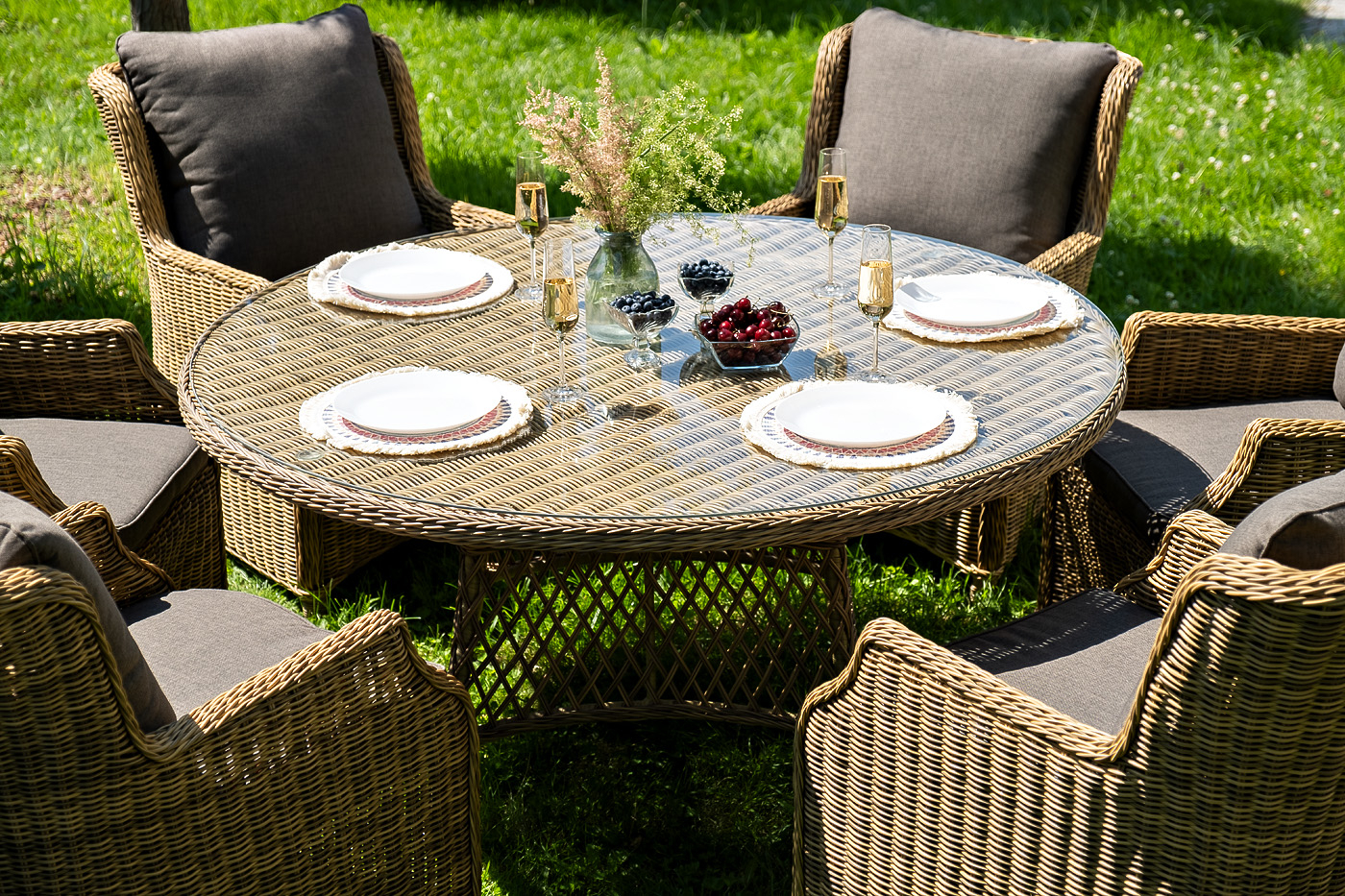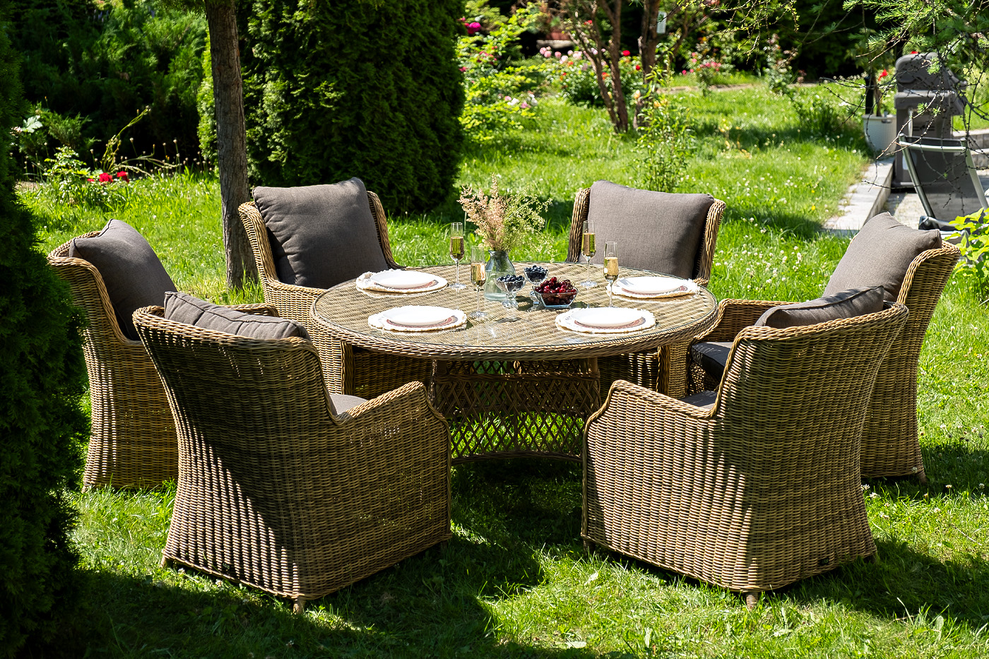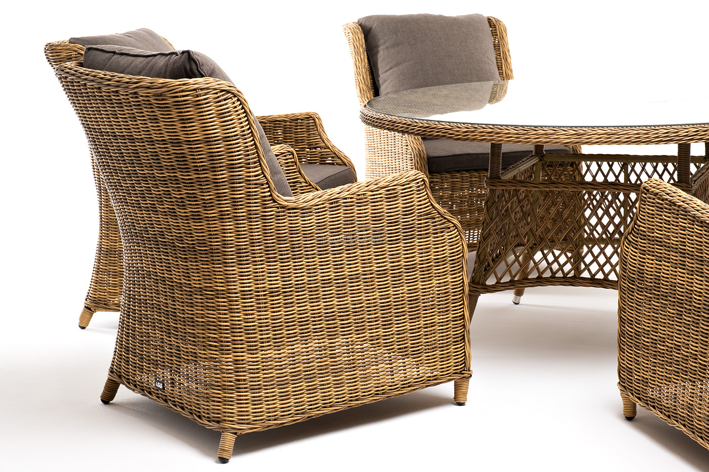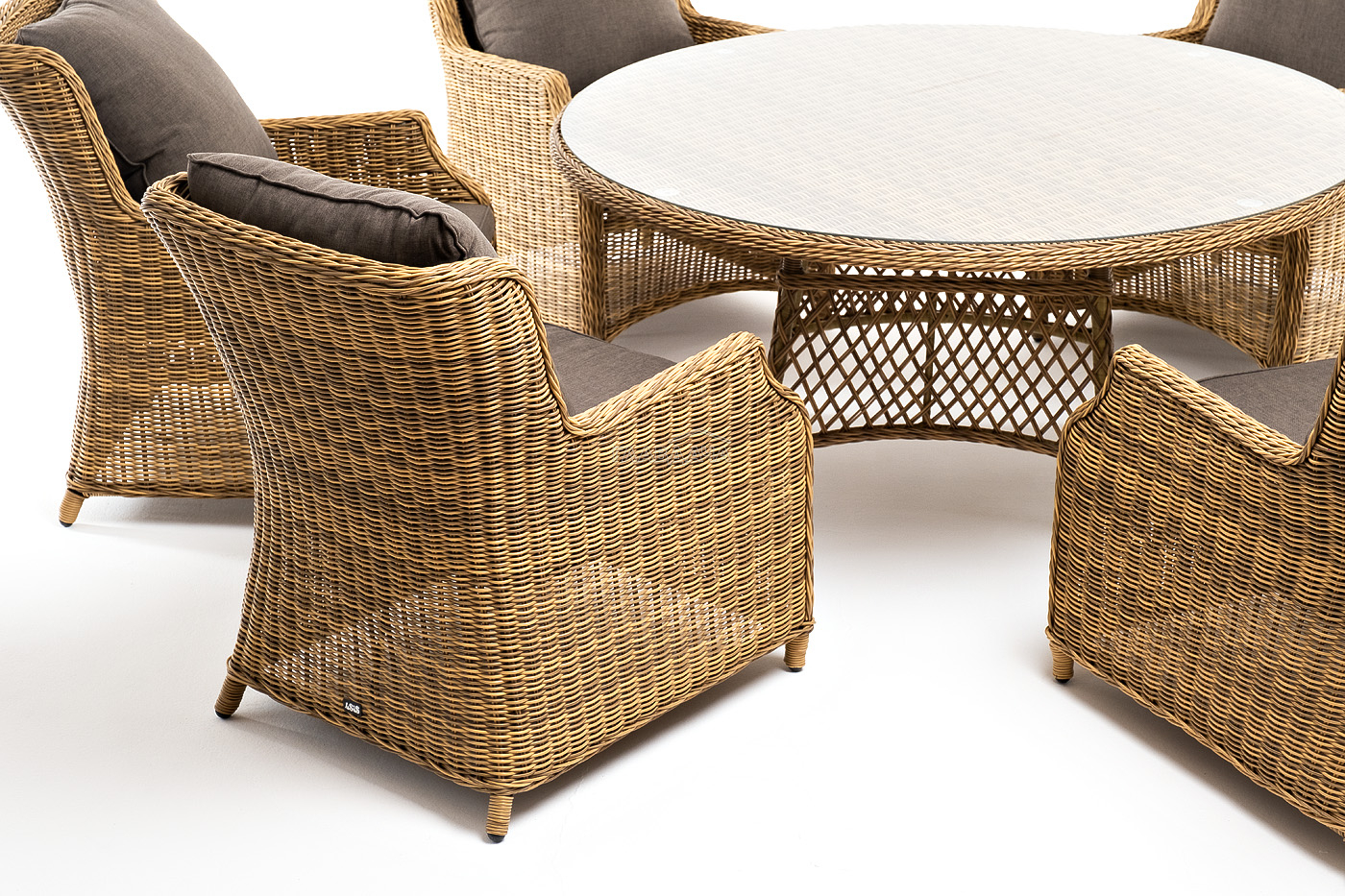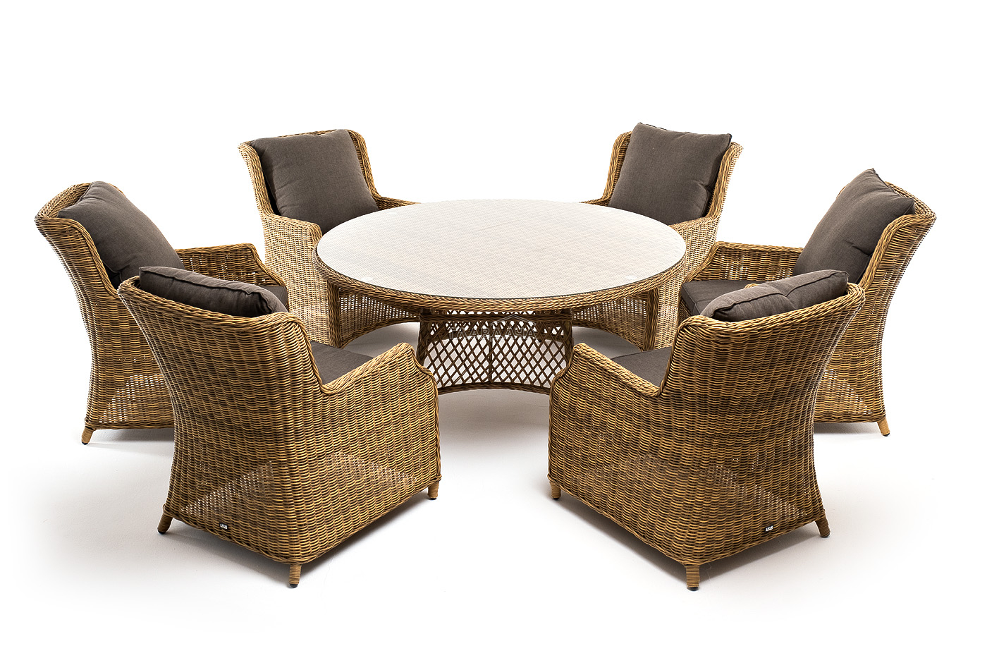 Обеденная группа на 6 персон «Эспрессо» из ротанга. В комплекте: большой круглый обеденный стол (1500×1500×750 мм.) и 6 кресел коллекции «Неаполь» (650×900×920 мм).