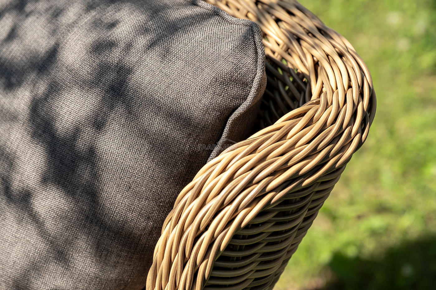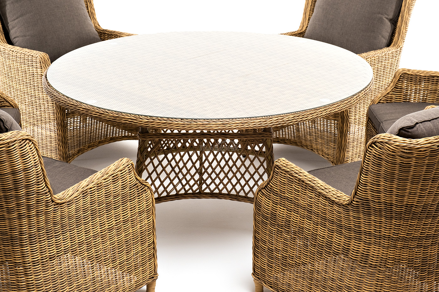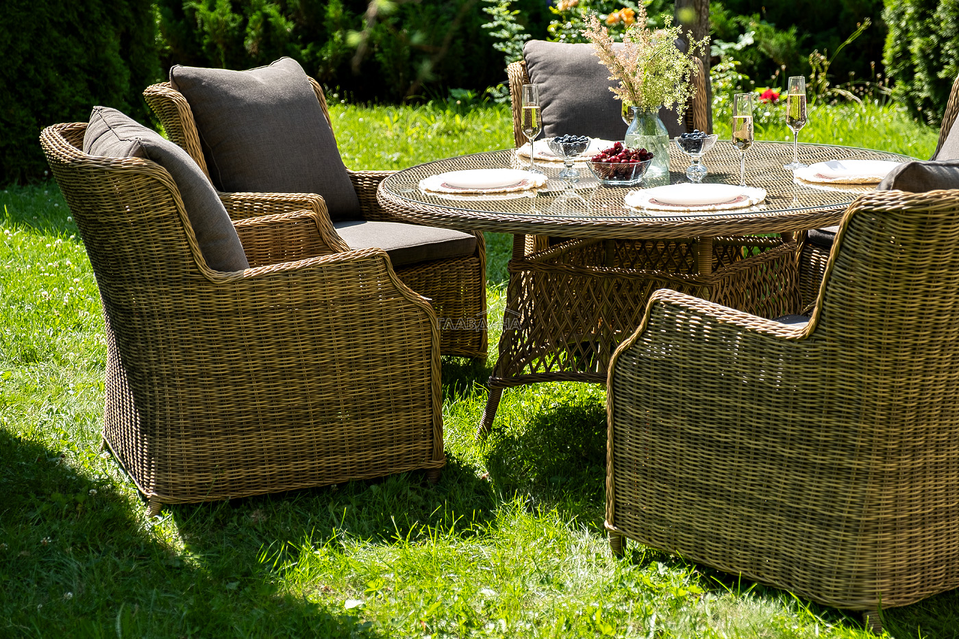 Вся мебель изготовлена из долговечного и легкого алюминия, обтянутого синтетическим ротангом. На столе для удобства эксплуатации предусмотрена столешница из ударопрочного закаленного стекла 5 мм. Стулья укомплектованы подушками на сидениях и на спинках.