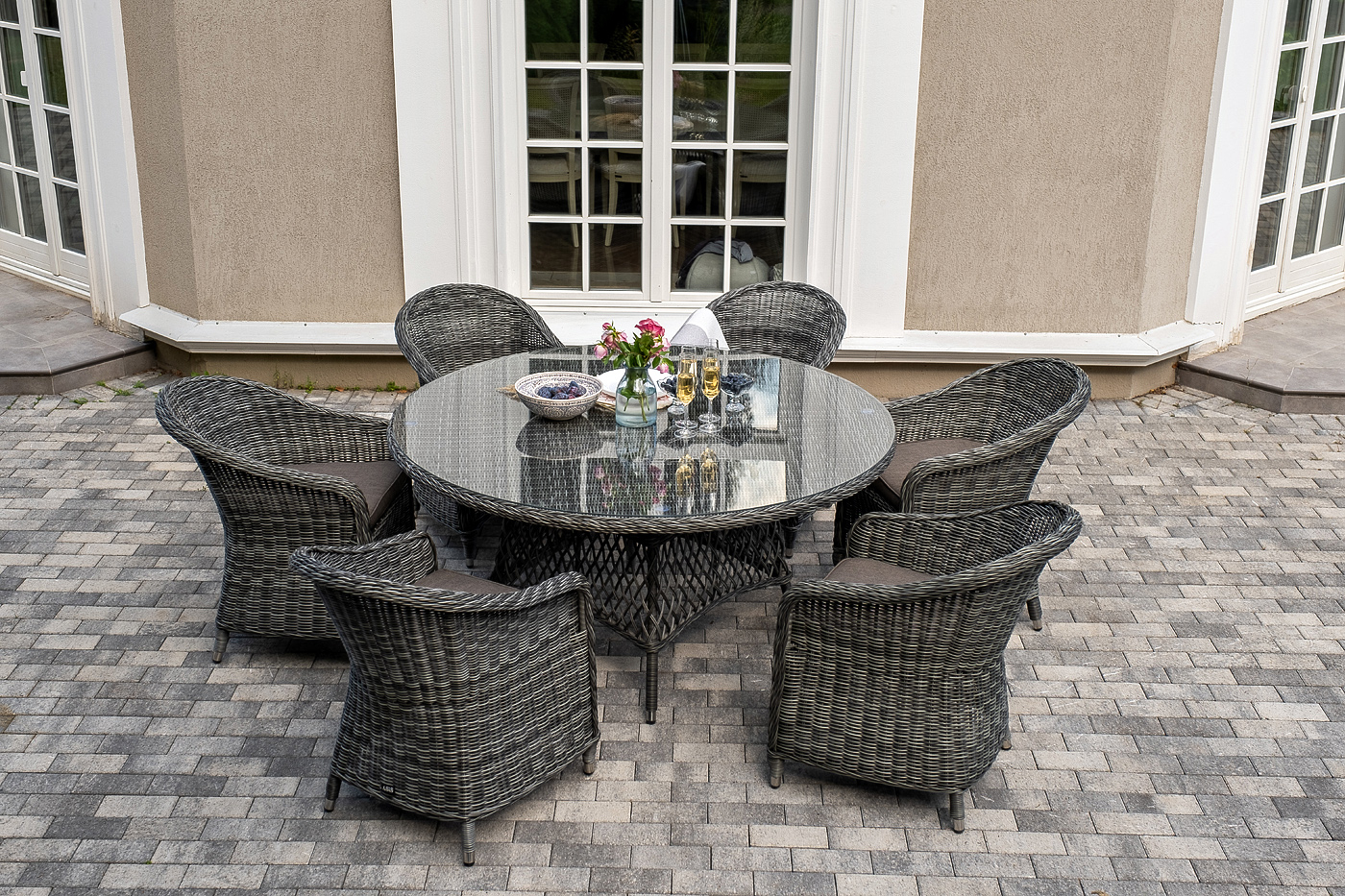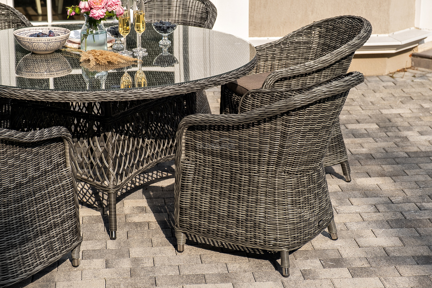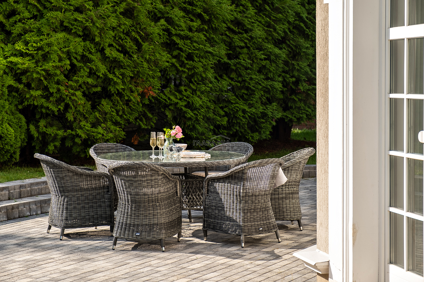 Вся мебель изготовлена из долговечного и легкого алюминия, обтянутого синтетическим ротангом. На столе для удобства эксплуатации предусмотрена столешница из ударопрочного закаленного стекла 5 мм. Стулья укомплектованы подушками на сидениях.