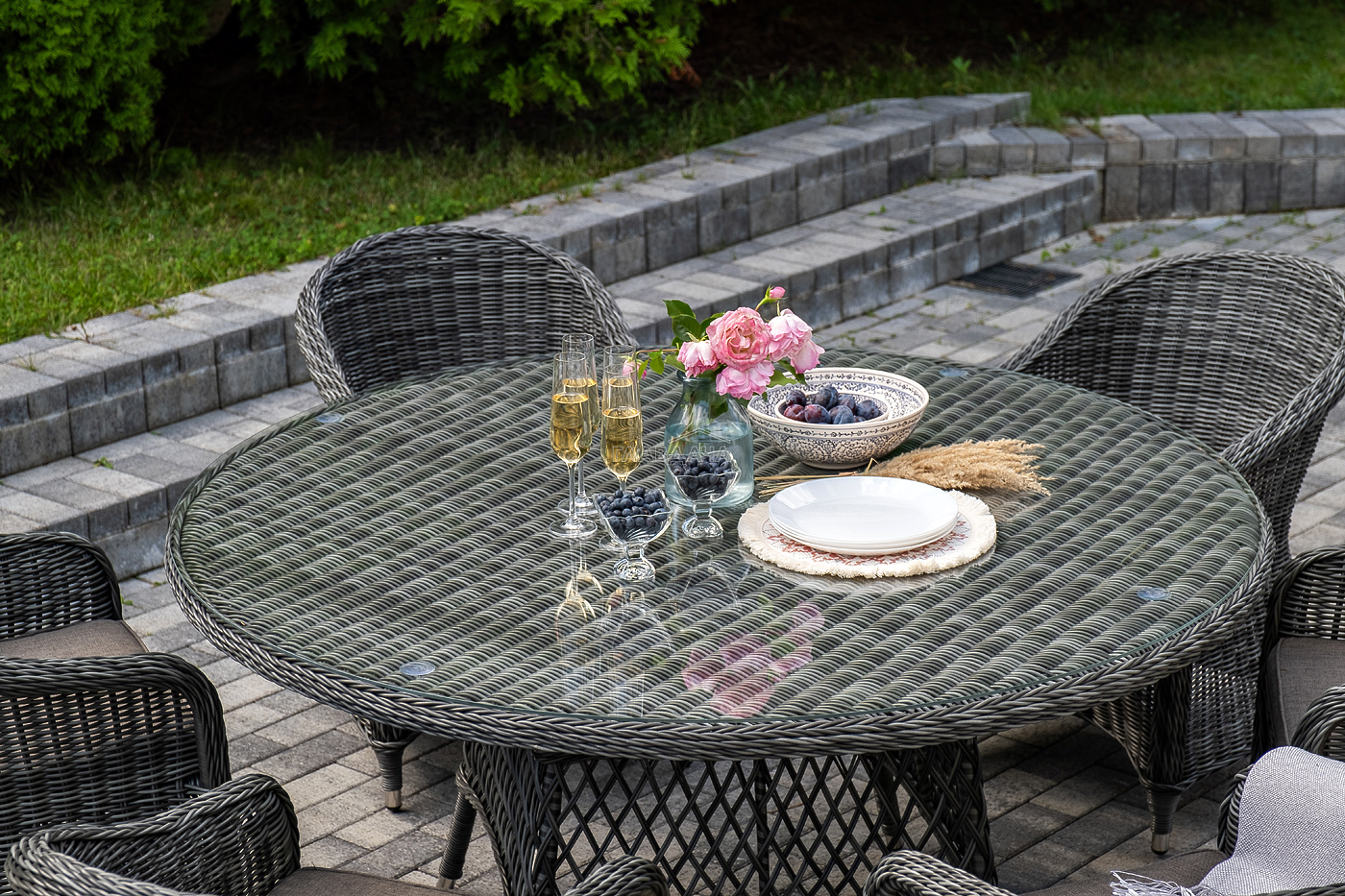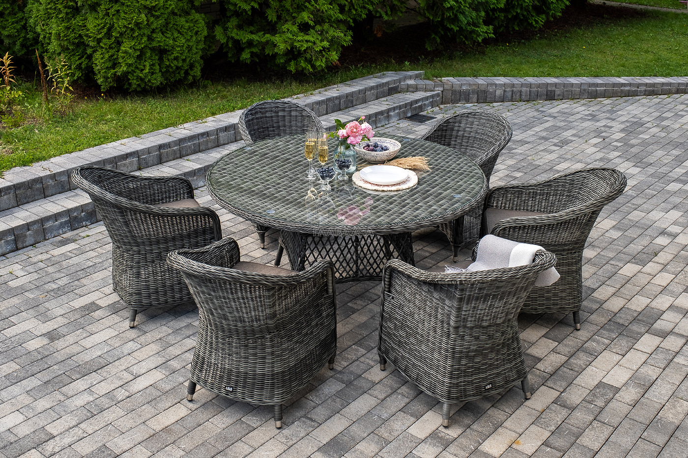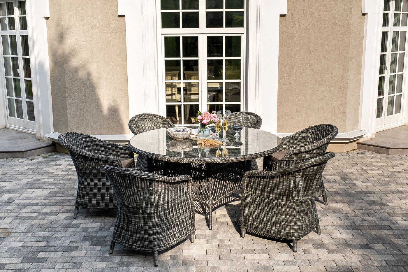 Вся мебель изготовлена из долговечного и легкого алюминия, обтянутого синтетическим ротангом. На столе для удобства эксплуатации предусмотрена столешница из ударопрочного закаленного стекла 5 мм. Стулья укомплектованы подушками на сидениях.