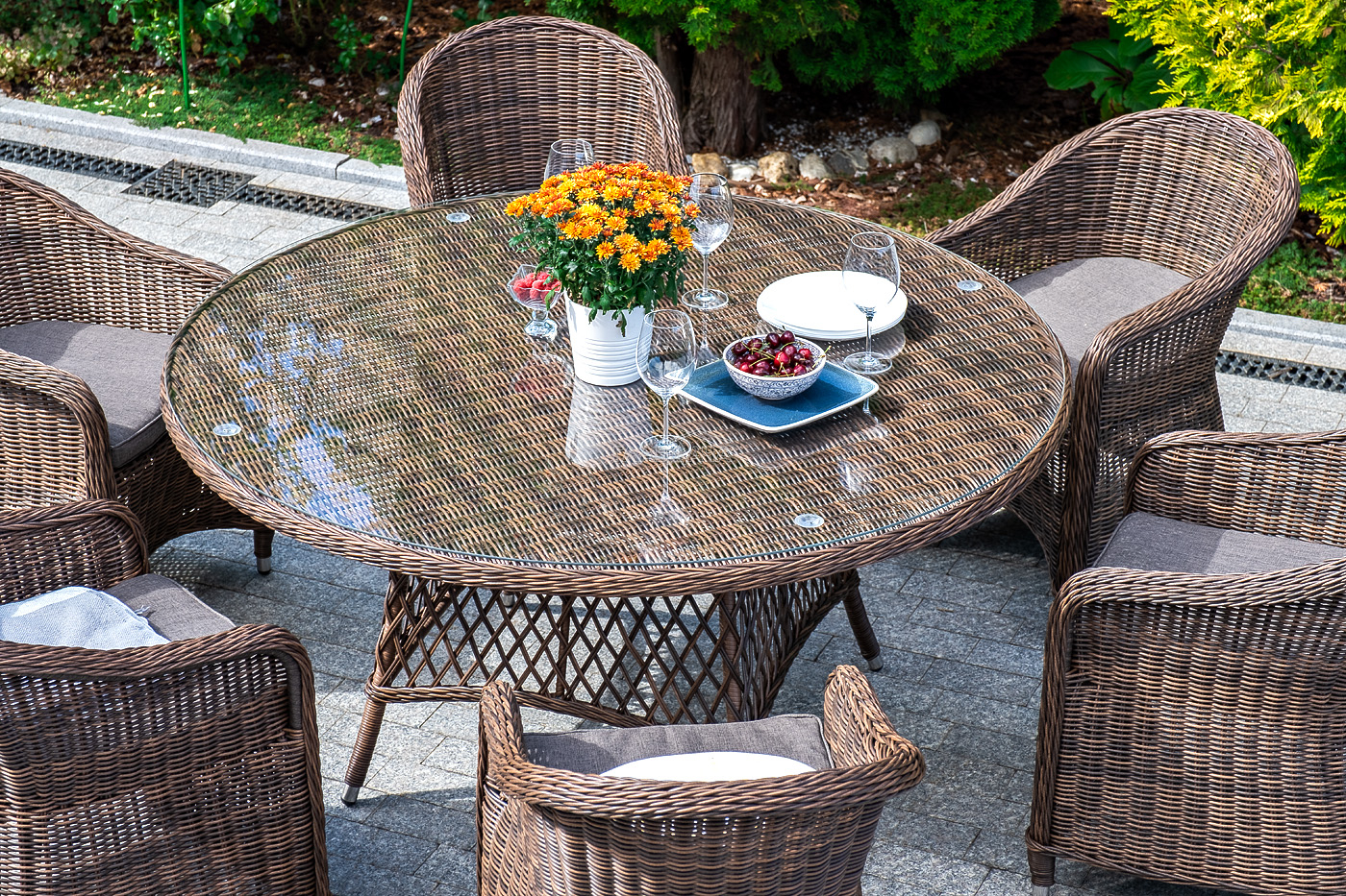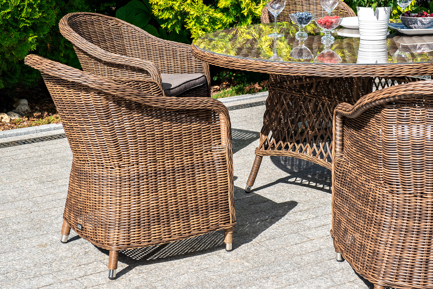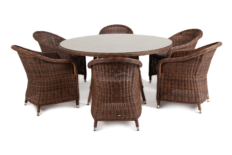 Вся мебель изготовлена из долговечного и легкого алюминия, обтянутого синтетическим ротангом. На столе для удобства эксплуатации предусмотрена столешница из ударопрочного закаленного стекла 5 мм. Стулья укомплектованы подушками на сидениях.