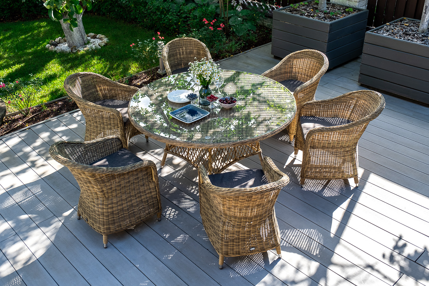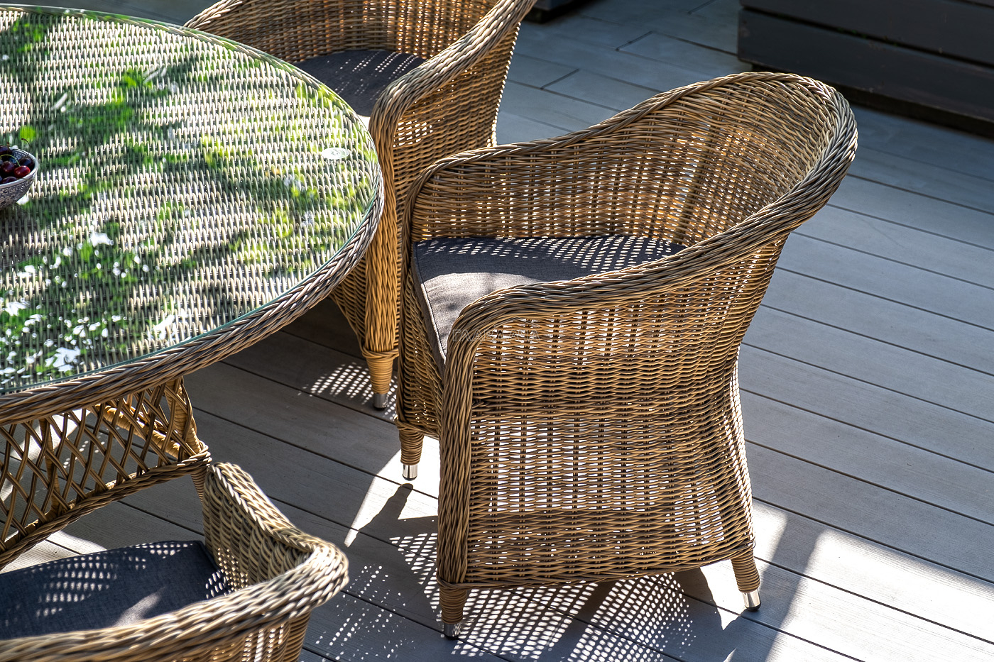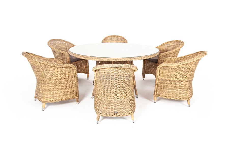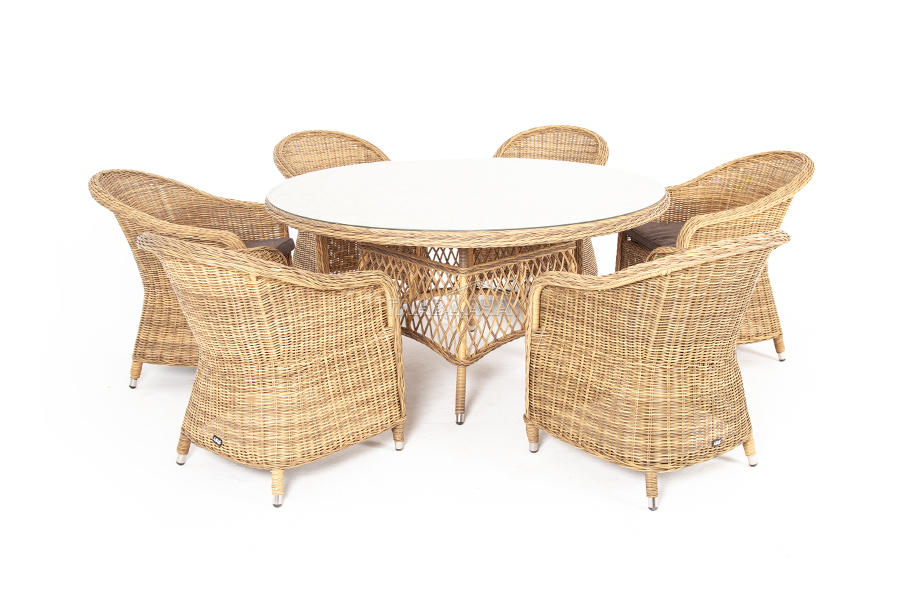 Вся мебель изготовлена из долговечного и легкого алюминия, обтянутого синтетическим ротангом. На столе для удобства эксплуатации предусмотрена столешница из ударопрочного закаленного стекла 5 мм. Стулья укомплектованы подушками на сидениях.