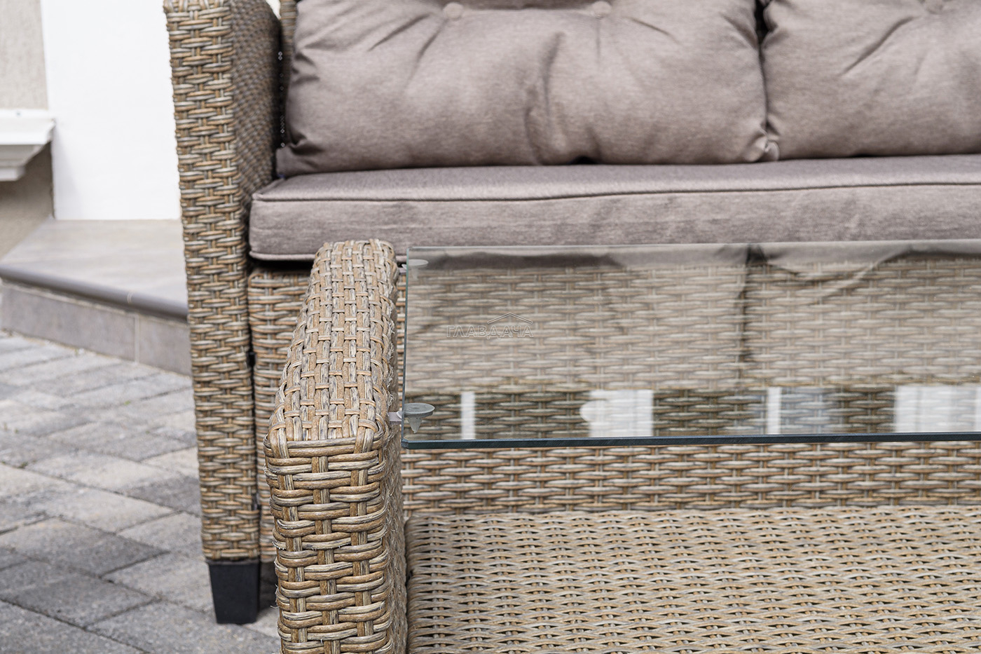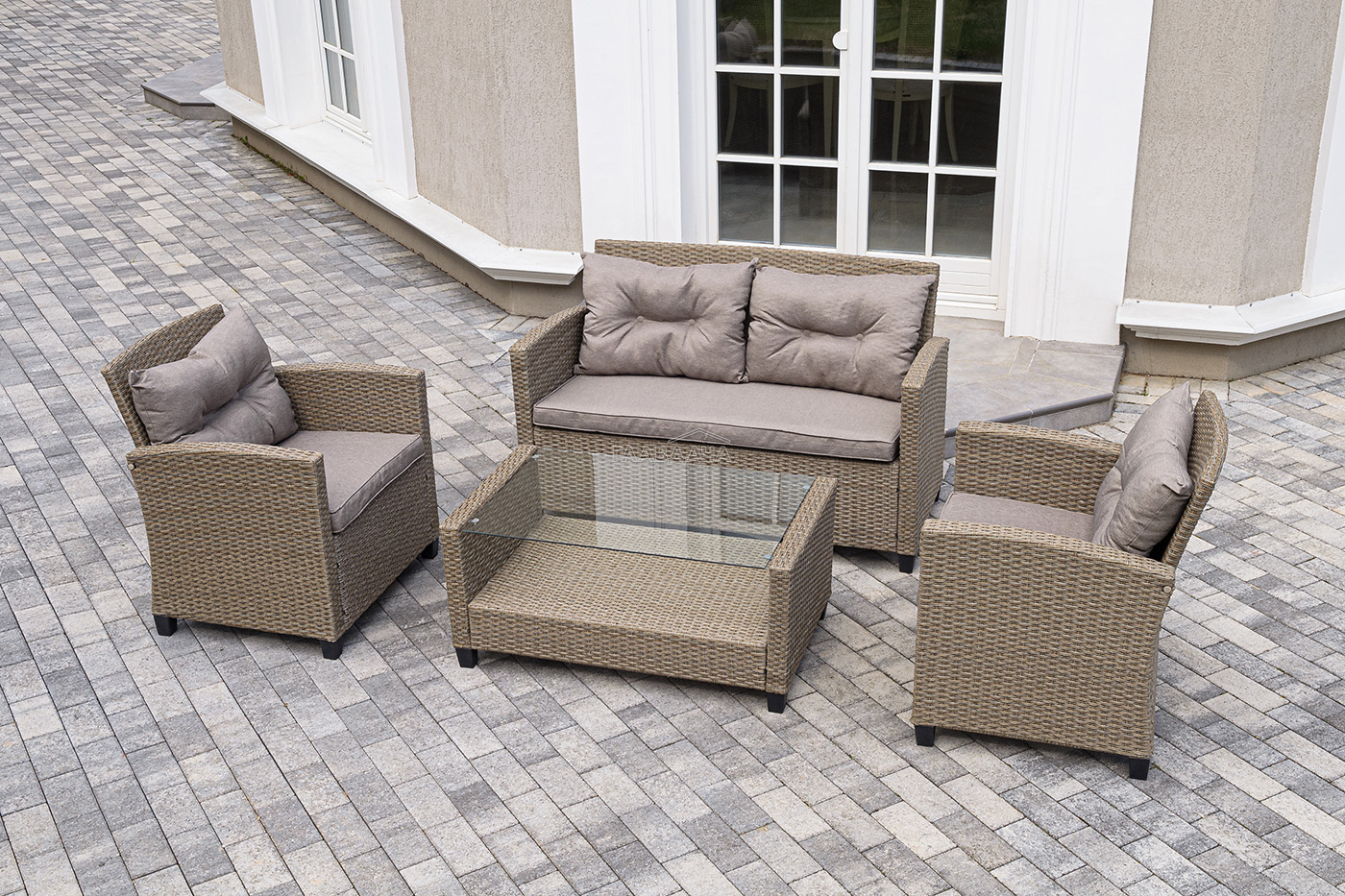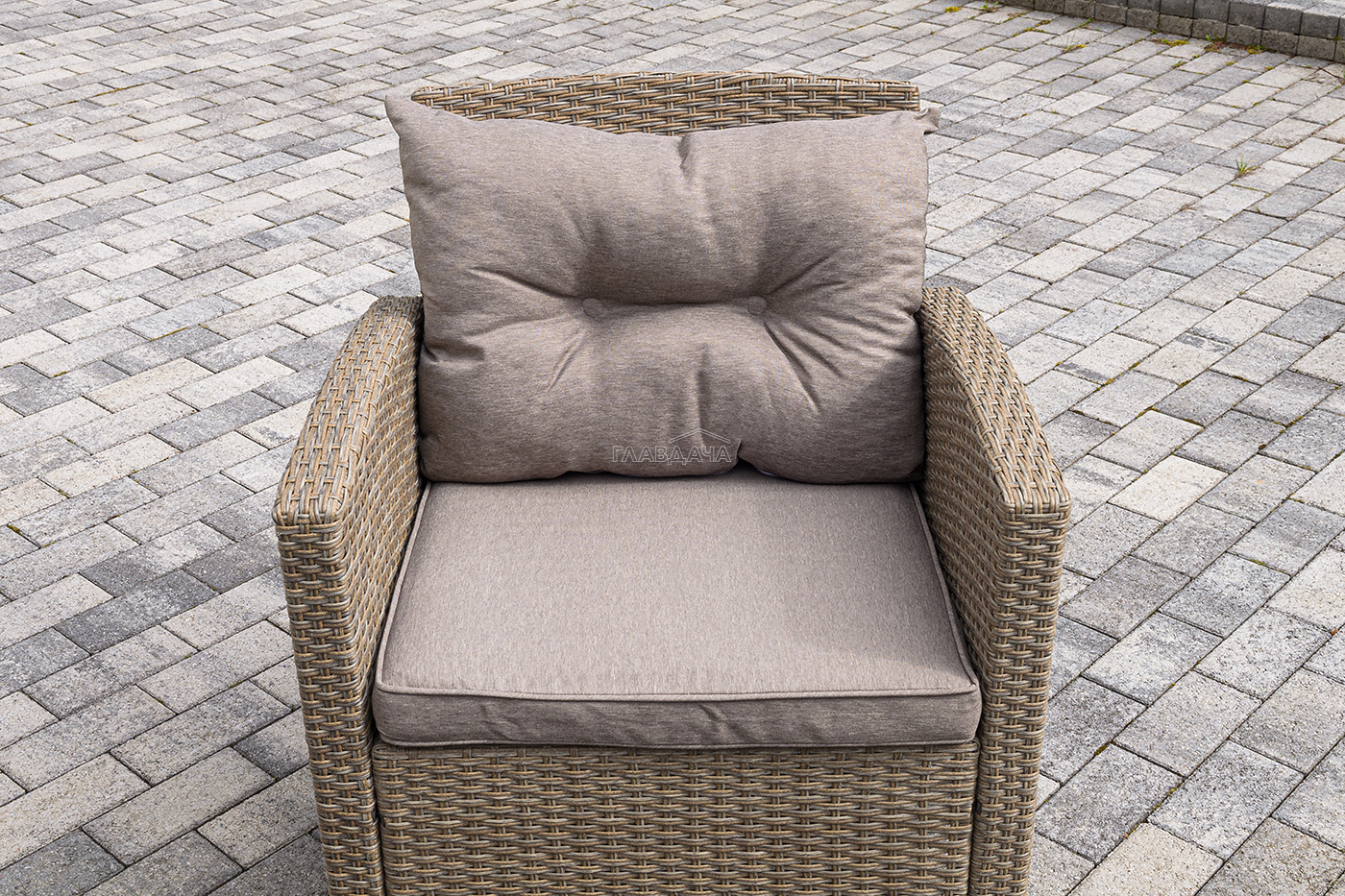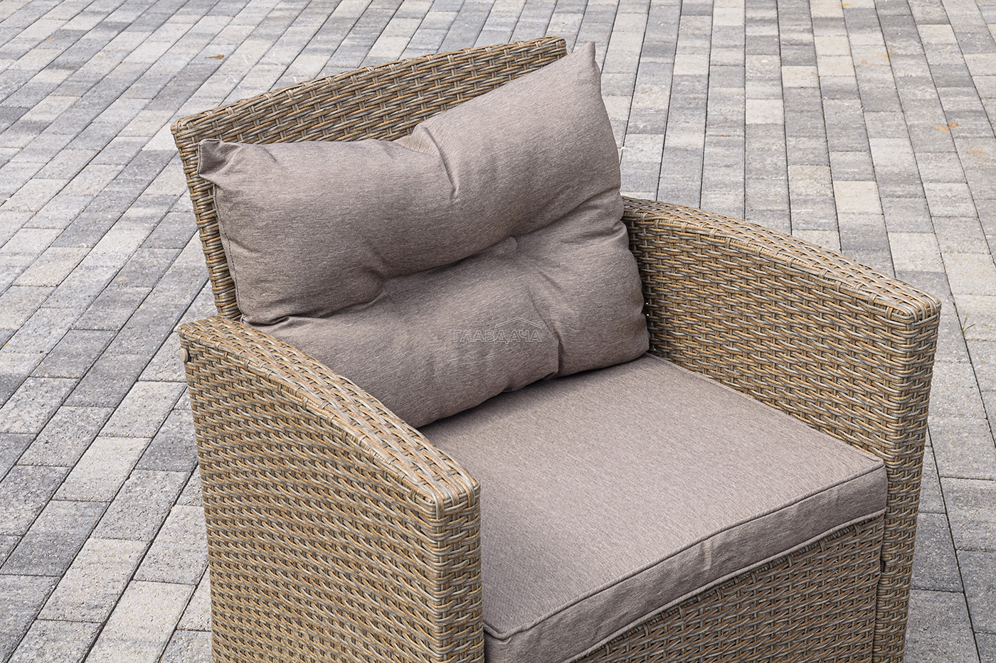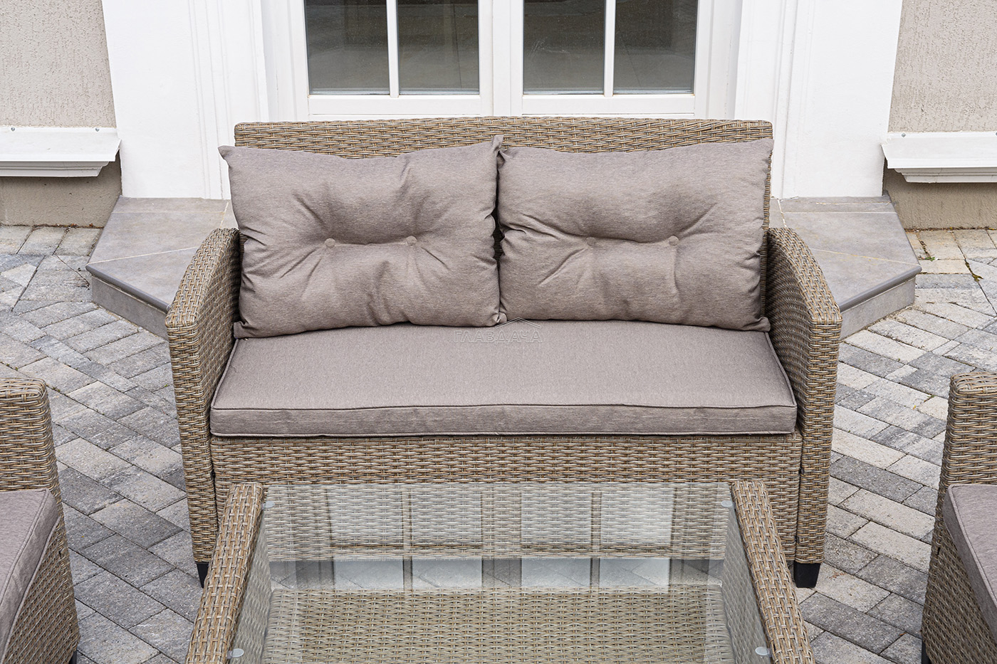 Плетеная мебель дополнена удобными подушками в бежевых чехлах. При их изготовлении используют полиэстер, плотность – 230гр/м2.