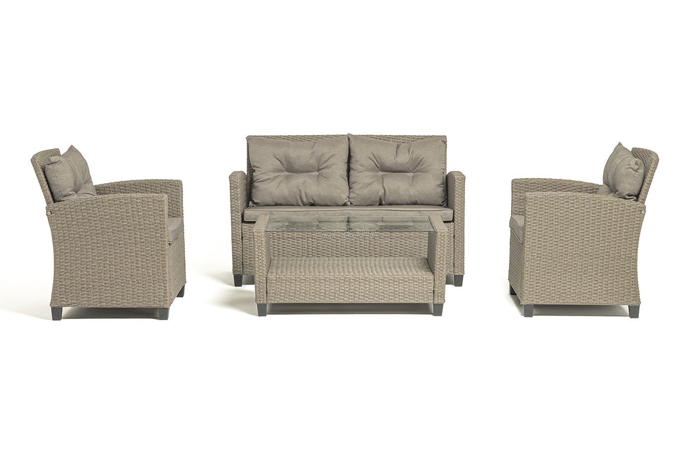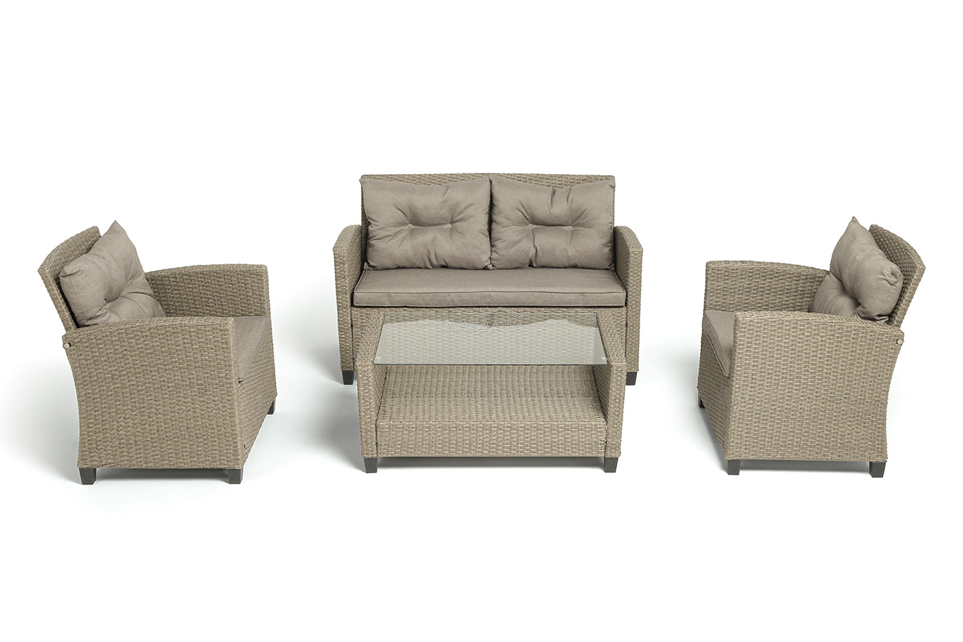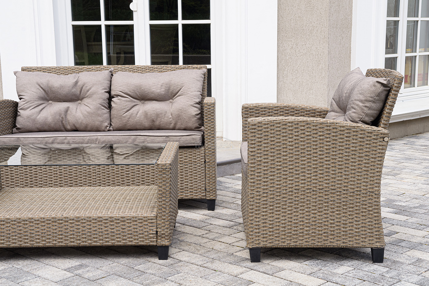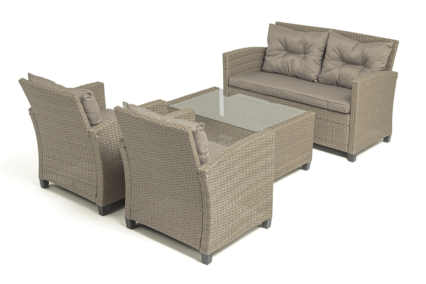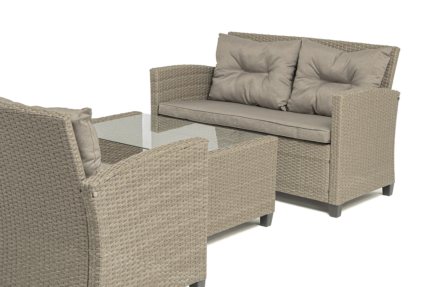 Плетеная мебель дополнена удобными подушками в бежевых чехлах. При их изготовлении используют полиэстер, плотность – 230гр/м2.