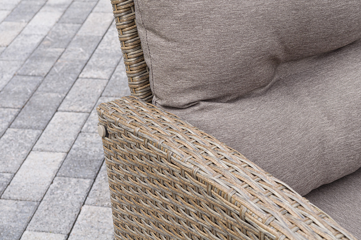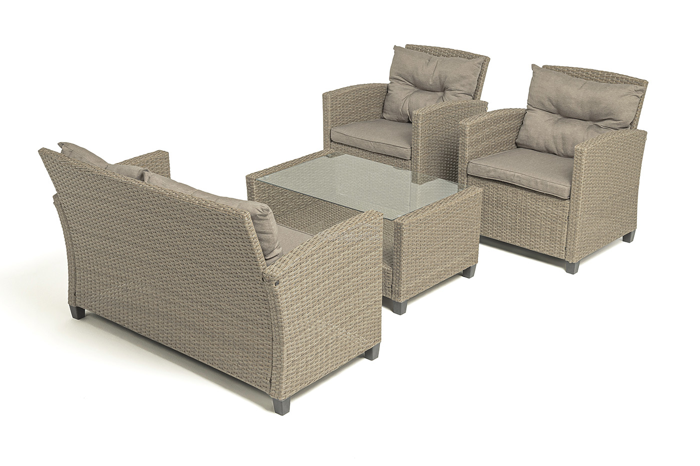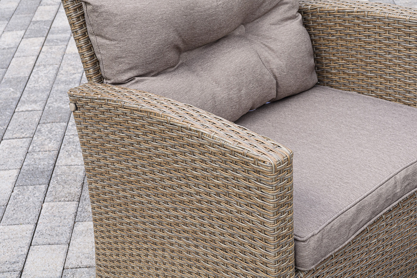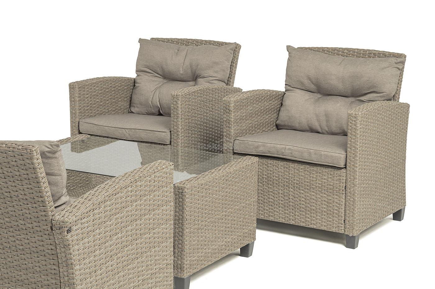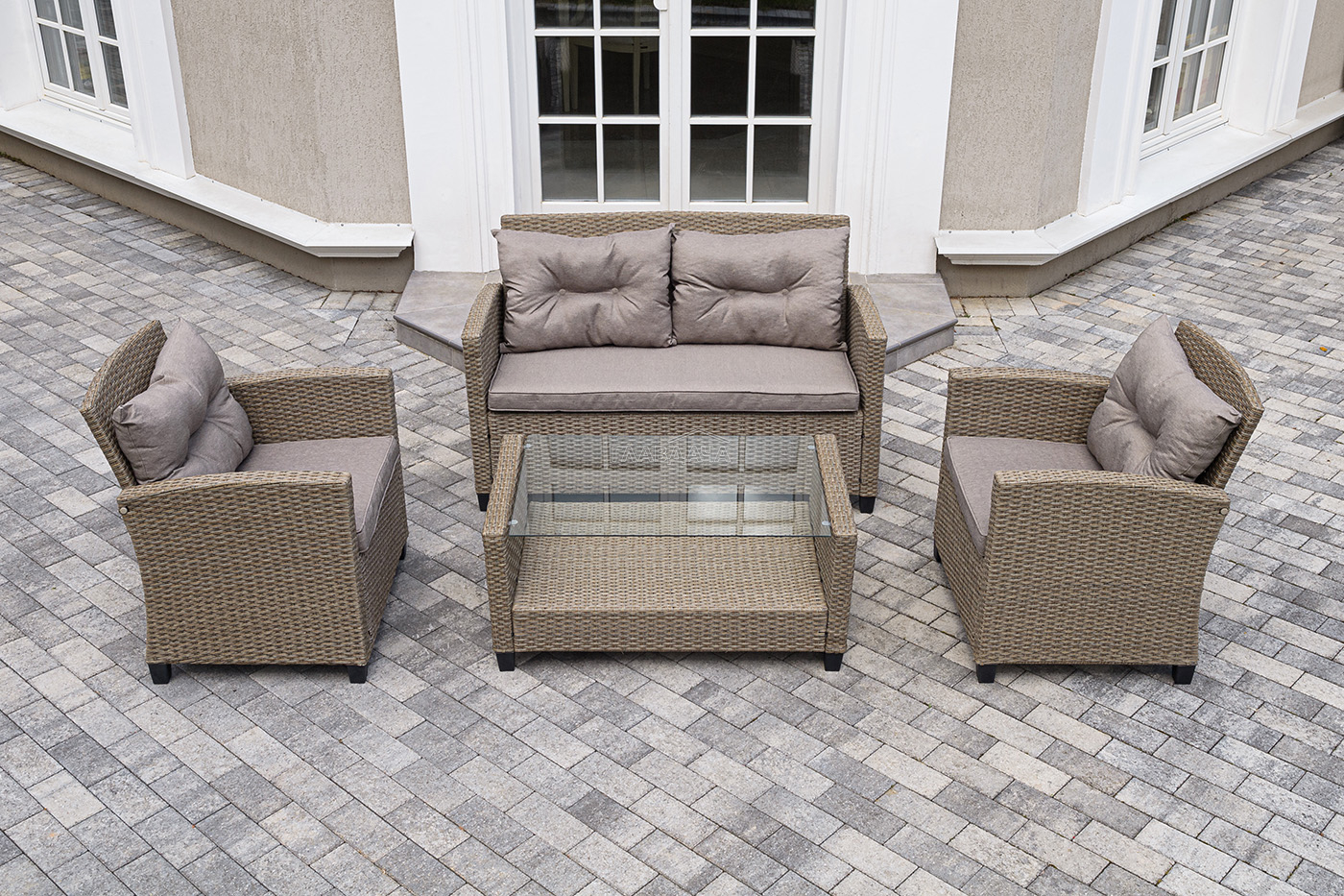 Плетеная мебель дополнена удобными подушками в бежевых чехлах. При их изготовлении используют полиэстер, плотность – 230гр/м2.