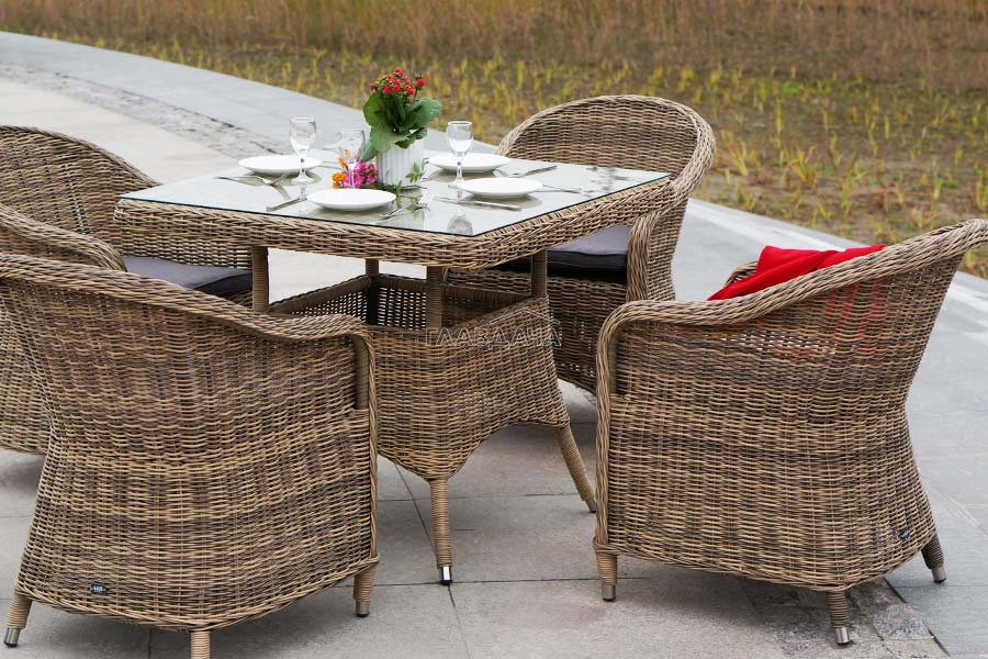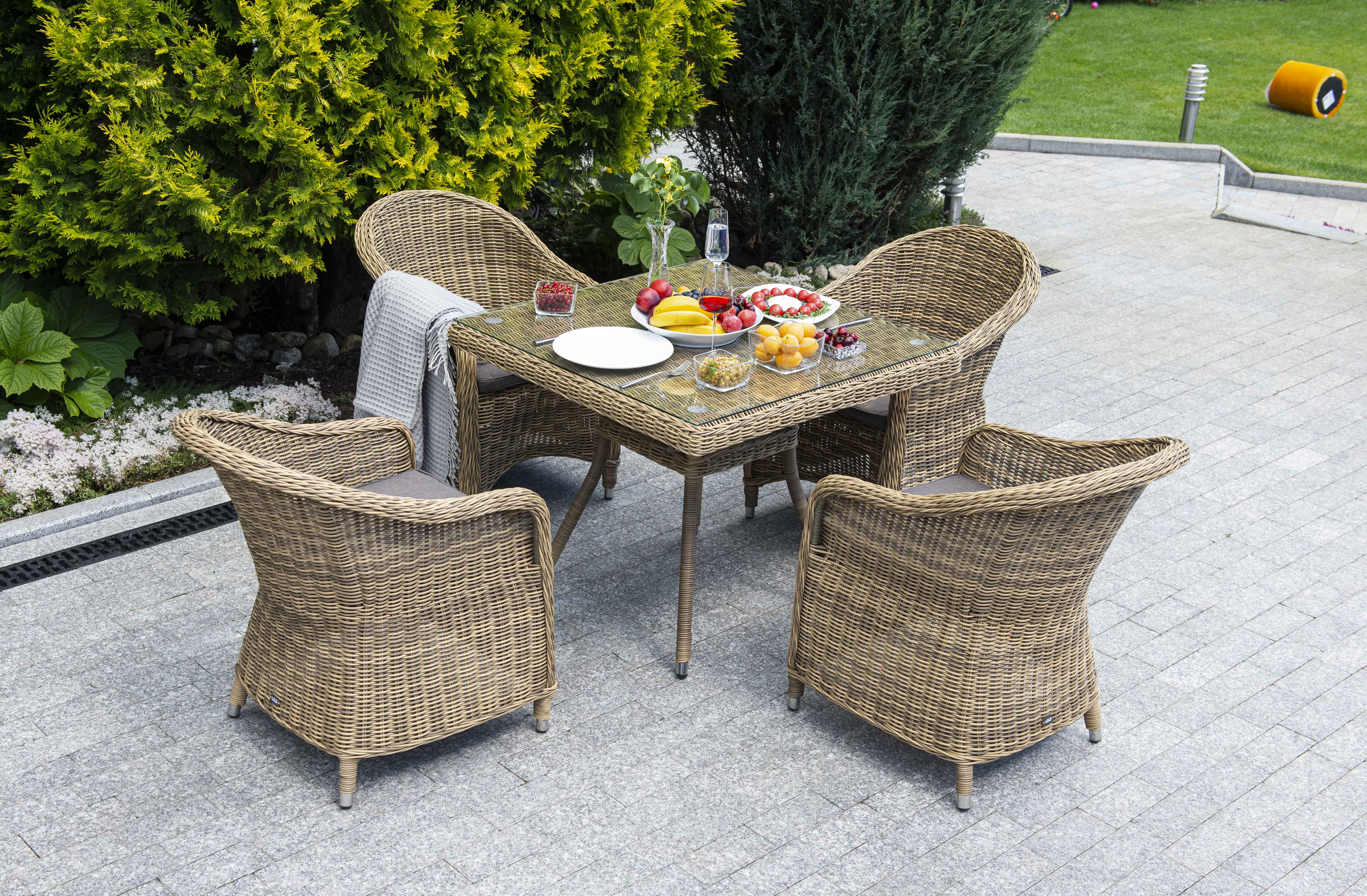 Уличная обеденная группа «Фредо» для обустройства зоны отдыха. Комплект состоит из: квадратного обеденного стола «Айриш» - 900×900×750 мм и 4 кресел «Равенна» - 570×680×810 мм в натуральном соломенном цвете.