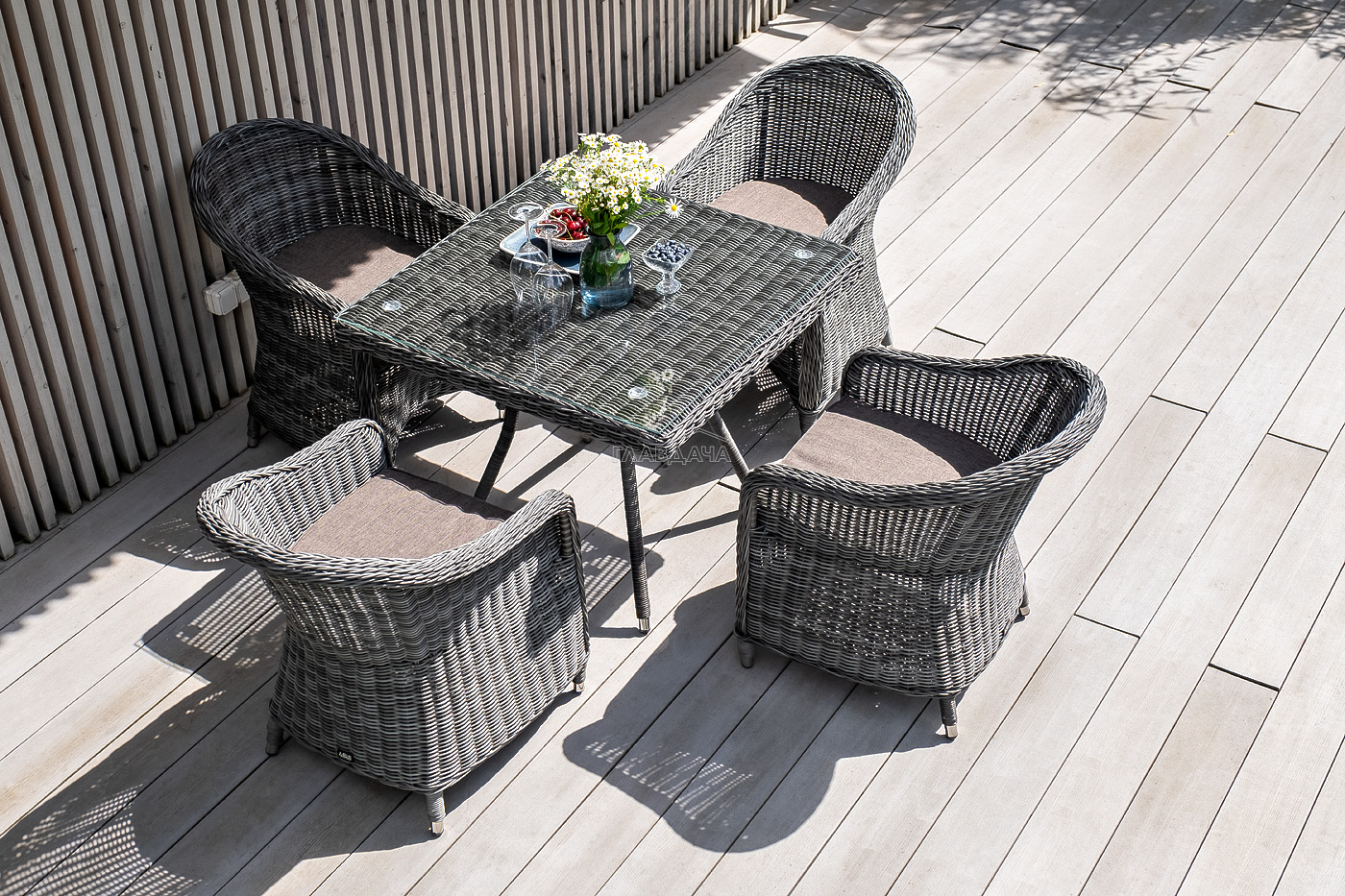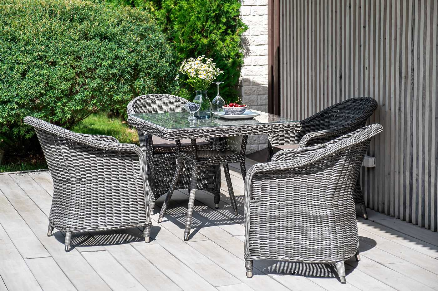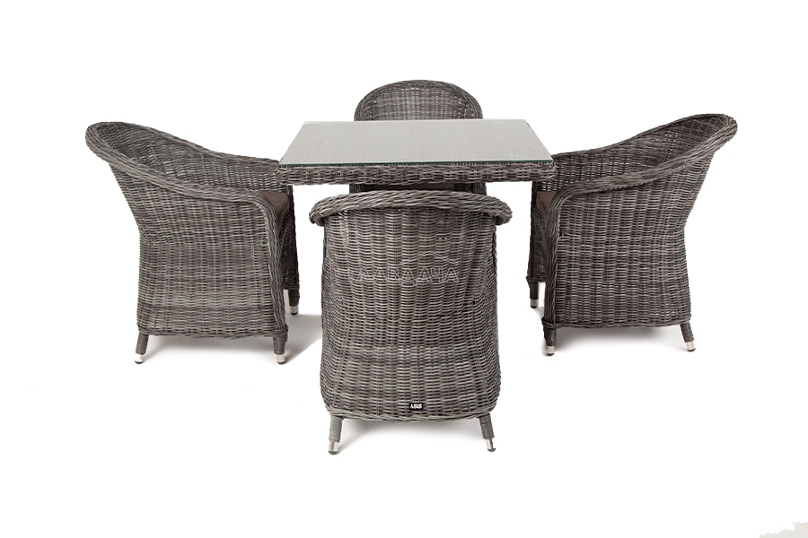 Уличная обеденная группа «Фредо» для обустройства зоны отдыха. Комплект состоит из: квадратного обеденного стола «Айриш» - 900×900×750 мм и 4 кресел «Равенна» - 570×680×810 мм в графитовом цвете.