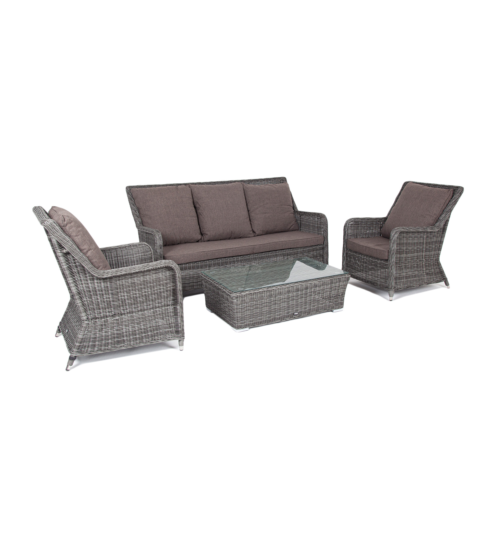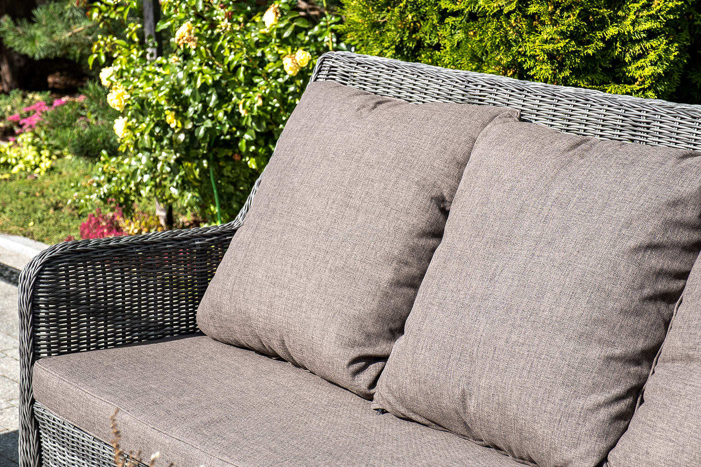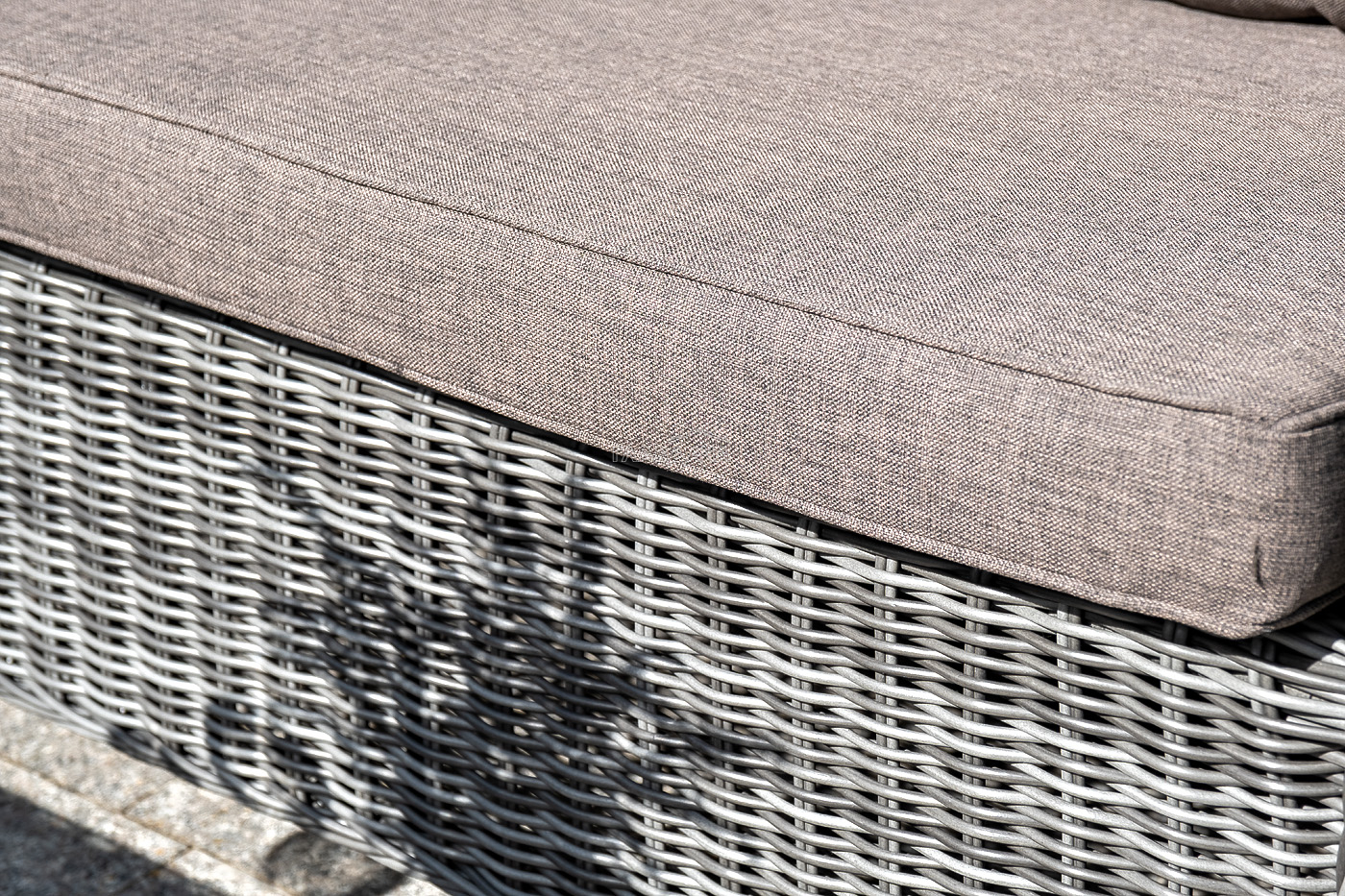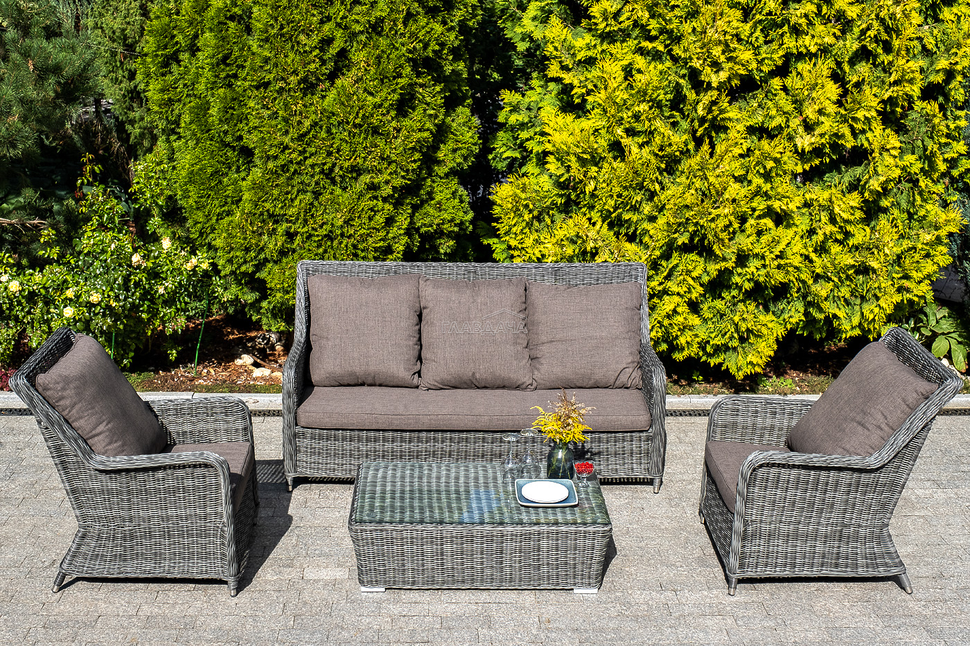 Плетеная мебель дополнена удобными подушками в серых чехлах. При их изготовлении используют полиэстер, плотность – 300гр/м2. Он обрабатывается влагоотталкивающей пропиткой для повышения защитных свойств материала.