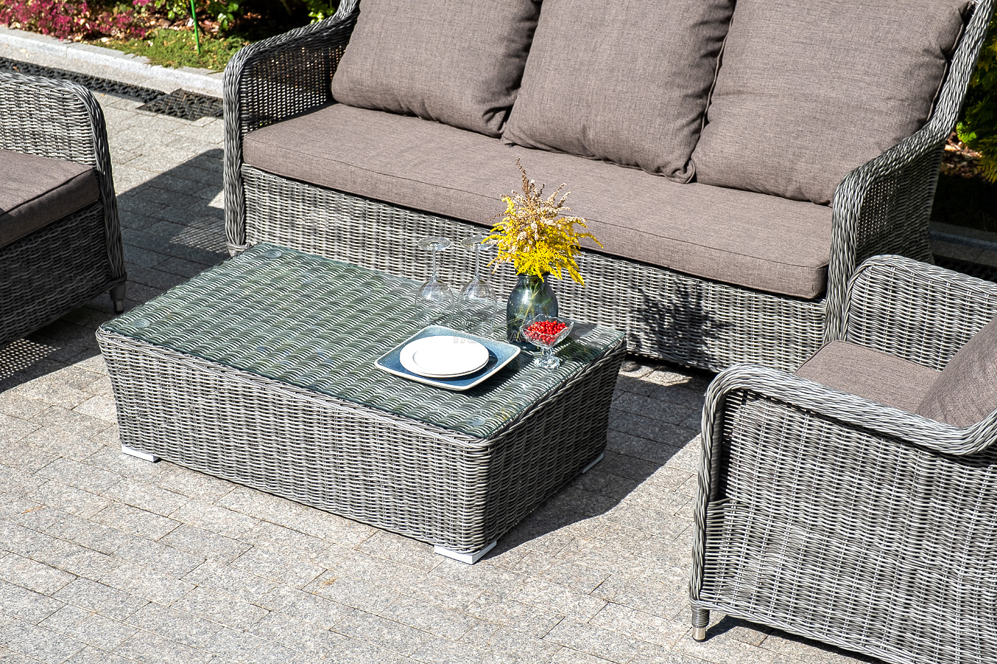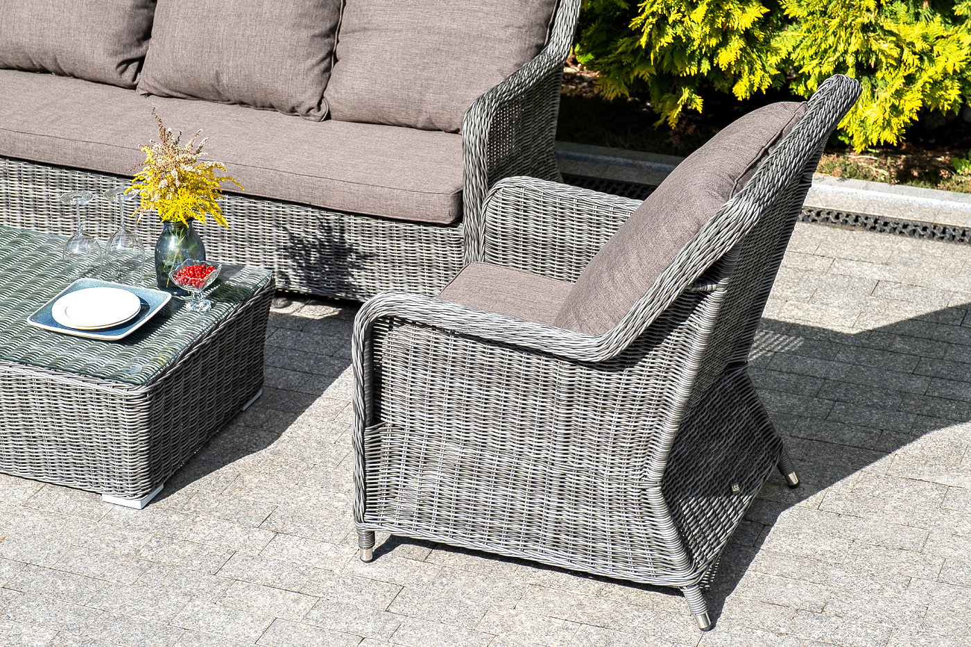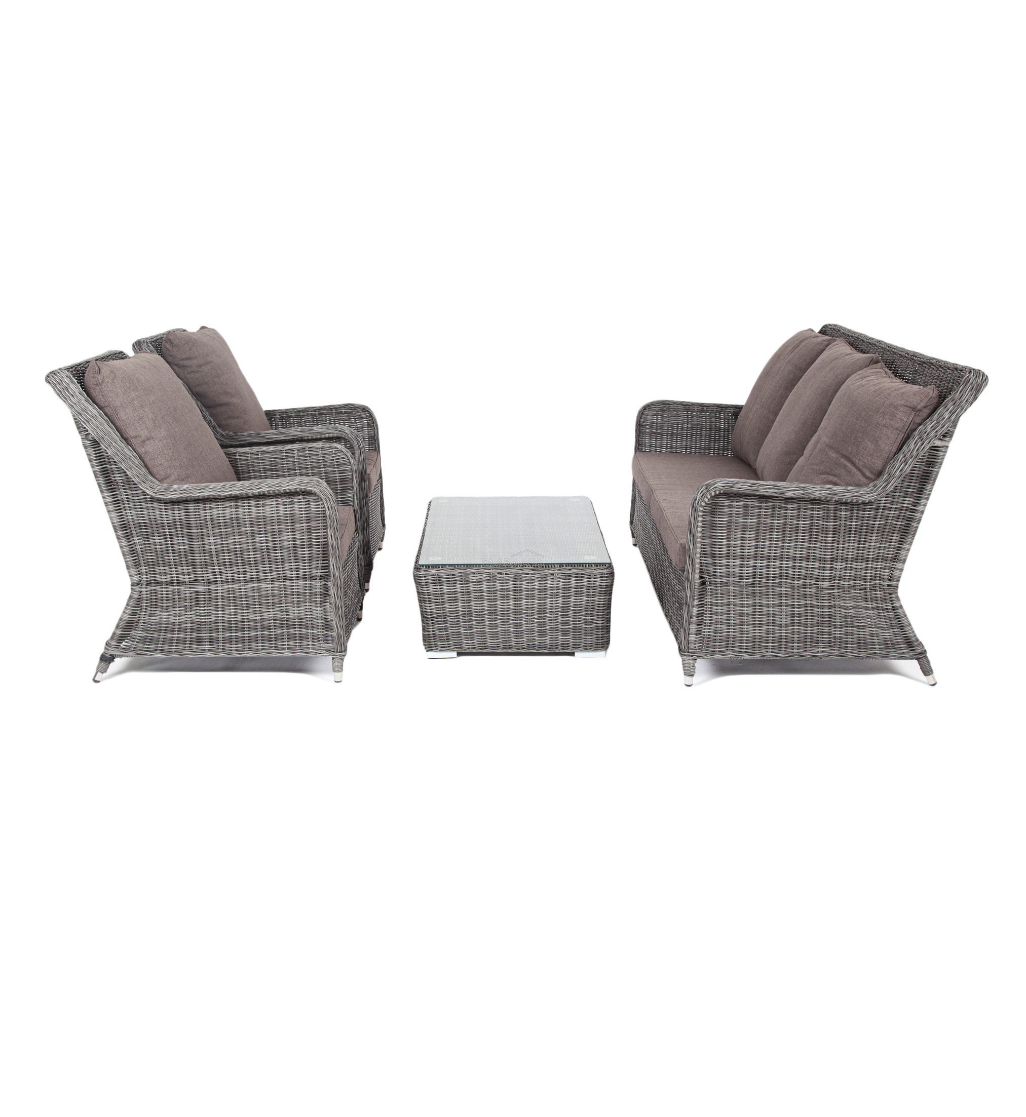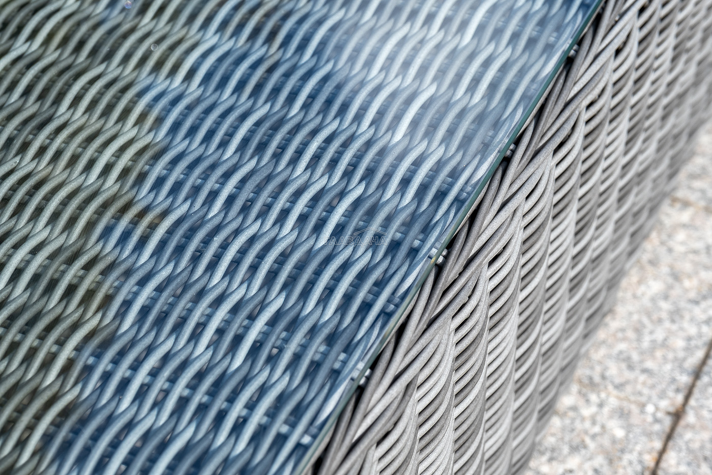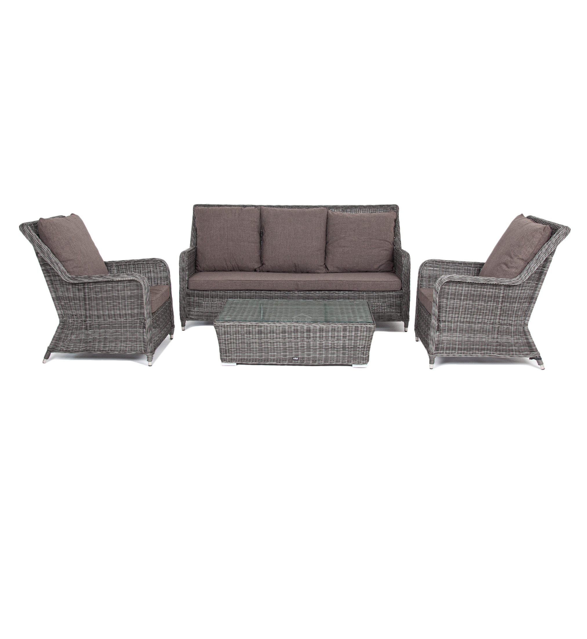 Плетеная мебель дополнена удобными подушками в серых чехлах. При их изготовлении используют полиэстер, плотность – 300гр/м2. Он обрабатывается влагоотталкивающей пропиткой для повышения защитных свойств материала.