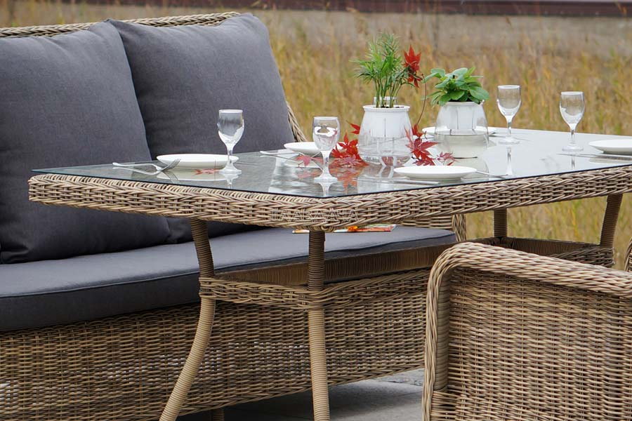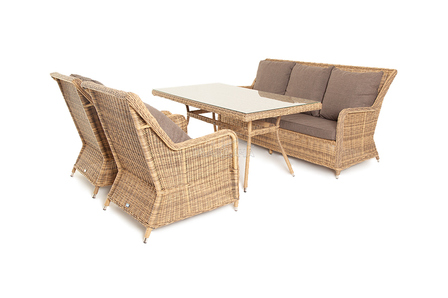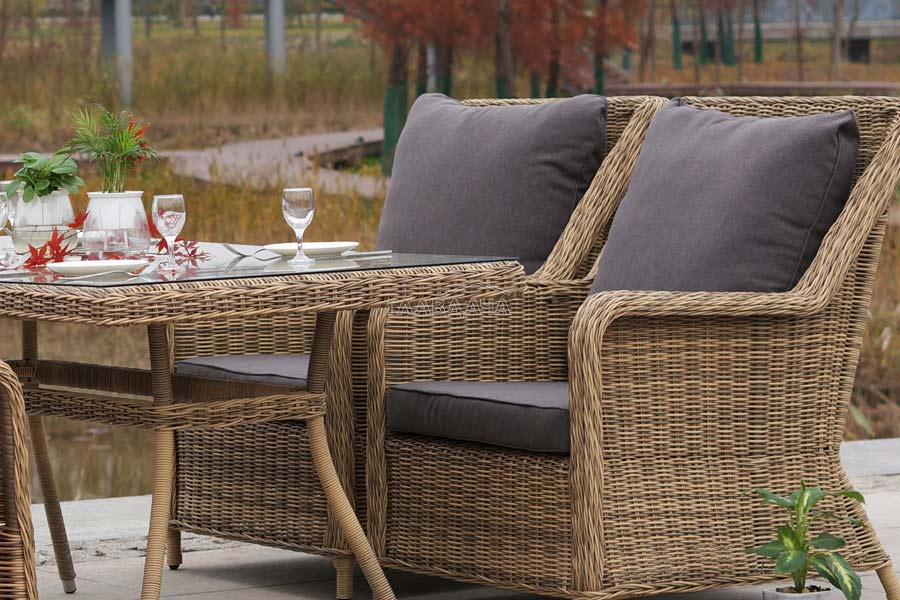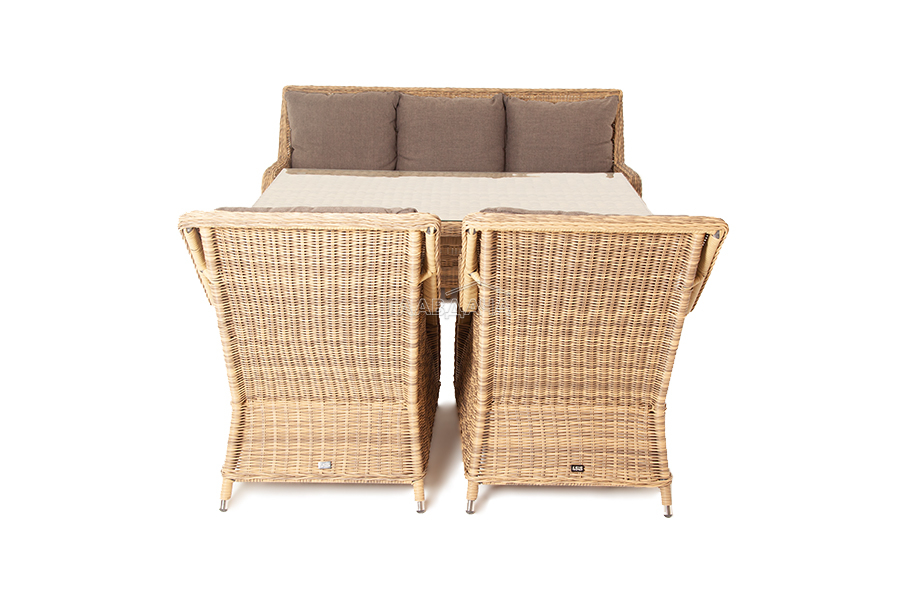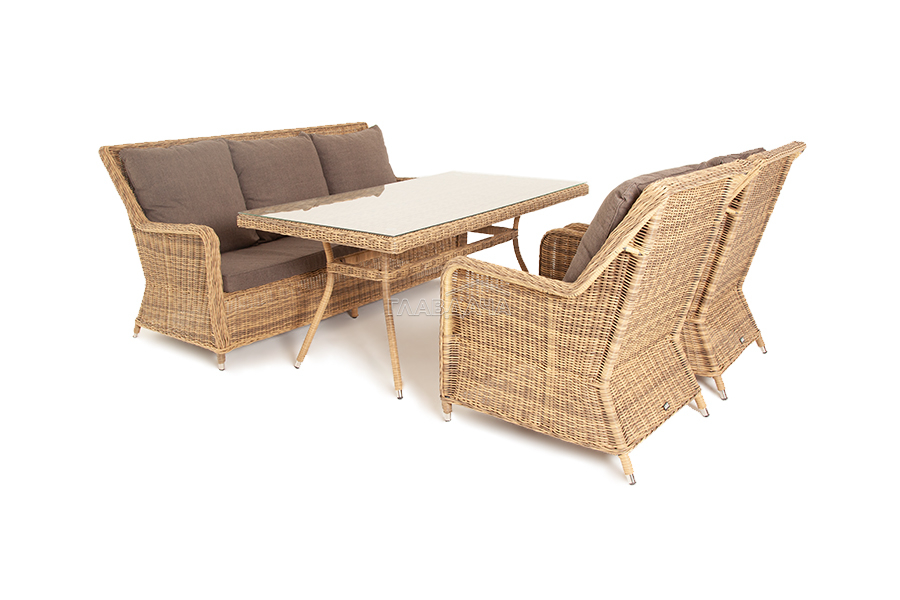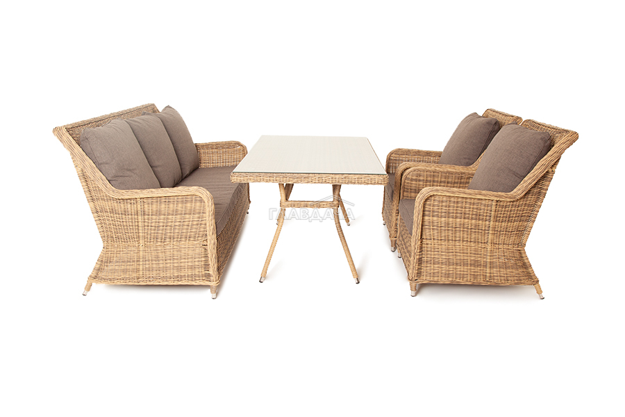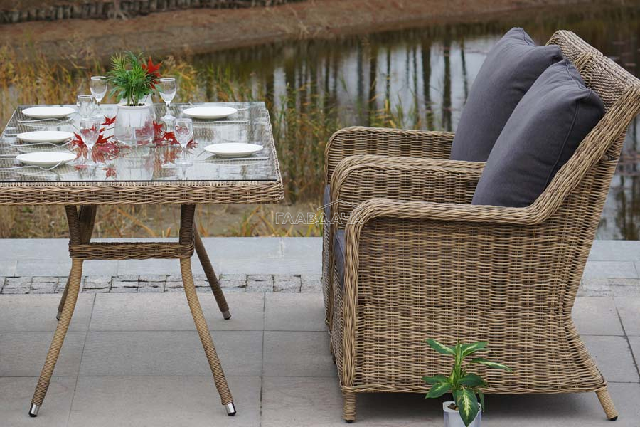 Каркас мебели алюминиевый. Он оформлен с помощью искусственного ротанга круглой формы и был оплетен ручным способом. Цвет плетение - соломенный.