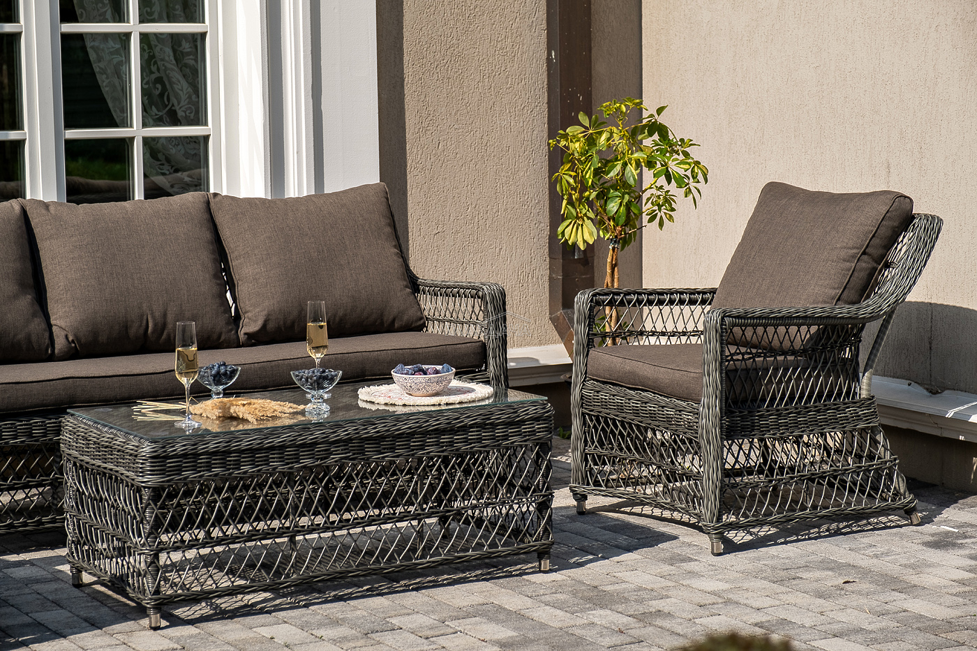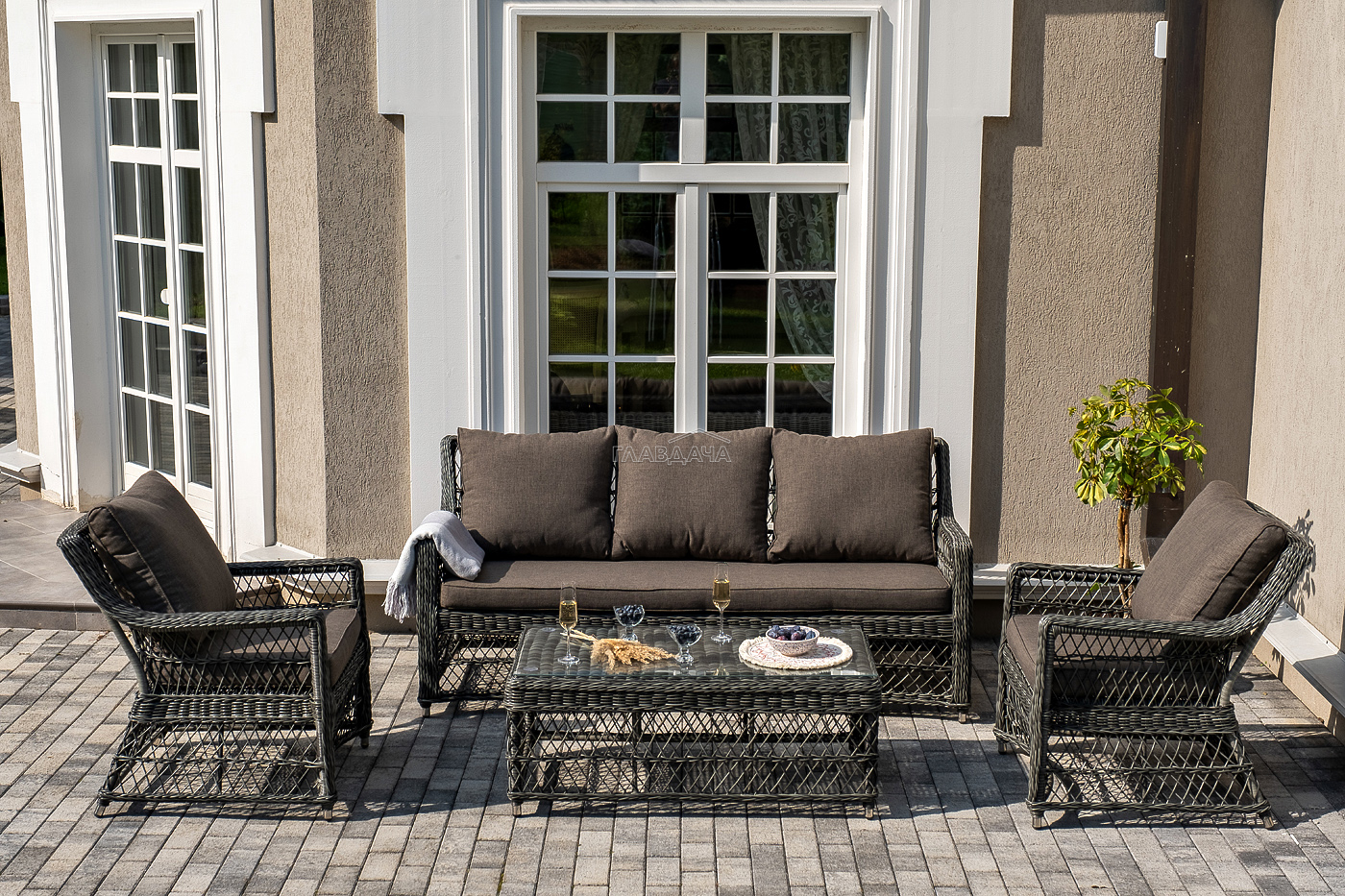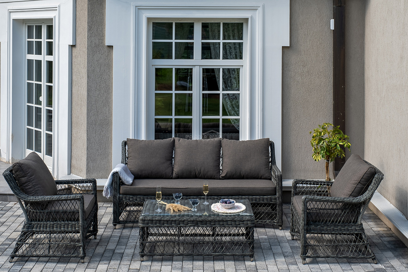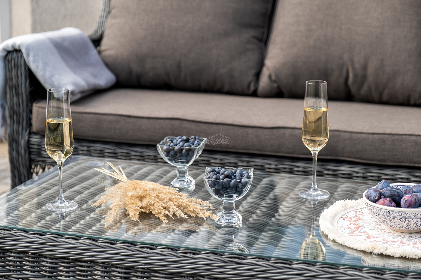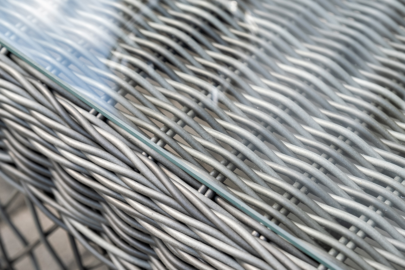 Уличная мебель имеет алюминиевый каркас с ручным плетением из искусственного ротанга в цвете "графит". Предусмотрены мягкие подушки из полиэстера серого цвета с плотностью 300гр/м2. Они имеет влагоотталкивающую пропитку. Рабочая поверхность столика изготовлена из закаленного стекла толщиной 5 мм.