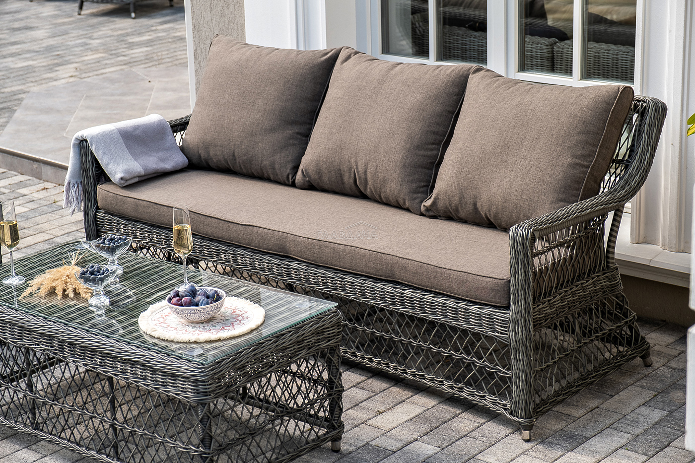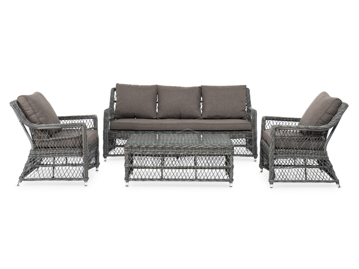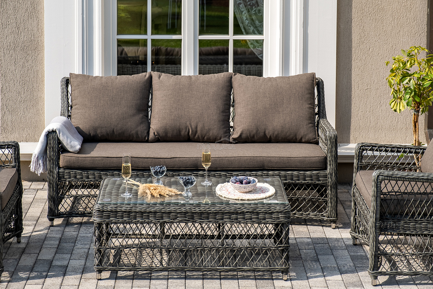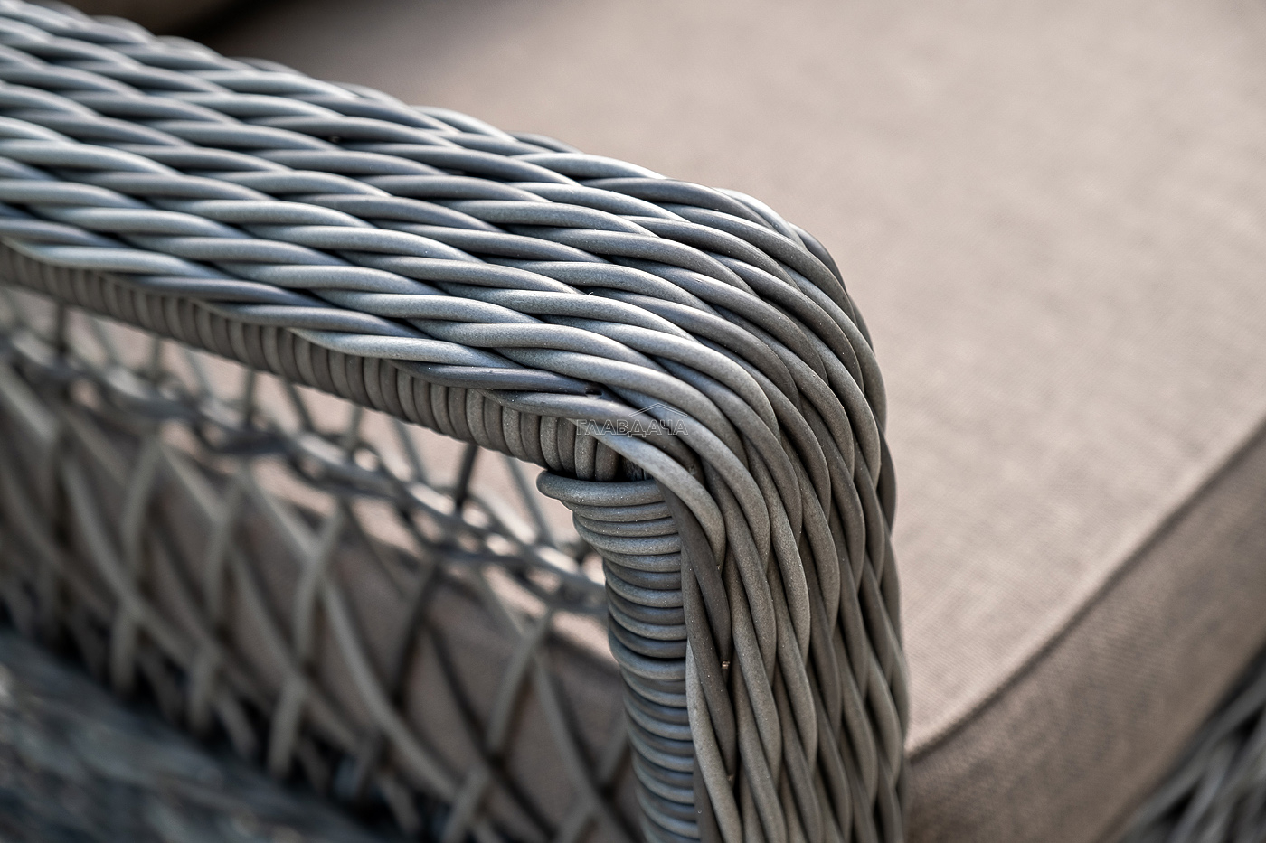 Уличная мебель имеет алюминиевый каркас с ручным плетением из искусственного ротанга в цвете "графит". Предусмотрены мягкие подушки из полиэстера серого цвета с плотностью 300гр/м2. Они имеет влагоотталкивающую пропитку. Рабочая поверхность столика изготовлена из закаленного стекла толщиной 5 мм.