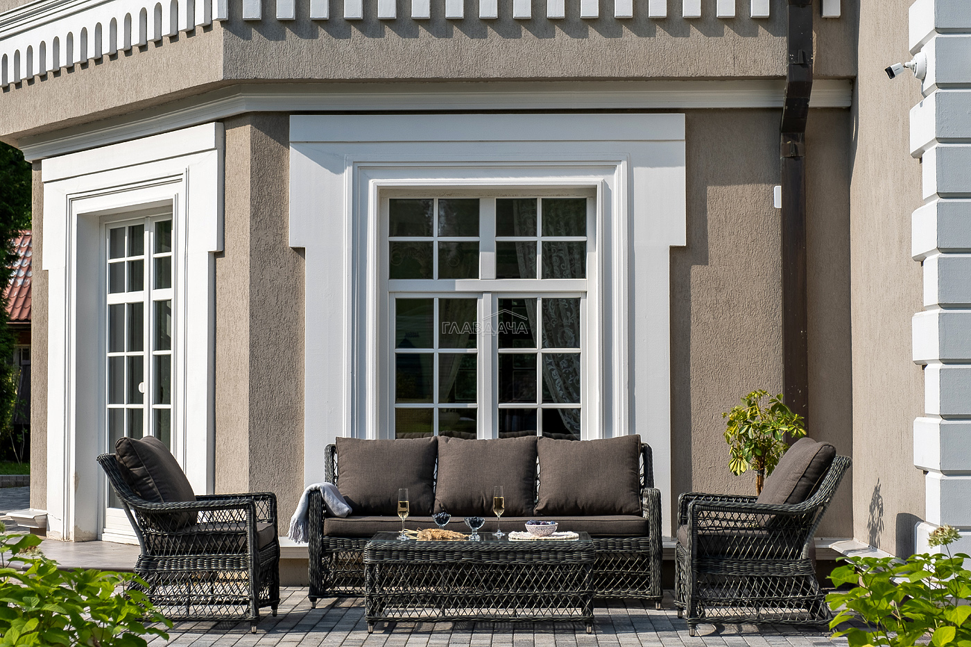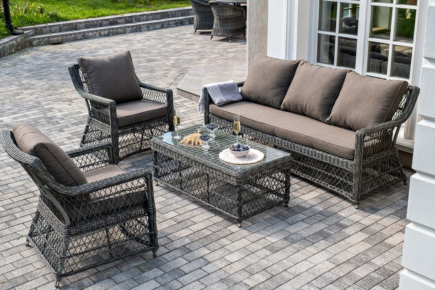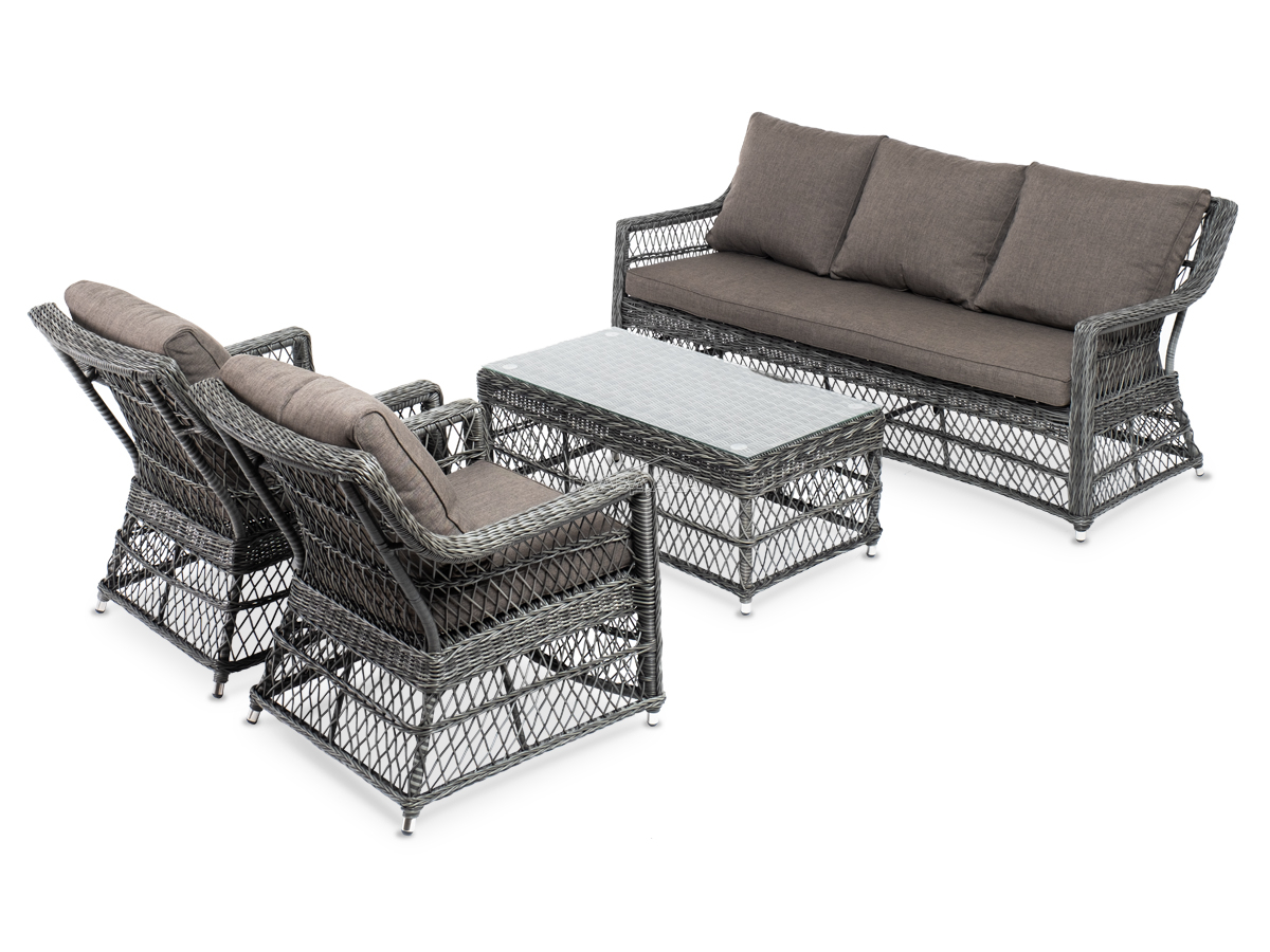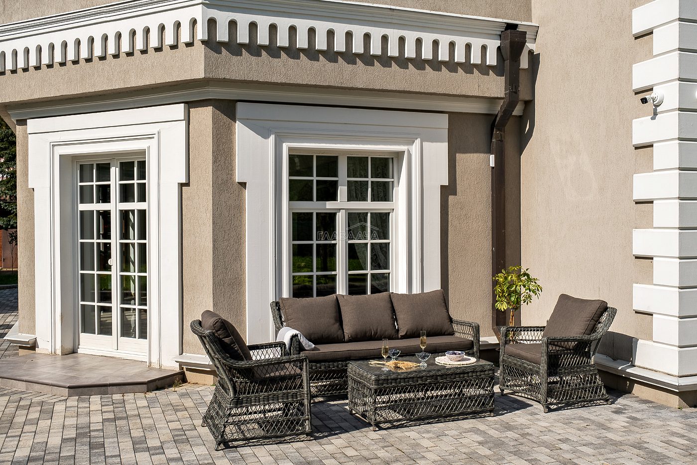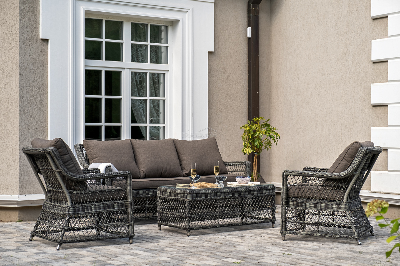 Уличная мебель имеет алюминиевый каркас с ручным плетением из искусственного ротанга в цвете "графит". Предусмотрены мягкие подушки из полиэстера серого цвета с плотностью 300гр/м2. Они имеет влагоотталкивающую пропитку. Рабочая поверхность столика изготовлена из закаленного стекла толщиной 5 мм.