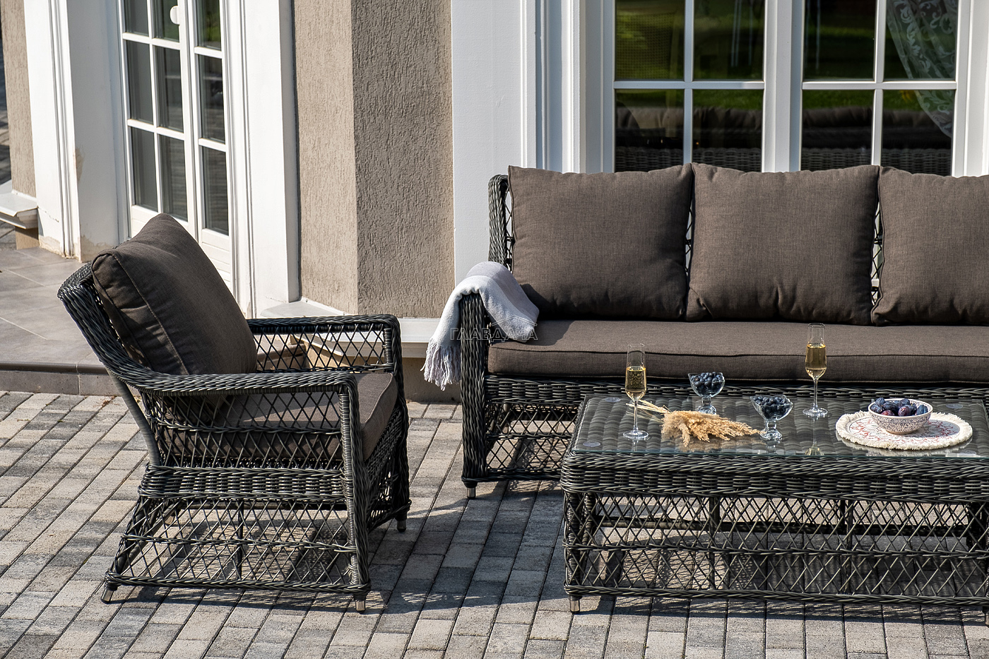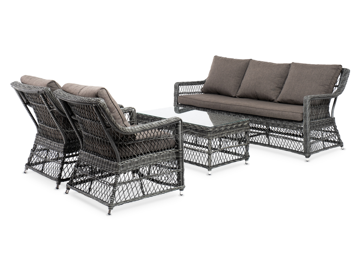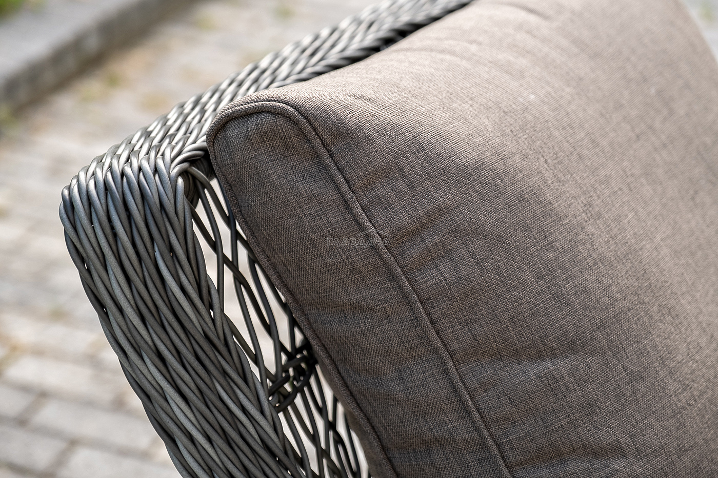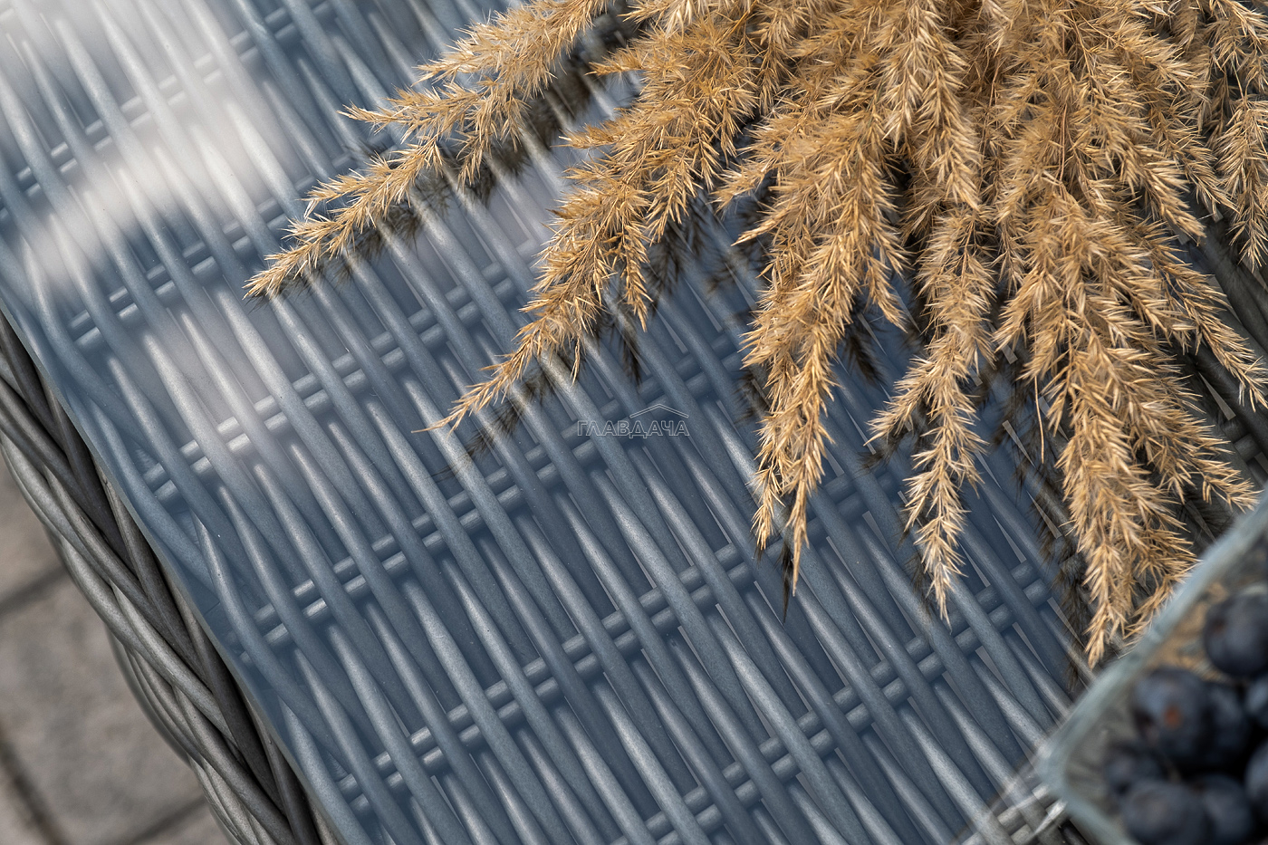 Уличная мебель имеет алюминиевый каркас с ручным плетением из искусственного ротанга в цвете "графит". Предусмотрены мягкие подушки из полиэстера серого цвета с плотностью 300гр/м2. Они имеет влагоотталкивающую пропитку. Рабочая поверхность столика изготовлена из закаленного стекла толщиной 5 мм.