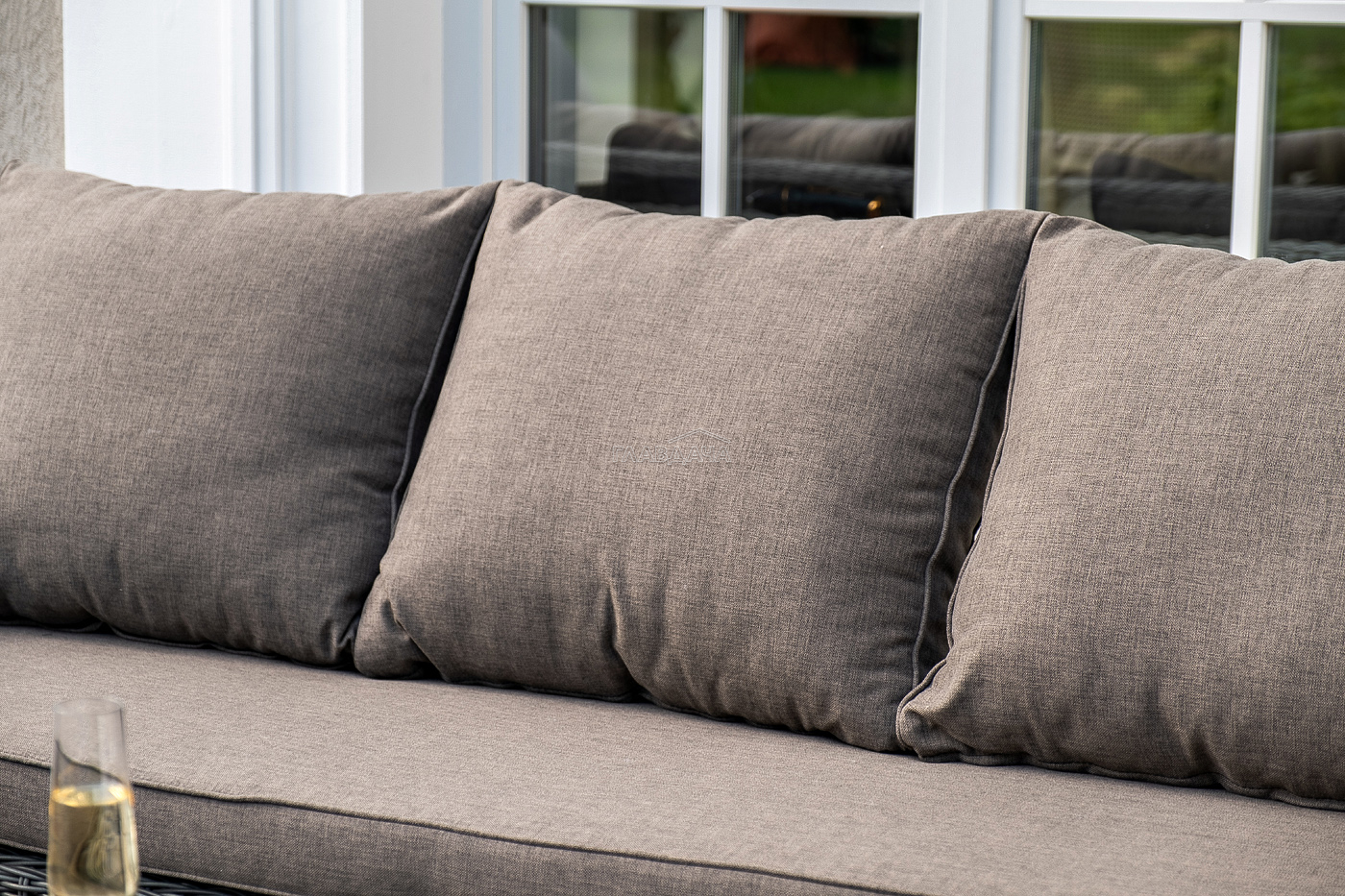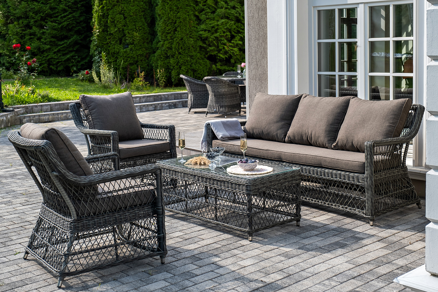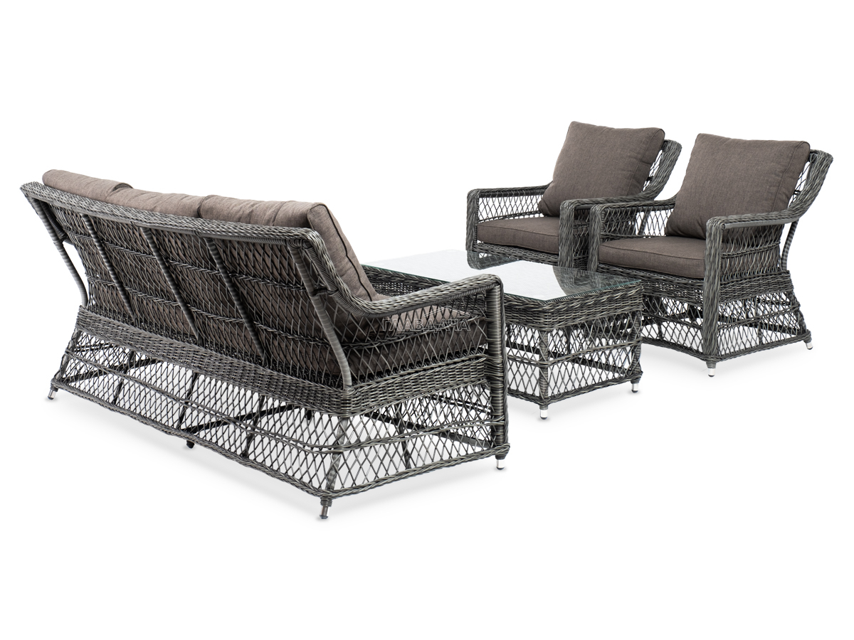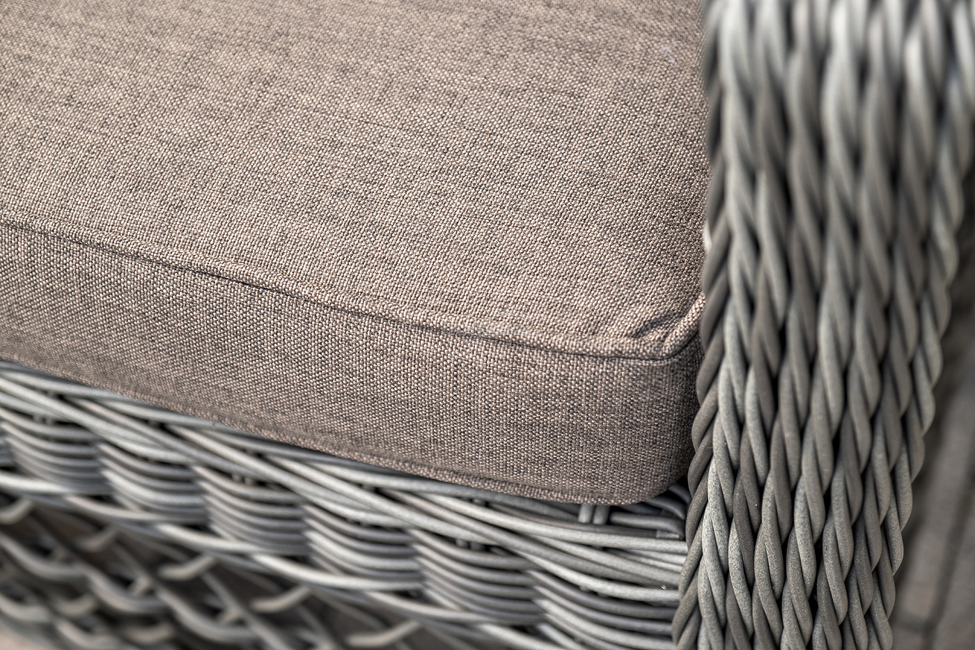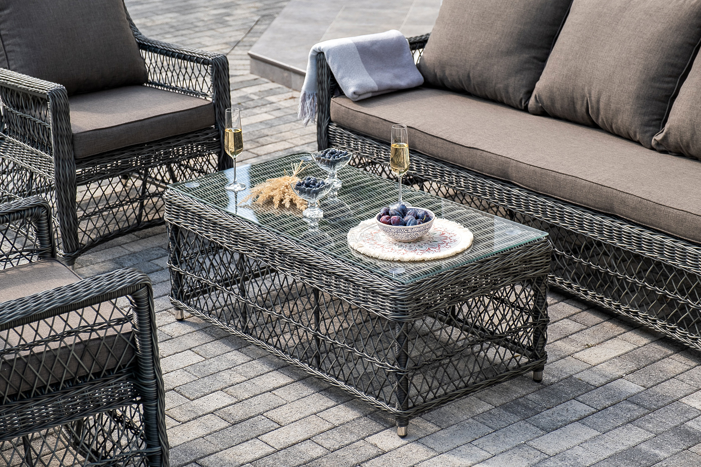 Уличная мебель имеет алюминиевый каркас с ручным плетением из искусственного ротанга в цвете "графит". Предусмотрены мягкие подушки из полиэстера серого цвета с плотностью 300гр/м2. Они имеет влагоотталкивающую пропитку. Рабочая поверхность столика изготовлена из закаленного стекла толщиной 5 мм.