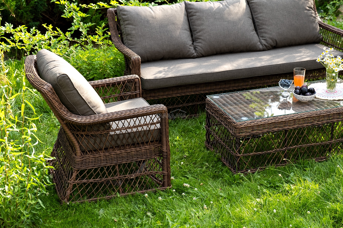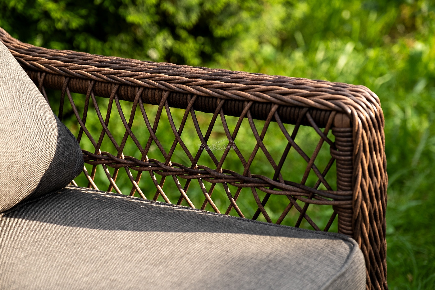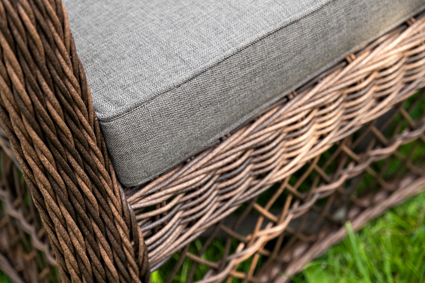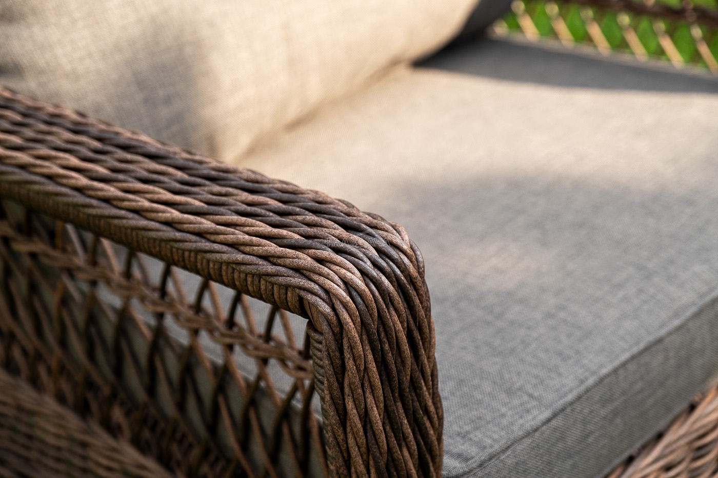 Уличная мебель имеет алюминиевый каркас, ручное плетение, сделанное из коричневого искусственного ротанга. Предусмотрены мягкие подушки из полиэстера серого цвета с плотностью 300гр/м2. Они имеет влагоотталкивающую пропитку. Рабочая поверхность столика изготовлена из закаленного стекла толщиной 5 мм.