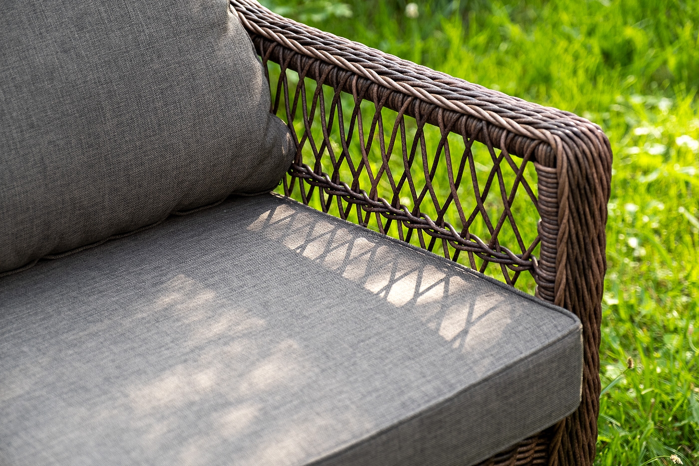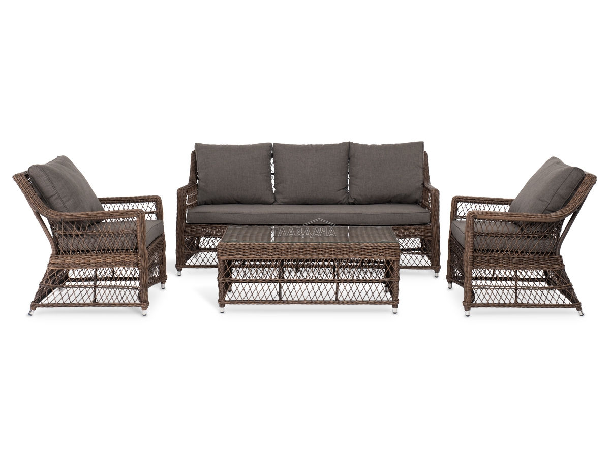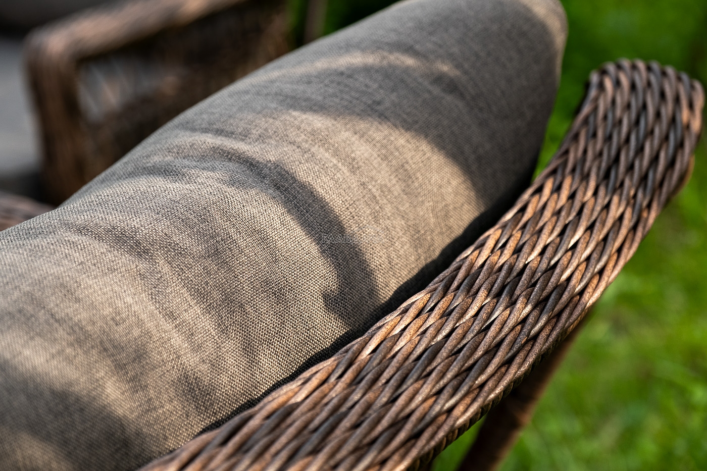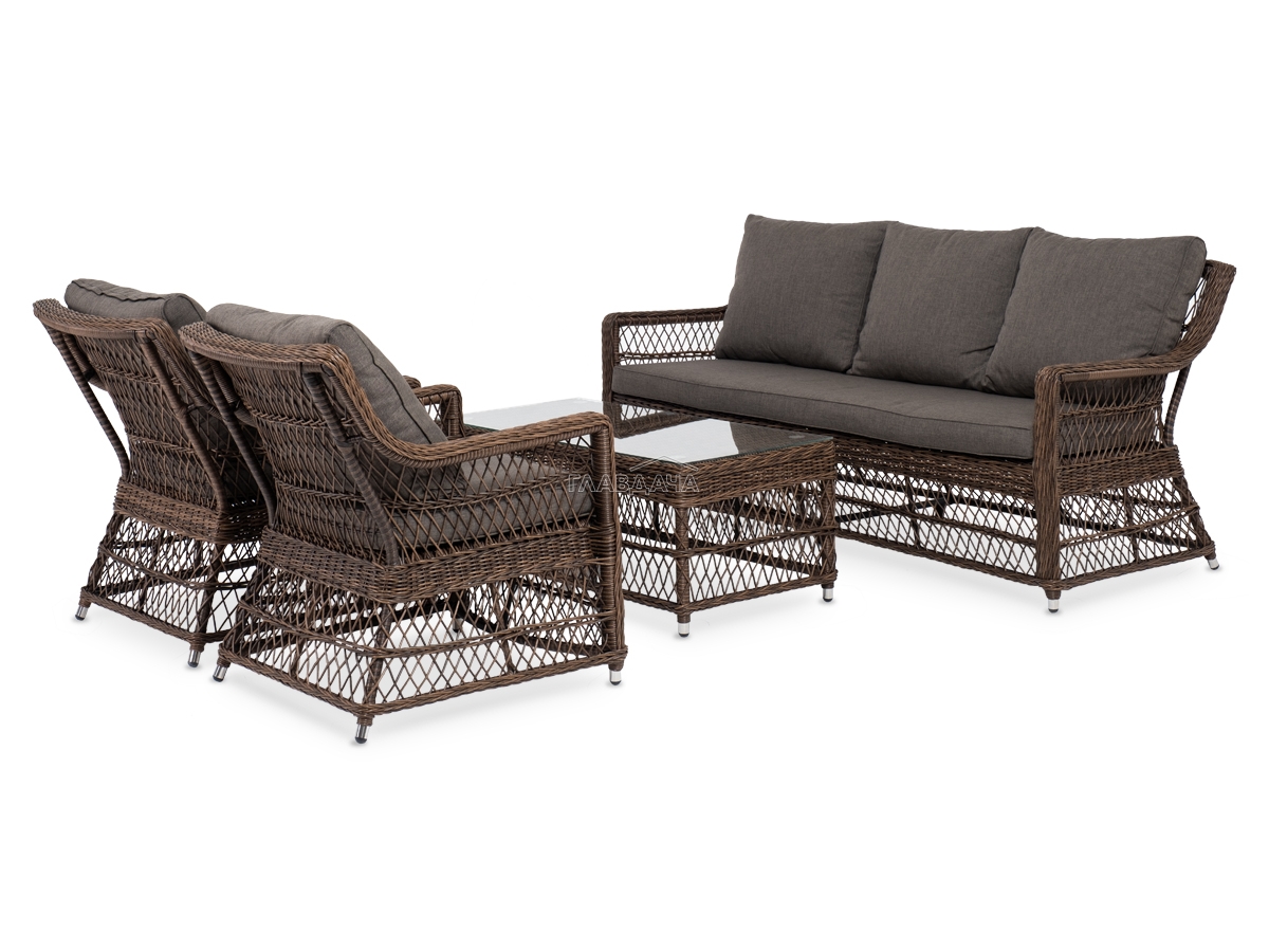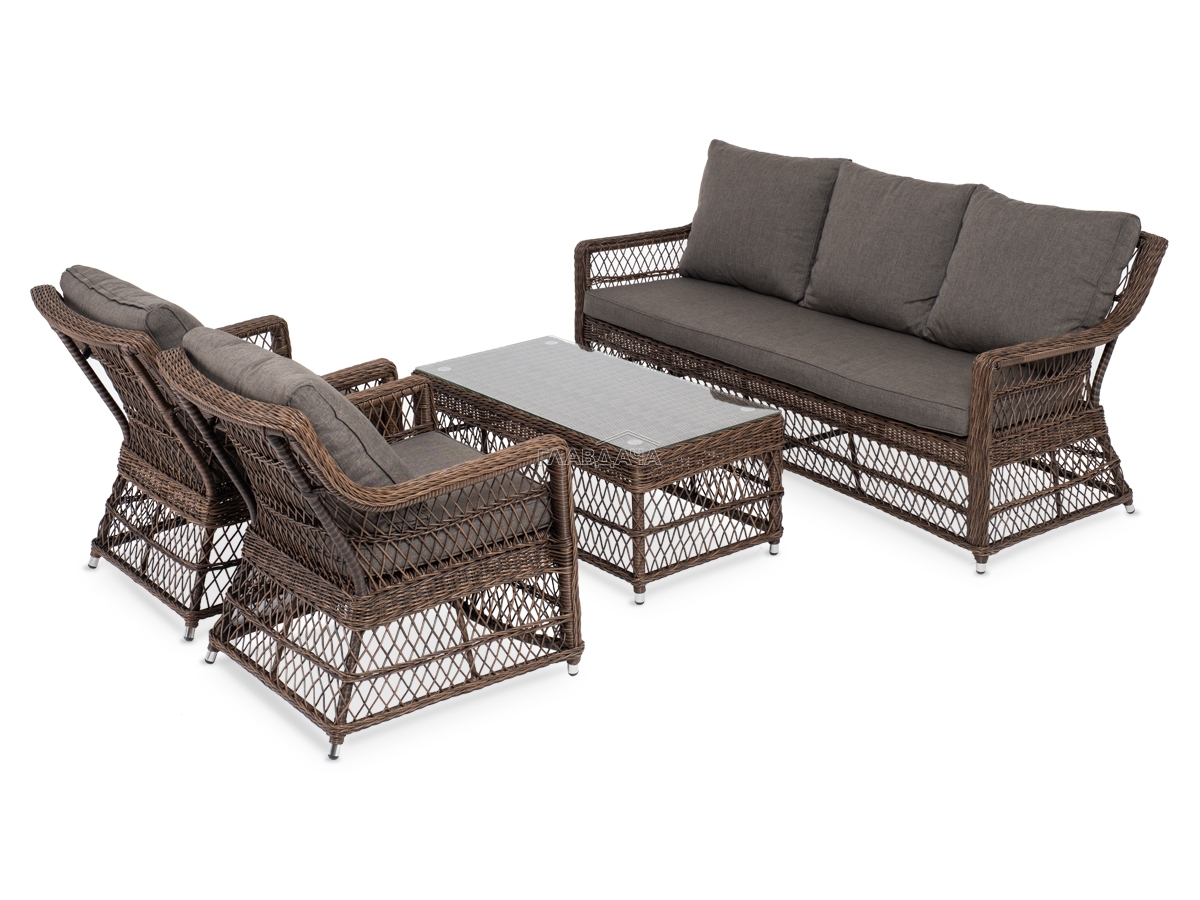 Уличная мебель имеет алюминиевый каркас, ручное плетение, сделанное из коричневого искусственного ротанга. Предусмотрены мягкие подушки из полиэстера серого цвета с плотностью 300гр/м2. Они имеет влагоотталкивающую пропитку. Рабочая поверхность столика изготовлена из закаленного стекла толщиной 5 мм.