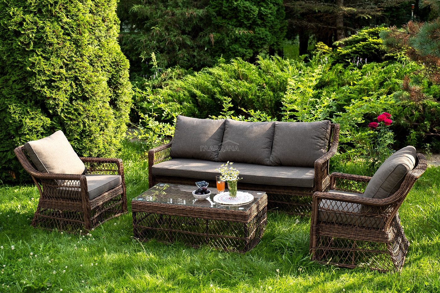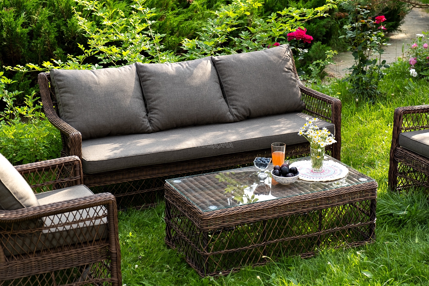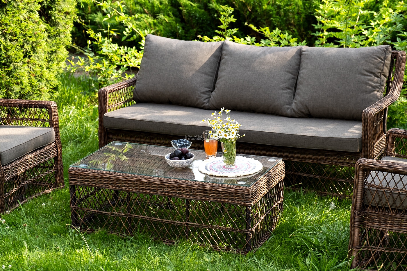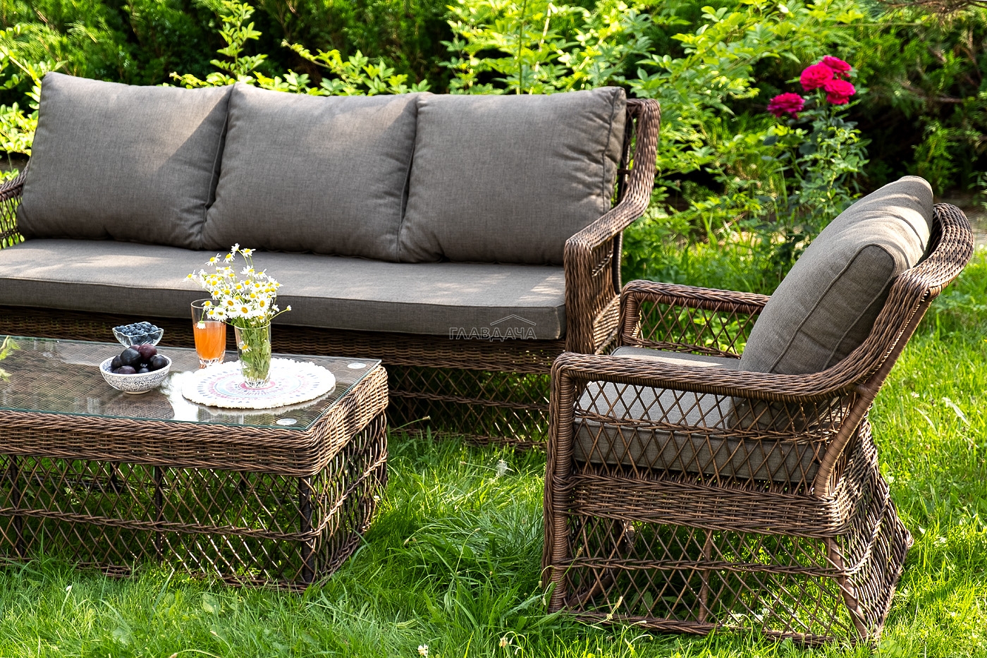Уличная мебель имеет алюминиевый каркас, ручное плетение, сделанное из коричневого искусственного ротанга. Предусмотрены мягкие подушки из полиэстера серого цвета с плотностью 300гр/м2. Они имеет влагоотталкивающую пропитку. Рабочая поверхность столика изготовлена из закаленного стекла толщиной 5 мм.