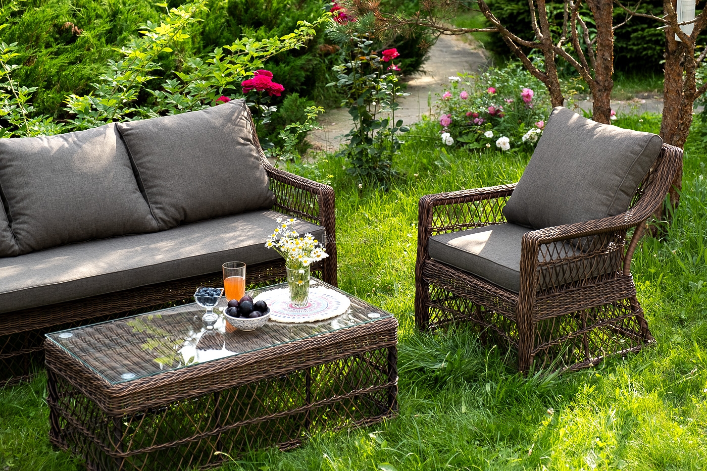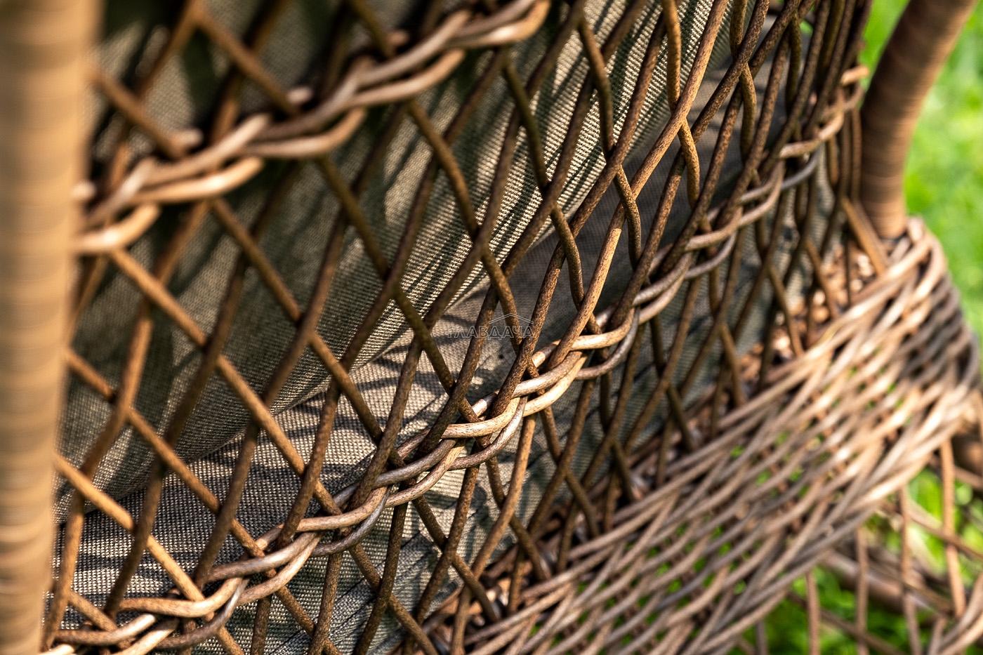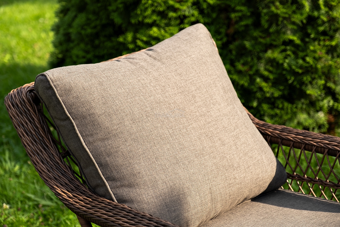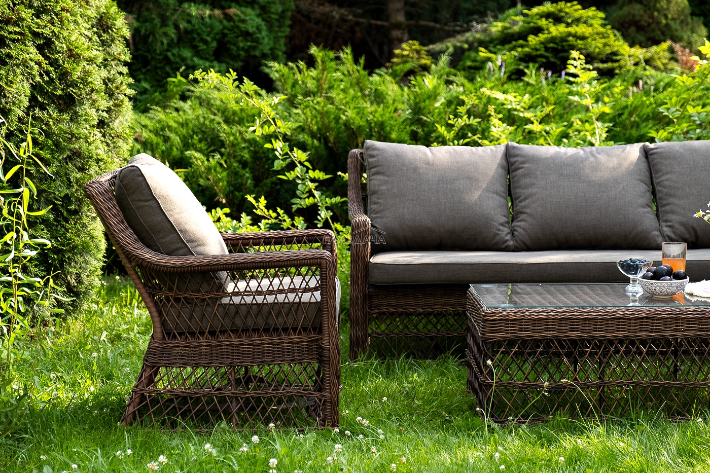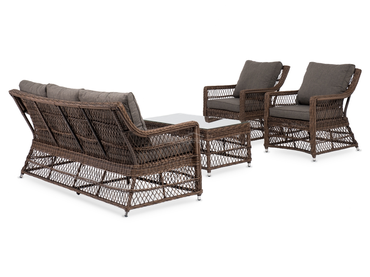 Уличная мебель имеет алюминиевый каркас, ручное плетение, сделанное из коричневого искусственного ротанга. Предусмотрены мягкие подушки из полиэстера серого цвета с плотностью 300гр/м2. Они имеет влагоотталкивающую пропитку. Рабочая поверхность столика изготовлена из закаленного стекла толщиной 5 мм.
