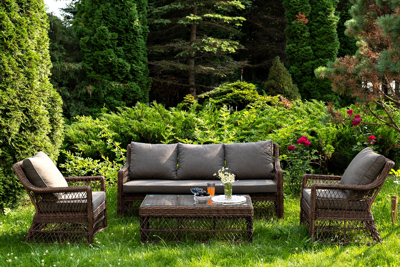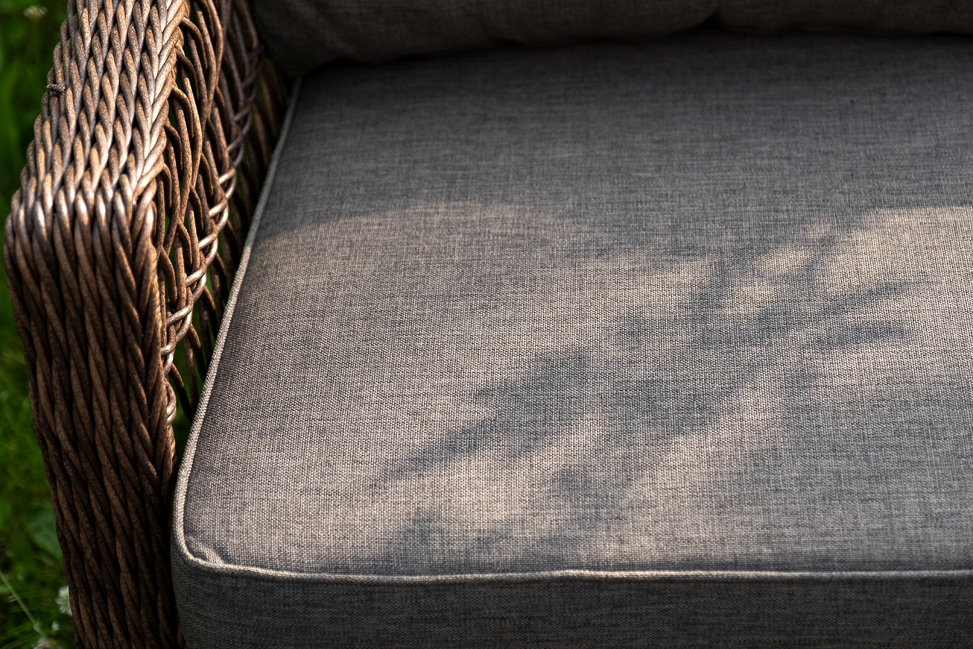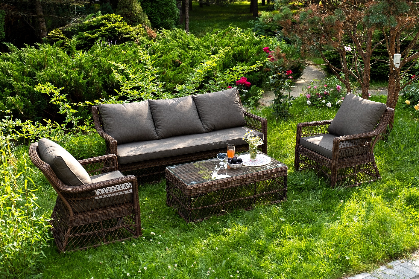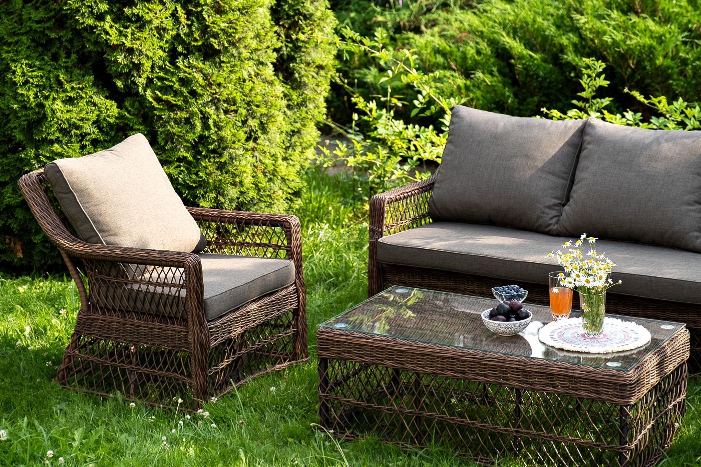 Уличная мебель имеет алюминиевый каркас, ручное плетение, сделанное из коричневого искусственного ротанга. Предусмотрены мягкие подушки из полиэстера серого цвета с плотностью 300гр/м2. Они имеет влагоотталкивающую пропитку. Рабочая поверхность столика изготовлена из закаленного стекла толщиной 5 мм.