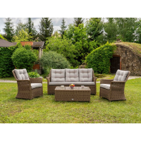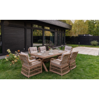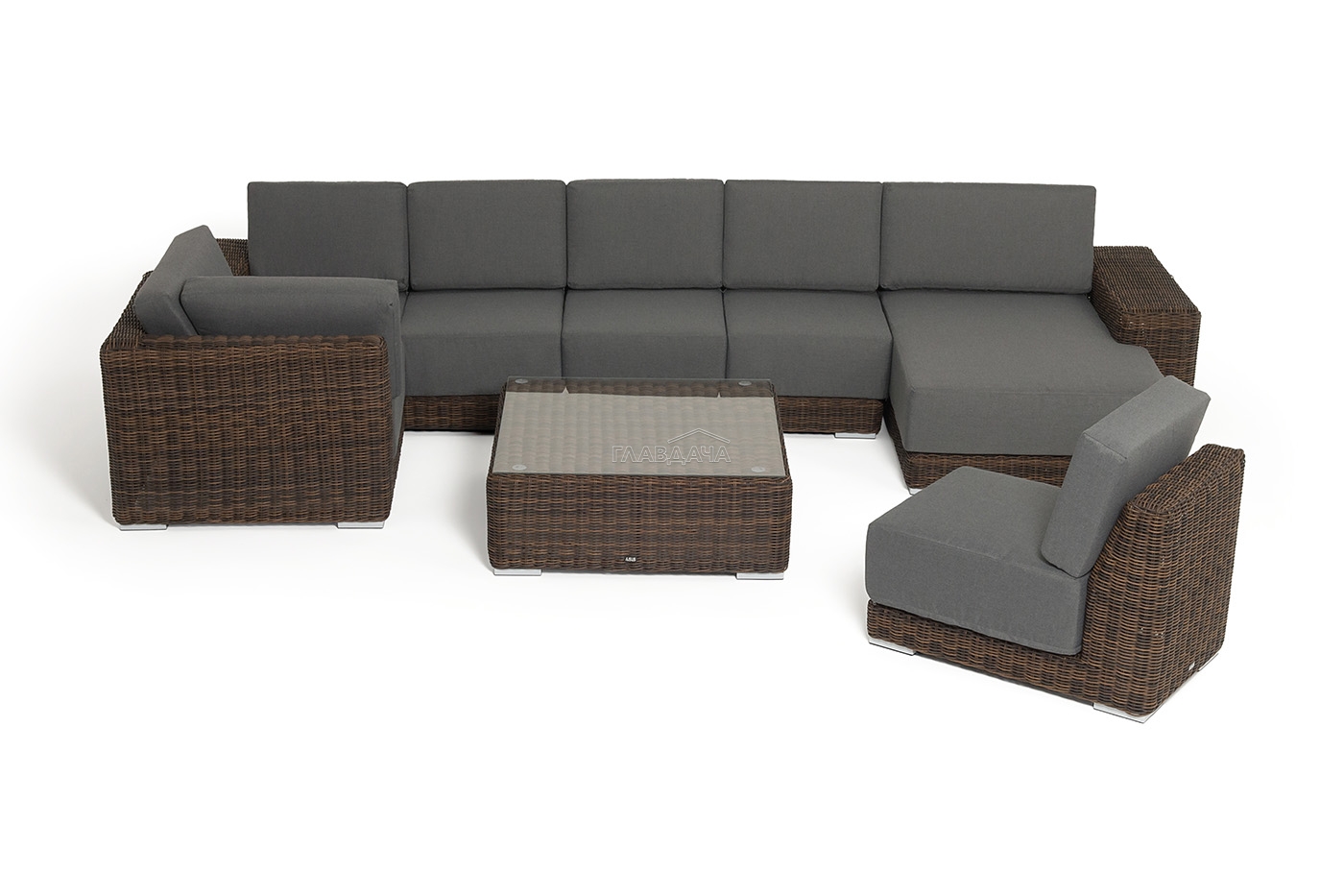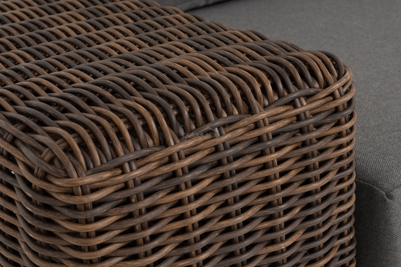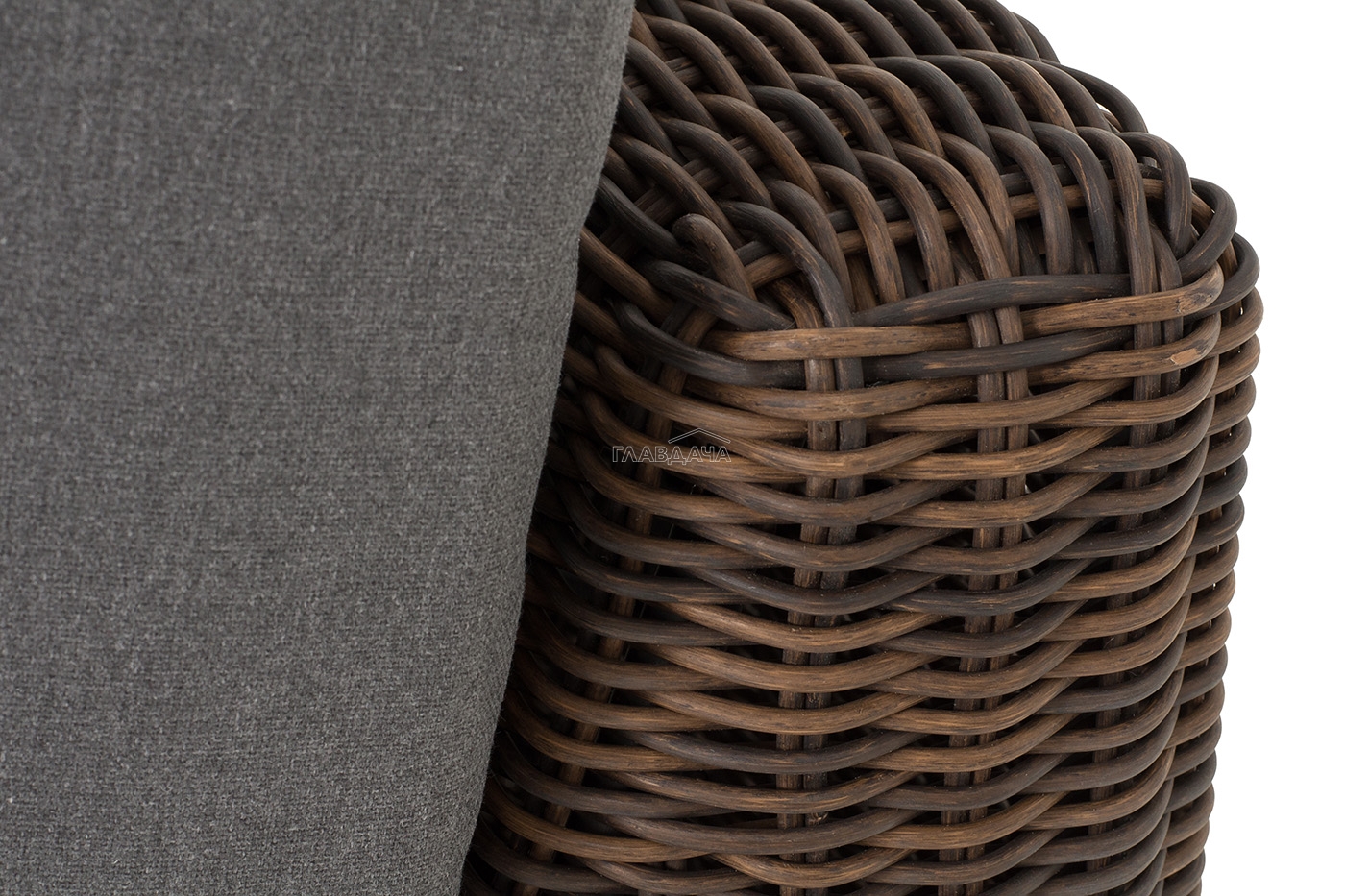При изготовлении каркаса всех составляющих комплекта используется высокопрочный алюминий. Он дополнен круглым плетением из искусственного ротанга. Цвет – коричневый.