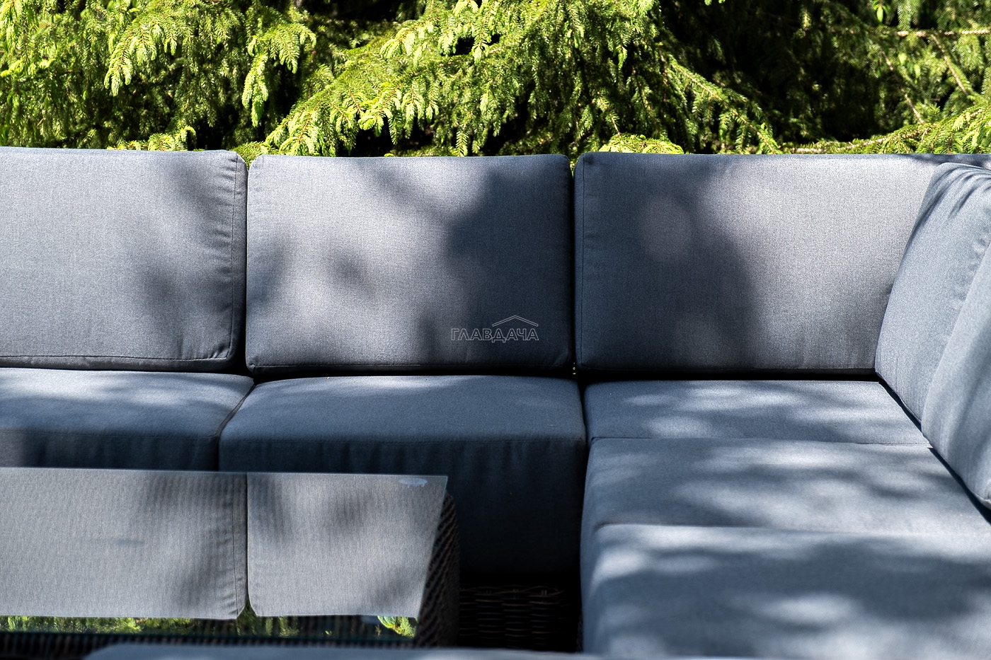 Модули дивана и кушетка укомплектованы подушками со съемными чехлами серого цвета. Они состоят из полиэстера с плотностью 300гр/м2. Защитные качества материала усилены путем его обработки влагоотталкивающими составами.