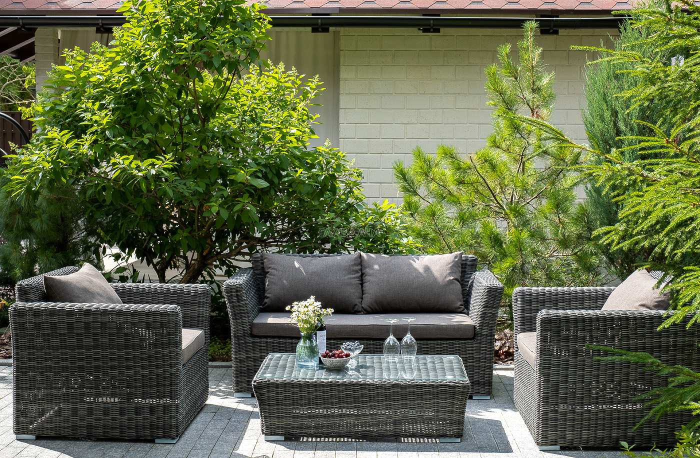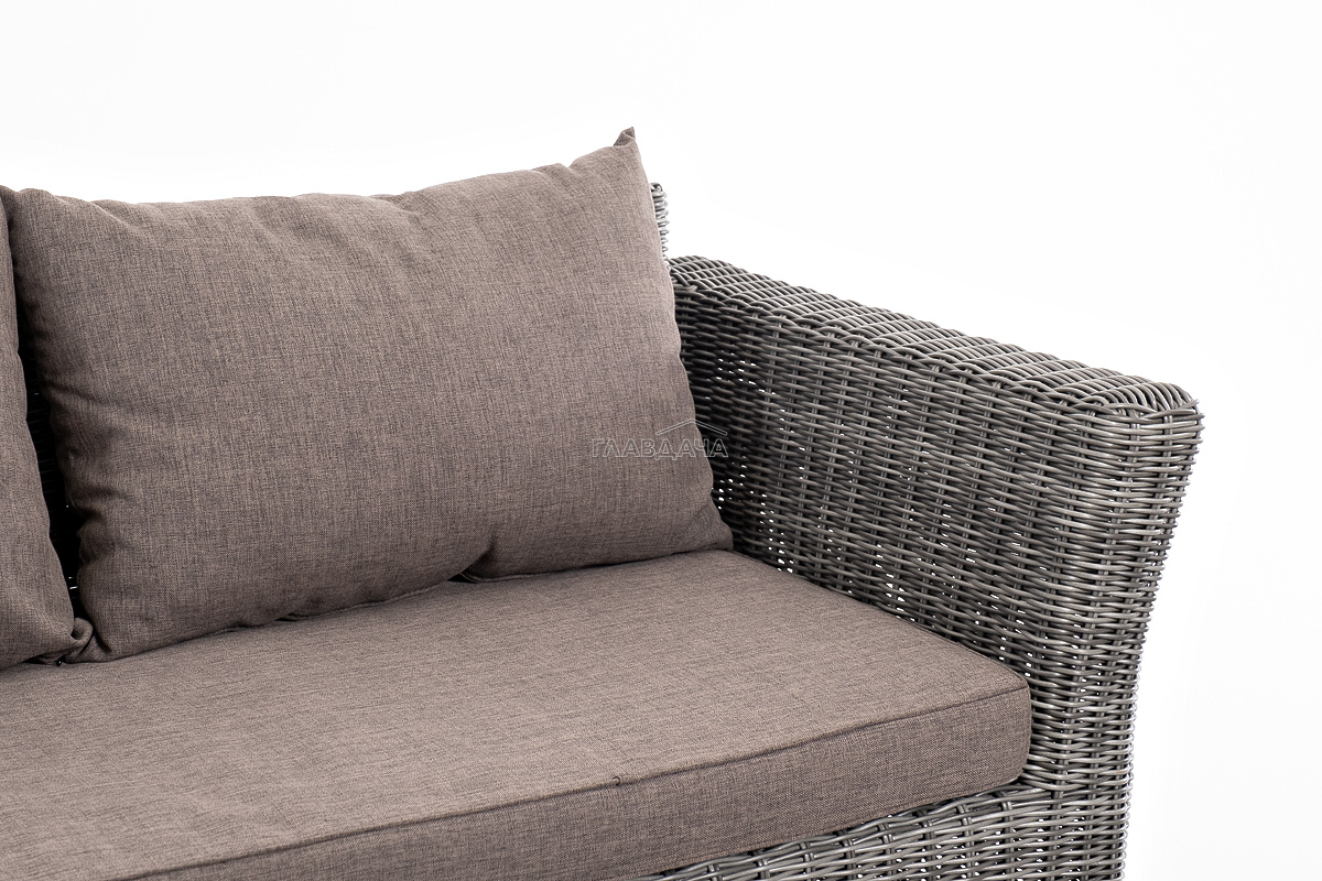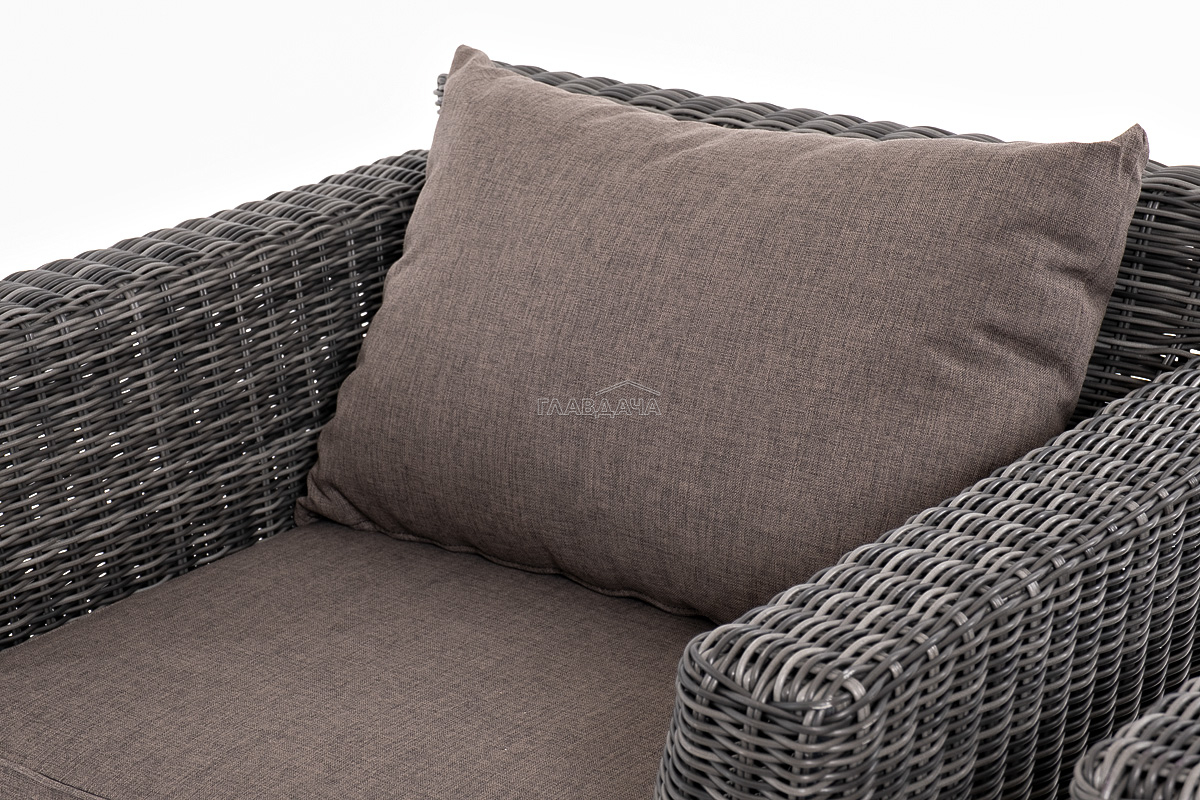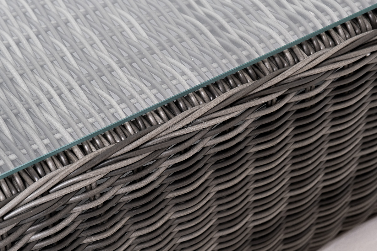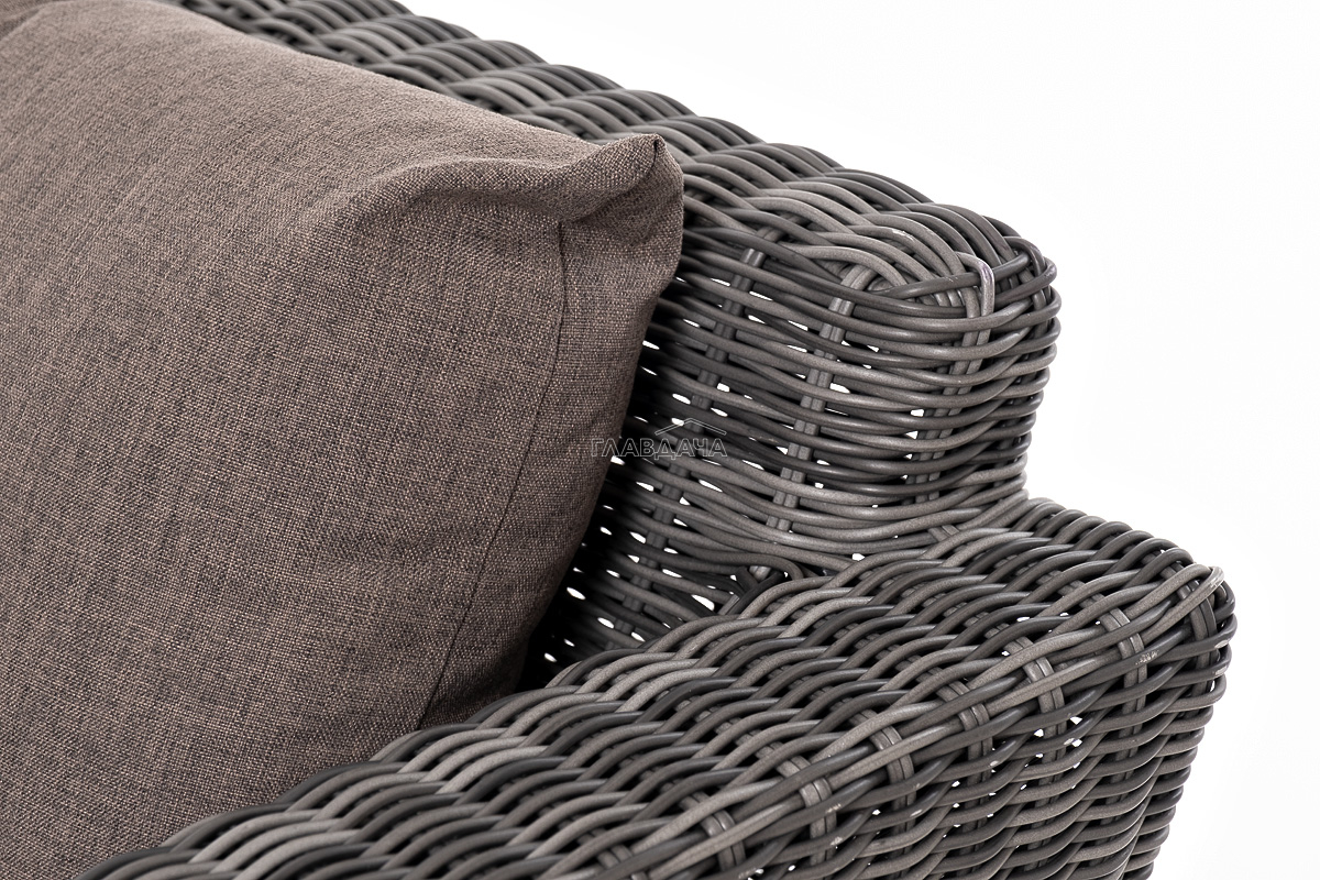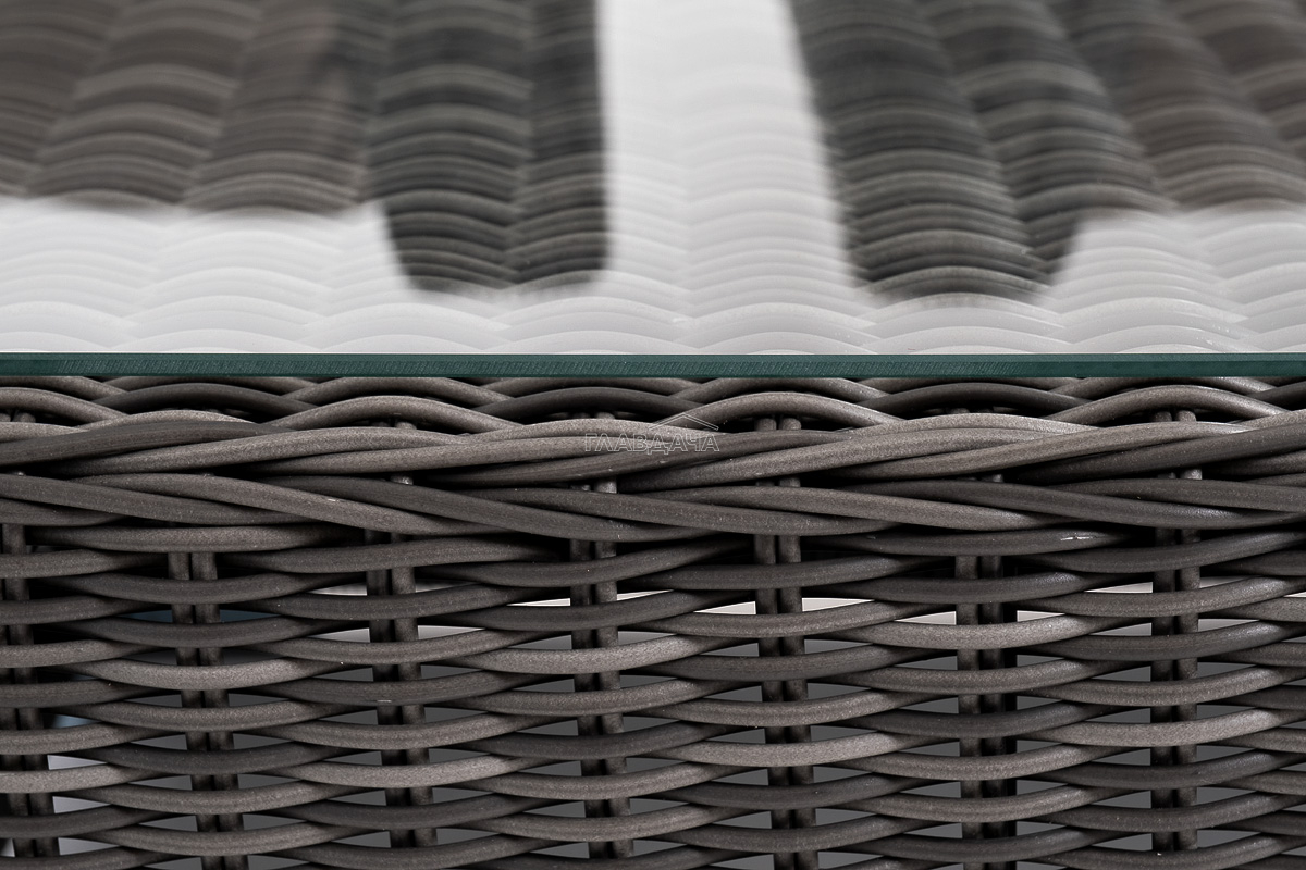 Прочный алюминиевый каркас усиливает устойчивость мебели. Его дополняет плетение в цвете "графит", которое представлено из круглого искусственного ротанга.