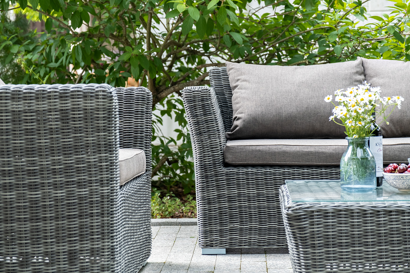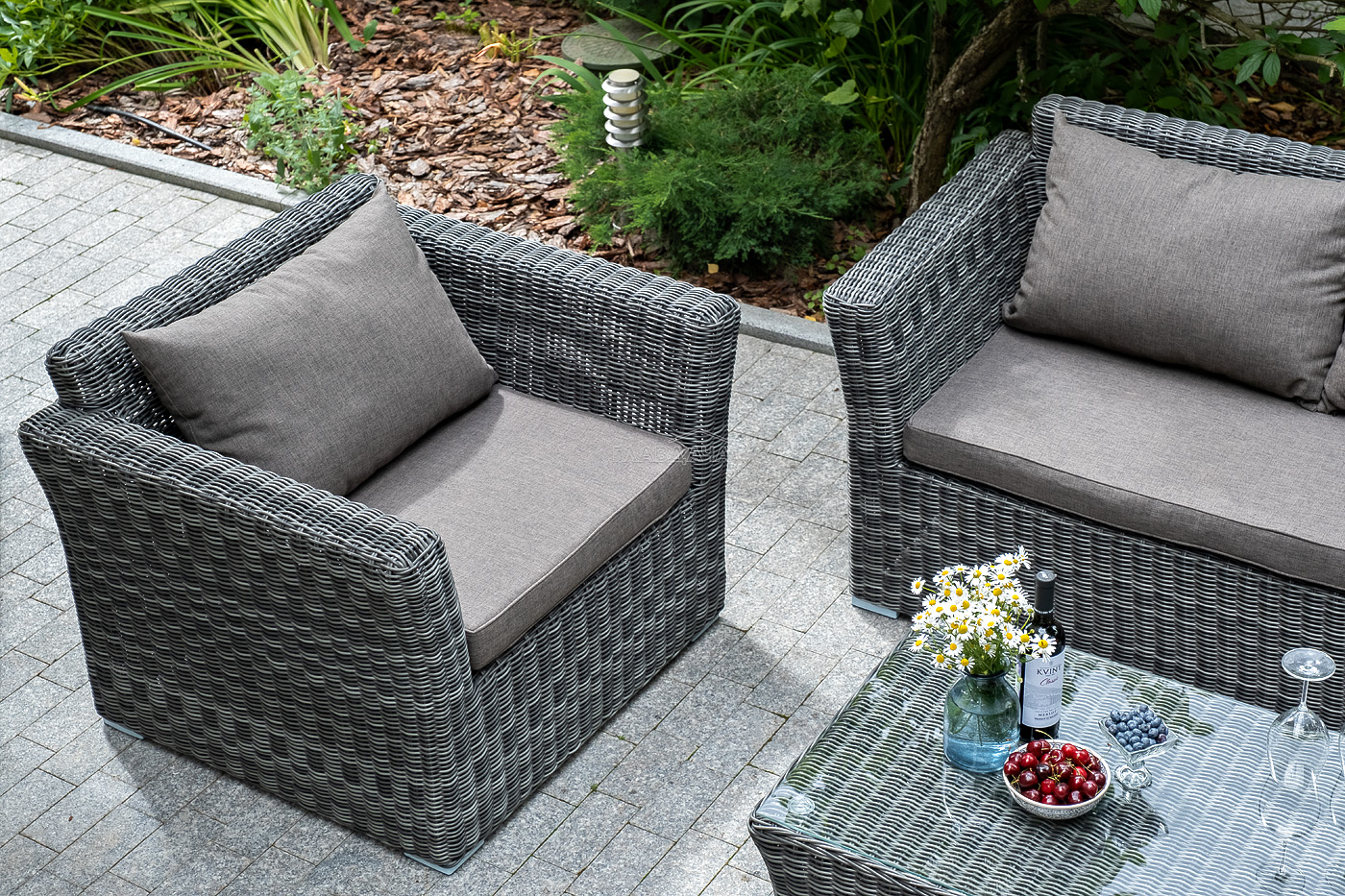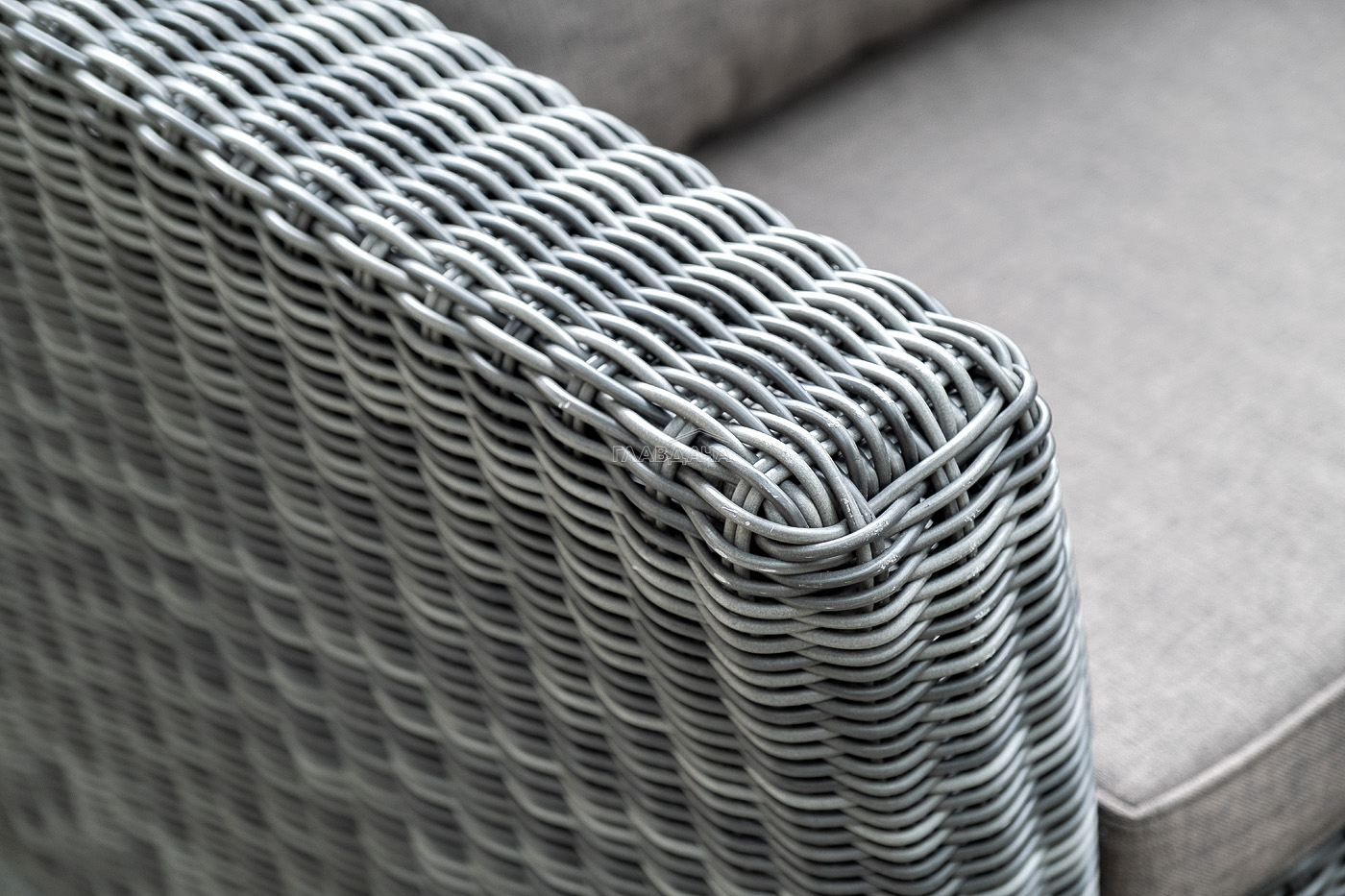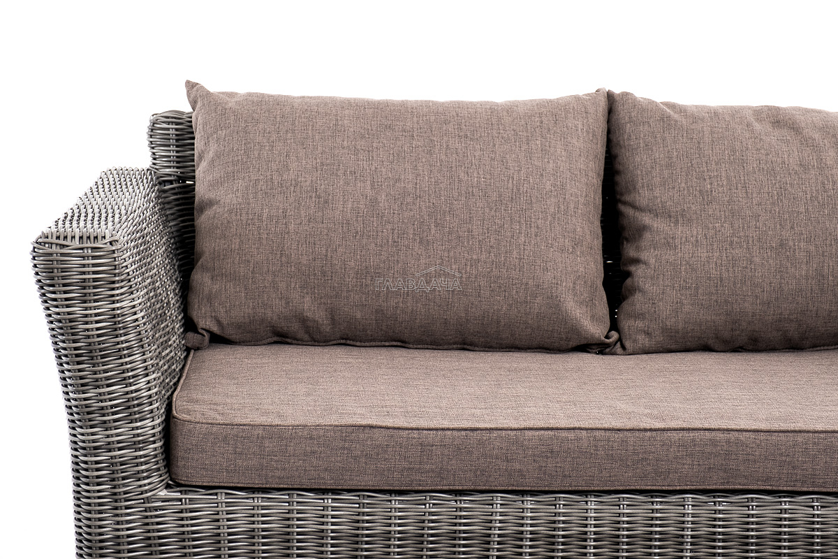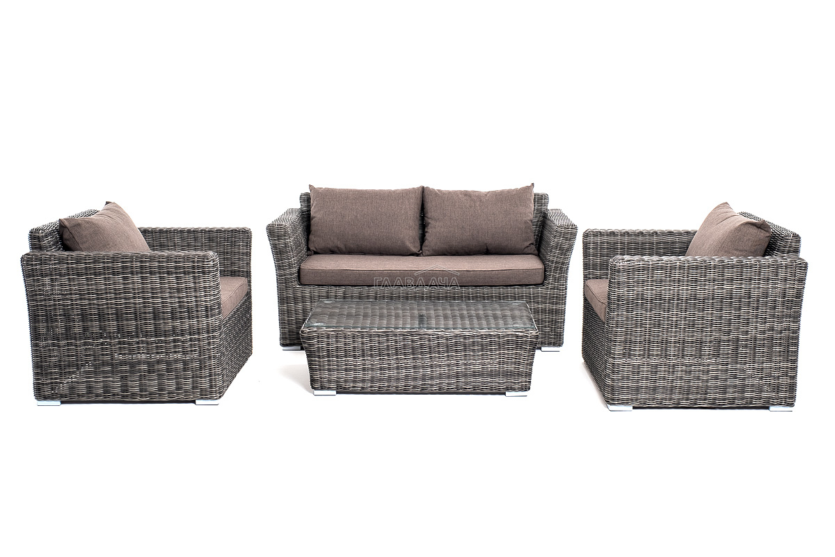 Прочный алюминиевый каркас усиливает устойчивость мебели. Его дополняет плетение в цвете "графит", которое представлено из круглого искусственного ротанга.