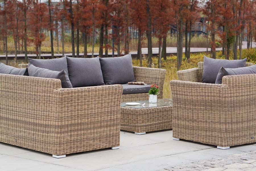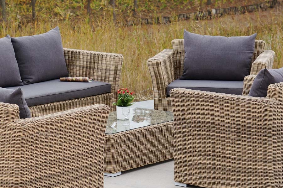 Прочность каркасу мебели обеспечивает алюминий. Из искусственного ротанга соломенного оттенка создана оригинальная ручная оплетка, которая выступает в качестве основного декора.