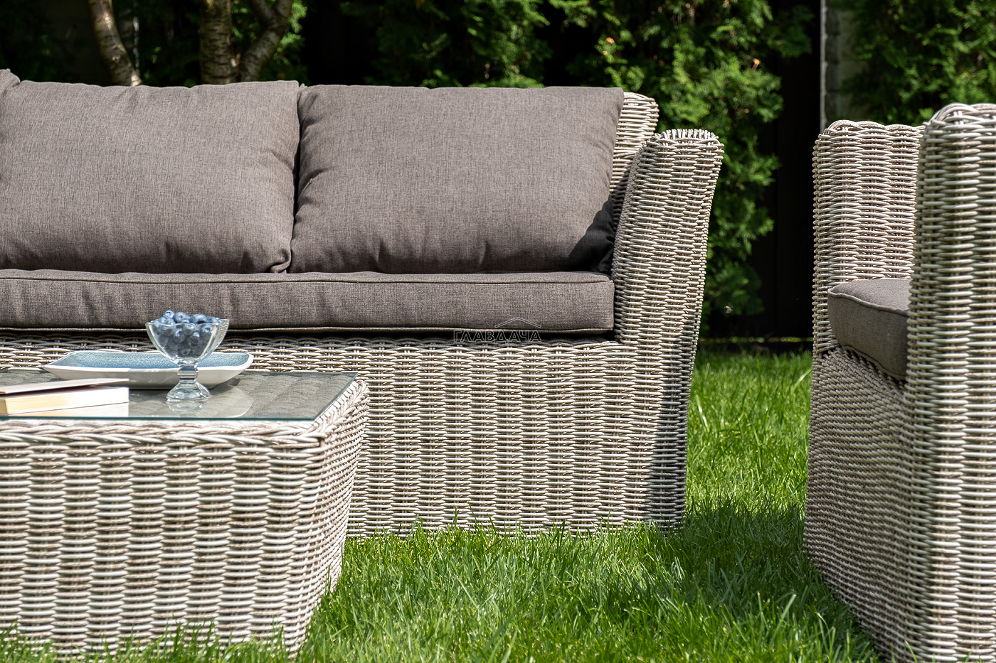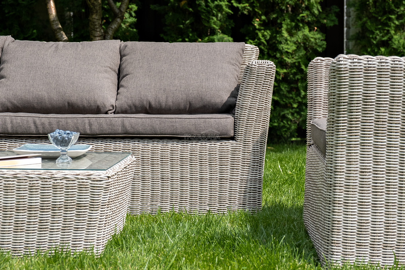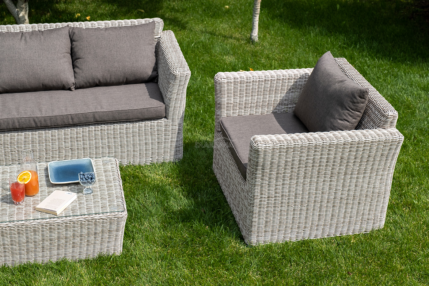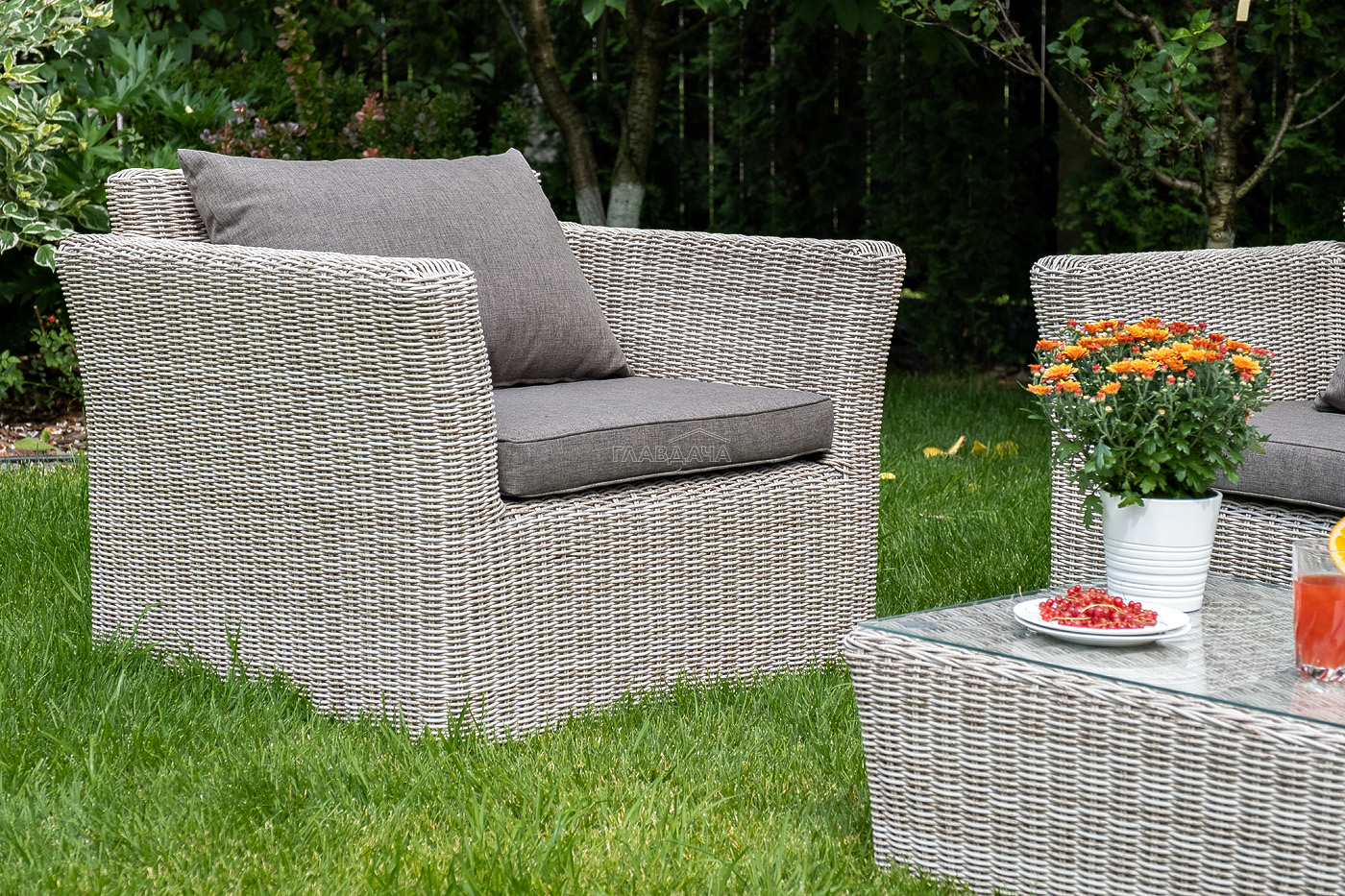 Кресла и диван идут в комплекте с подушками с серыми чехлами. Они пошиты из качественного полиэстера с плотностью 300гр/м2. Материал предварительно проходит обработку влагоотталкивающей пропиткой. Столик дополнен практичной столешницей из стекла толщиной 5 мм.