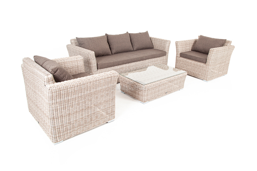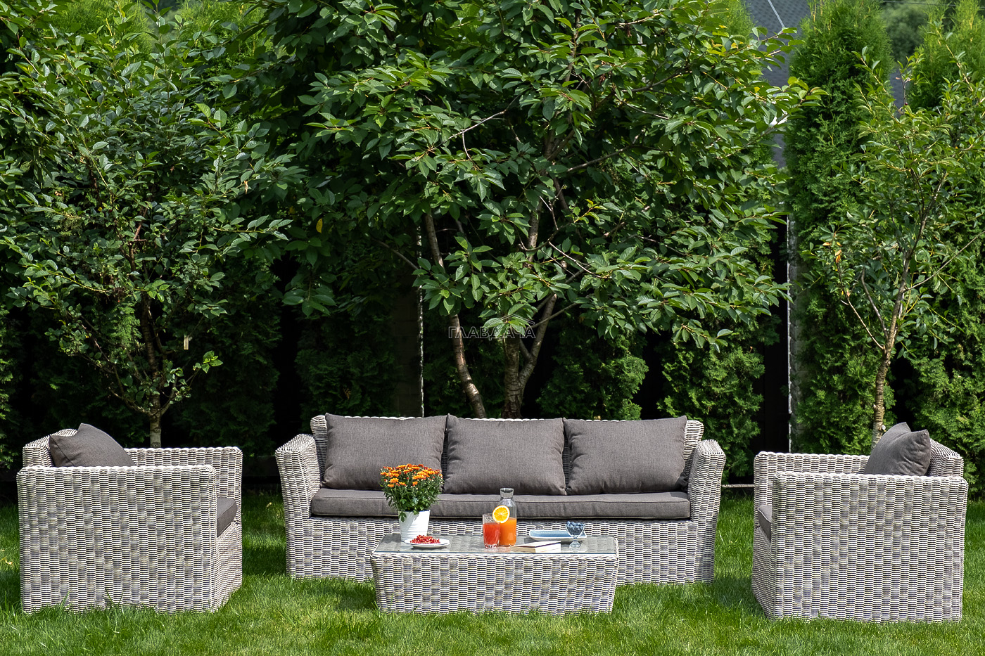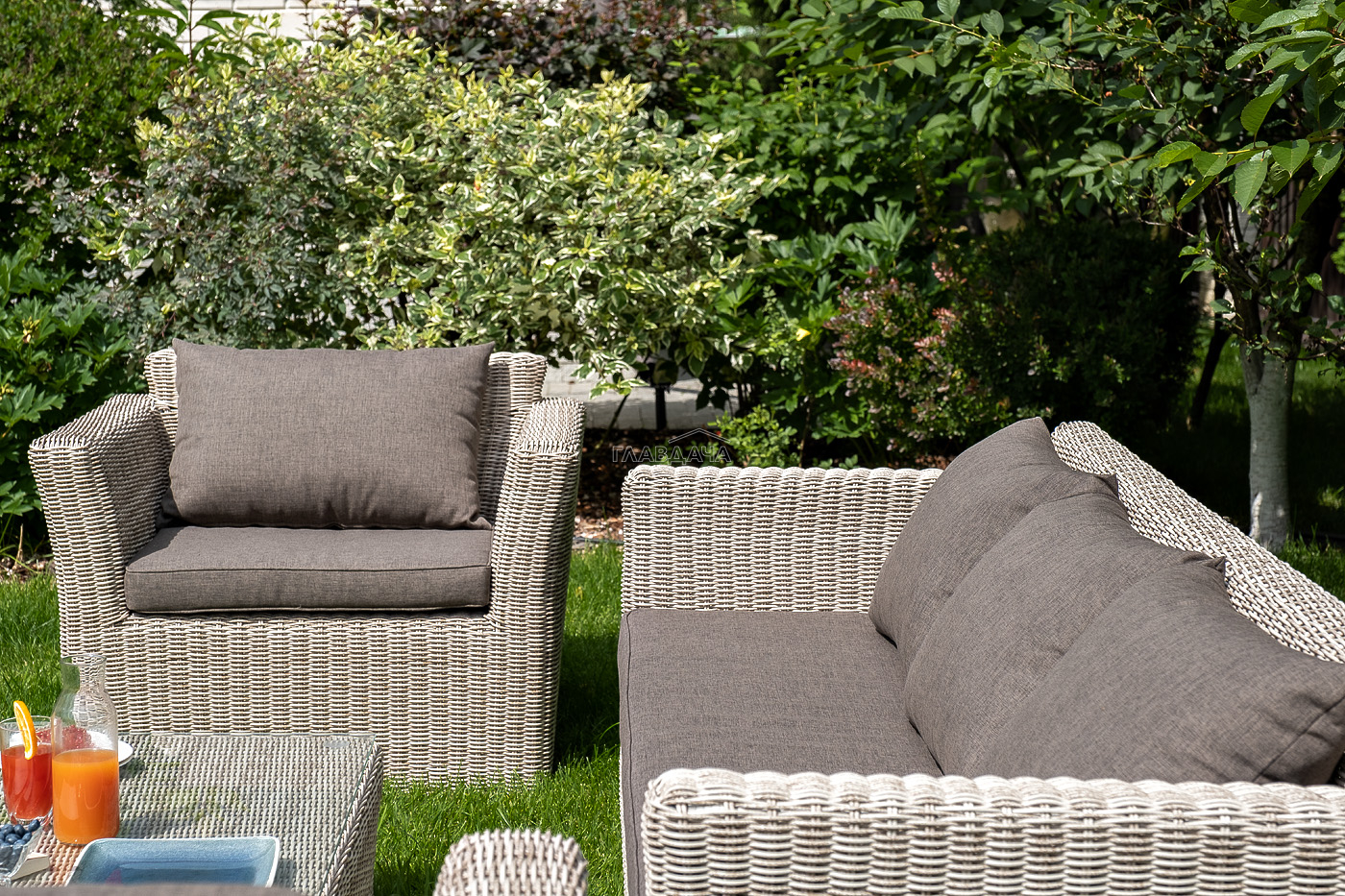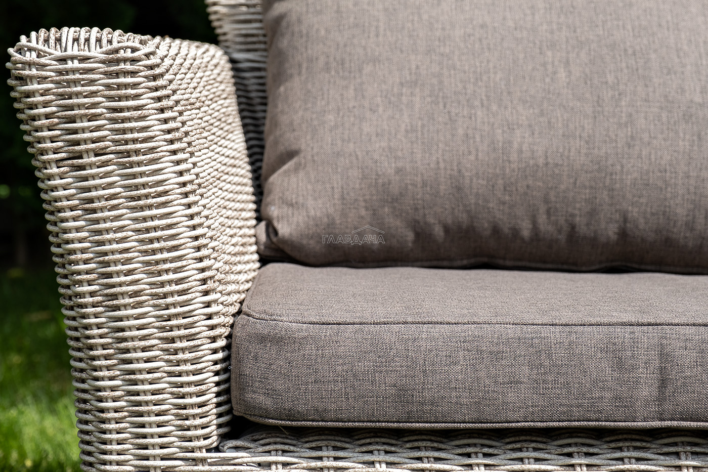 Кресла и диван идут в комплекте с подушками с серыми чехлами. Они пошиты из качественного полиэстера с плотностью 300гр/м2. Материал предварительно проходит обработку влагоотталкивающей пропиткой. Столик дополнен практичной столешницей из стекла толщиной 5 мм.