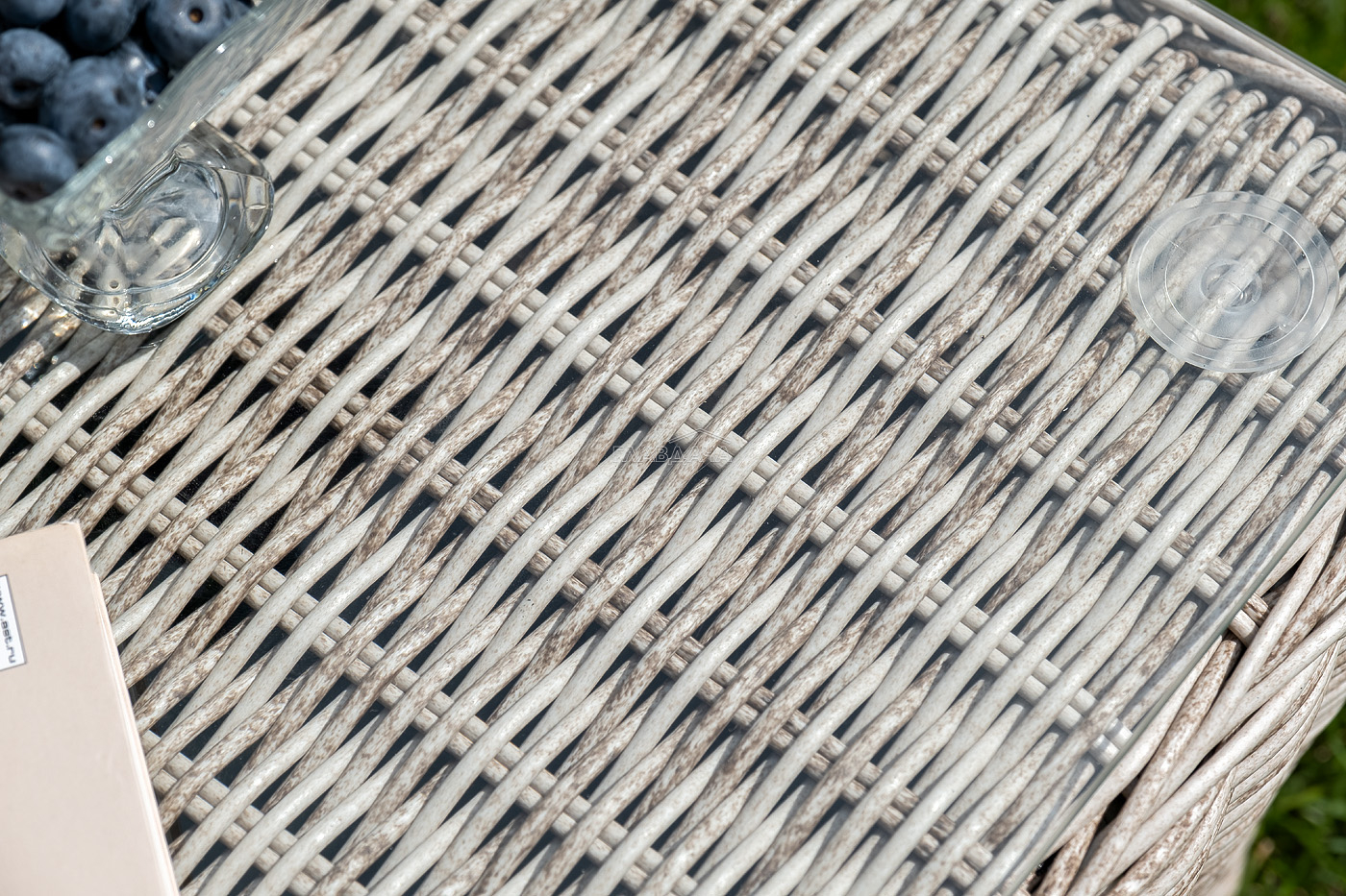 Из алюминия сделан устойчивый каркас мебели. Ее поверхность дополнена искусственным ротангом, из которого сделано ручное плетение, цвет бежевый.