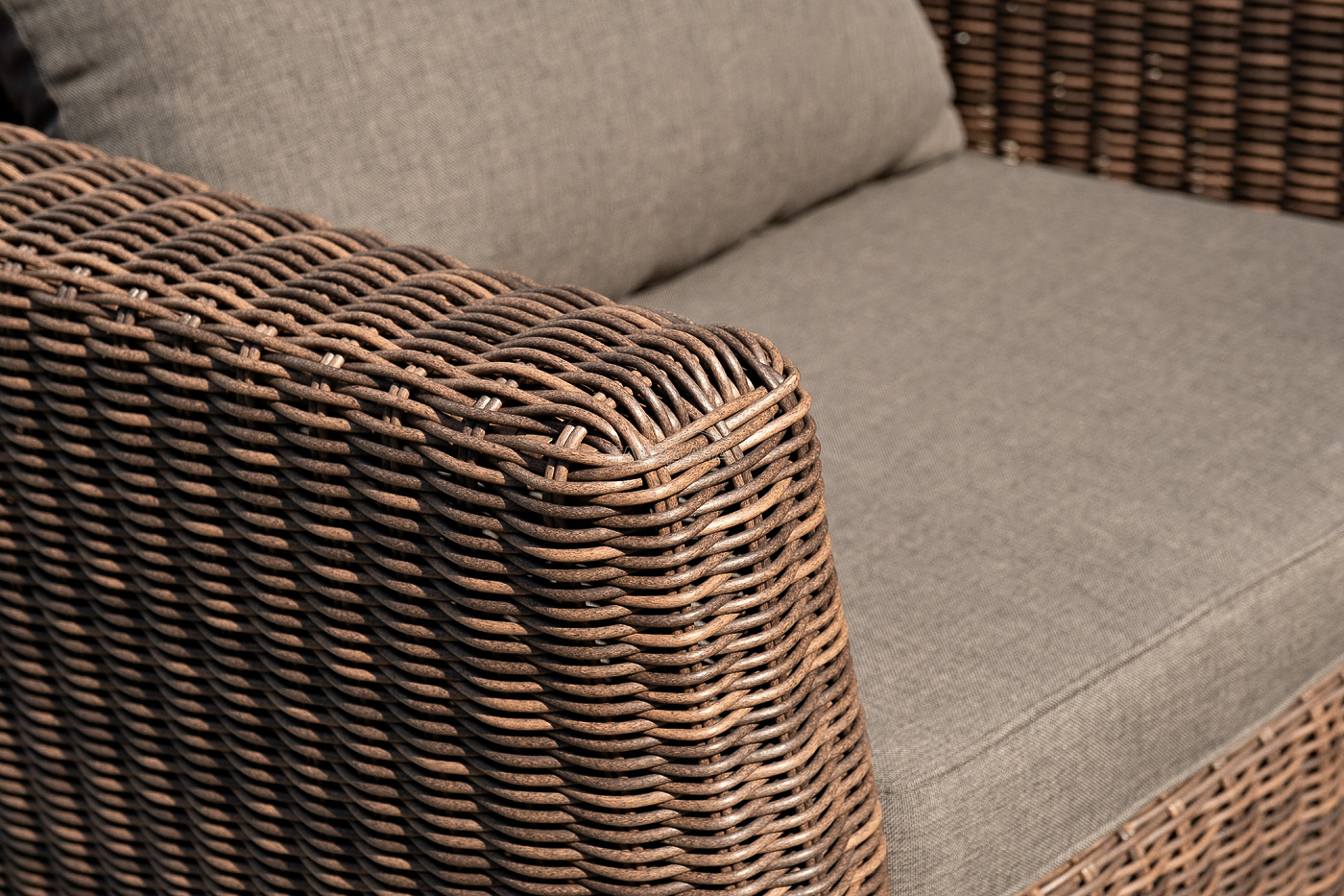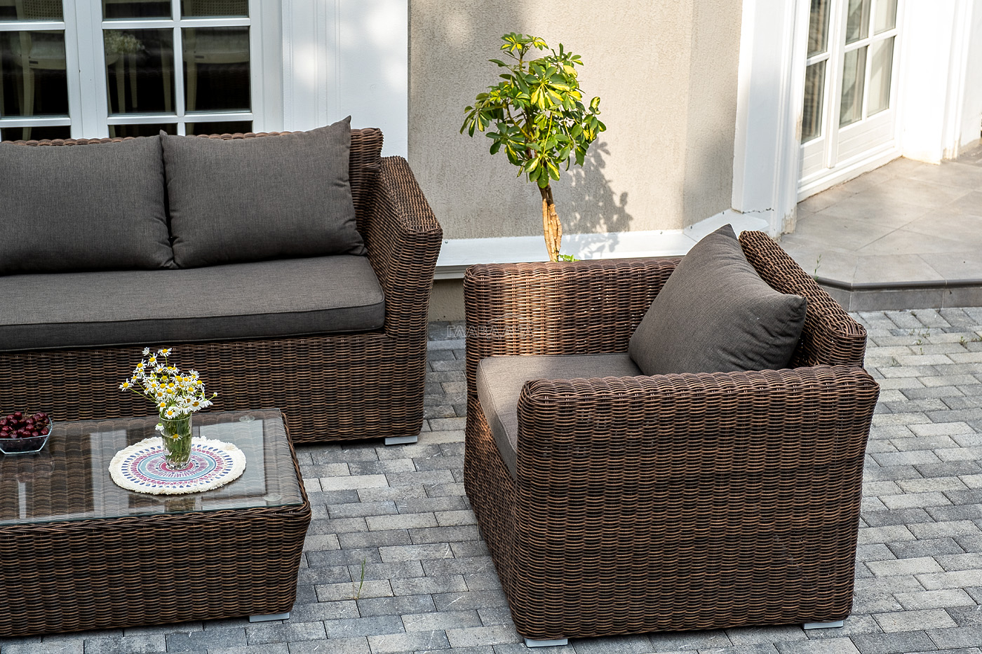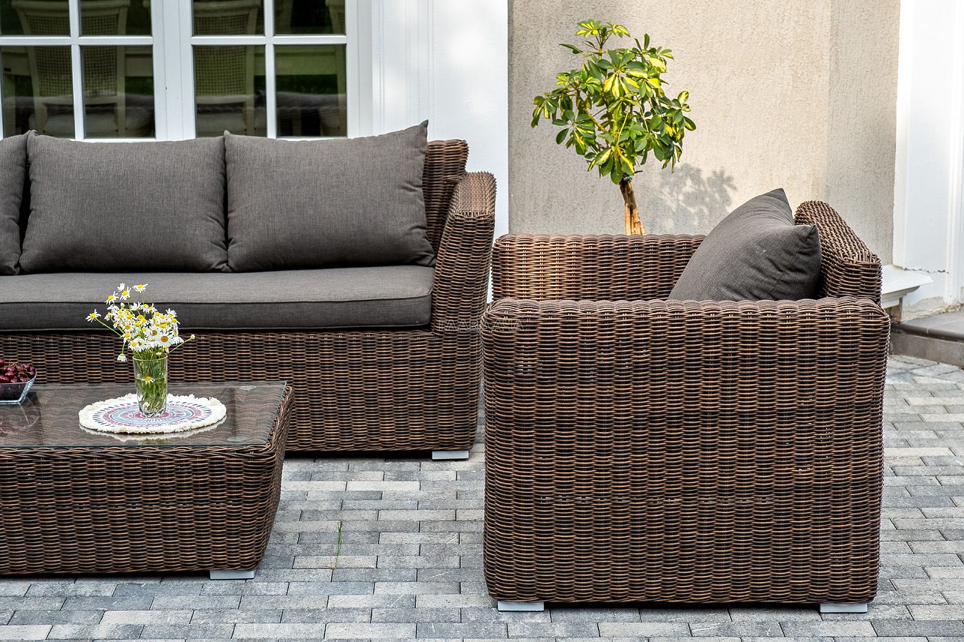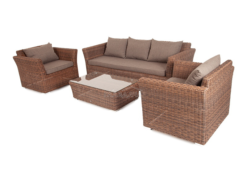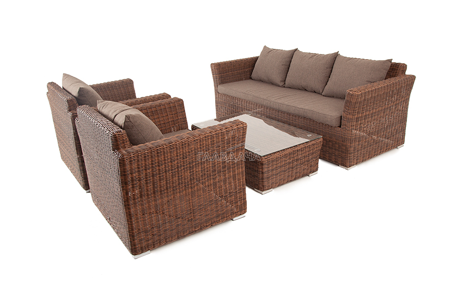 В качестве основы применяется алюминиевый каркас. Из круглого искусственного ротанга сделана ручная оплетка. Цвет комплекта – коричневый.