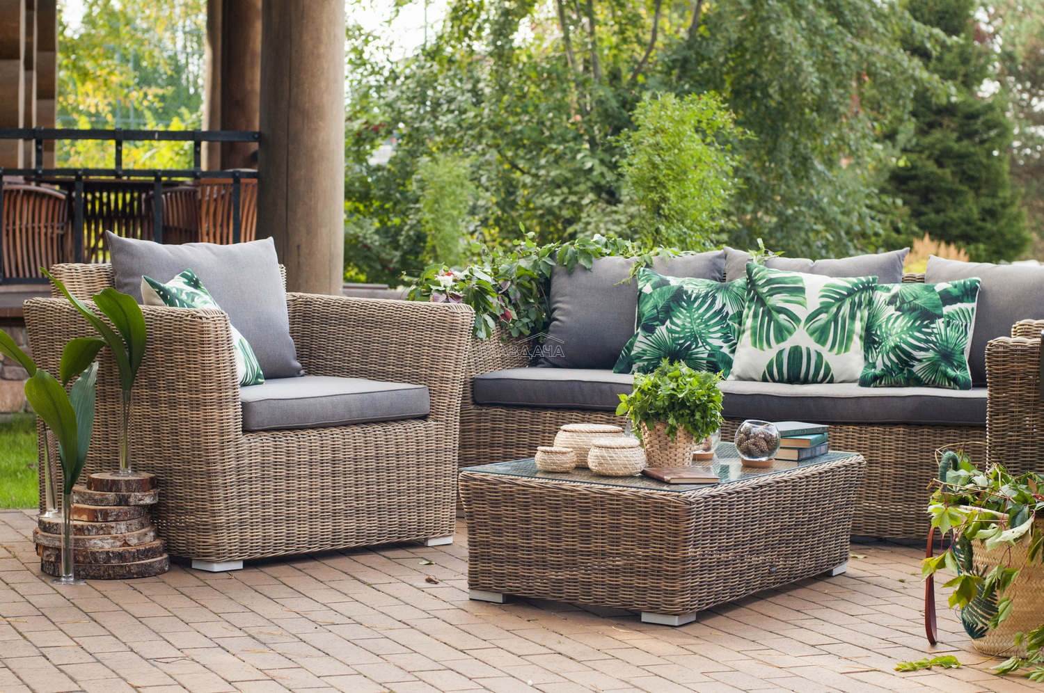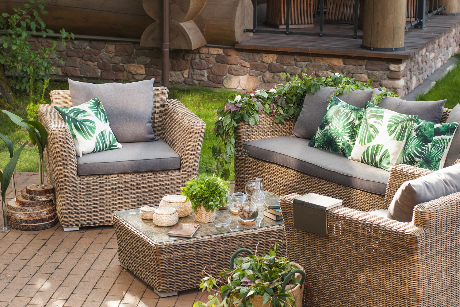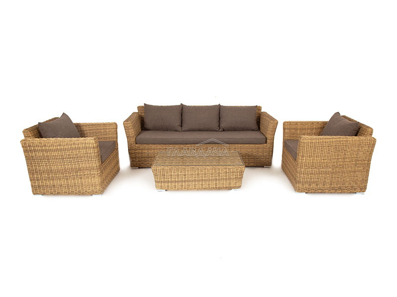 Из алюминия сделан устойчивый каркас мебели. Ее поверхность дополнена искусственным ротангом, из которого сделано ручное плетение, цвет соломенный.