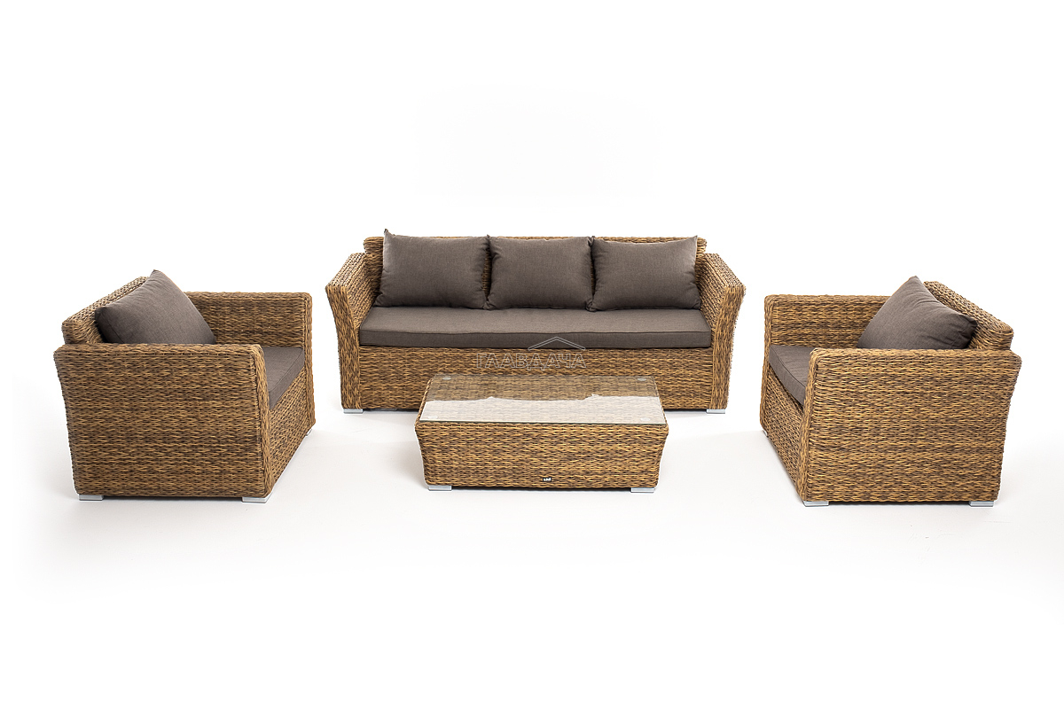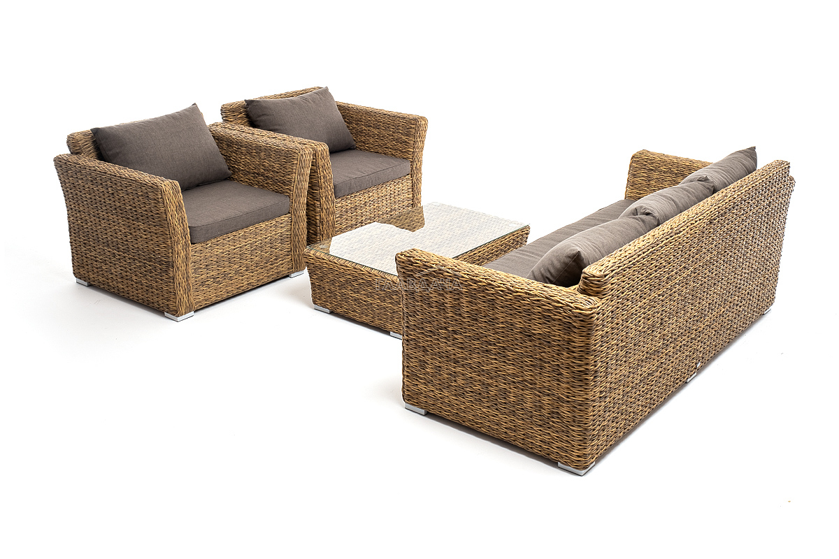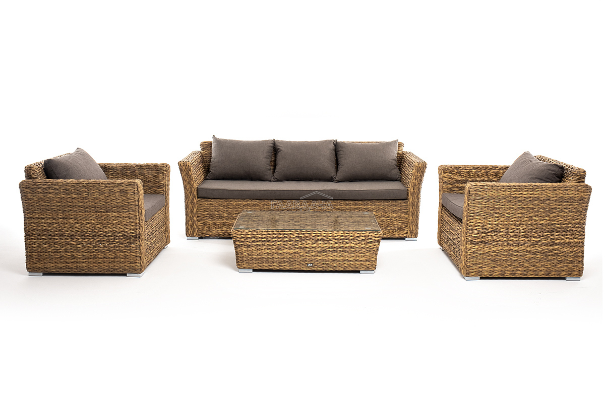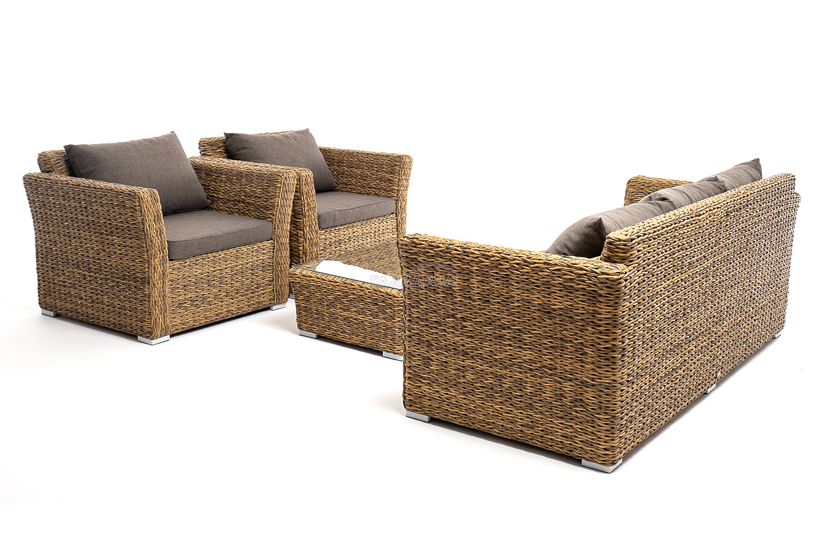 Из алюминия сделан устойчивый каркас мебели. Ее поверхность дополнена искусственным ротангом вида "гиацинт", из которого сделано ручное плетение, цвет соломенный.