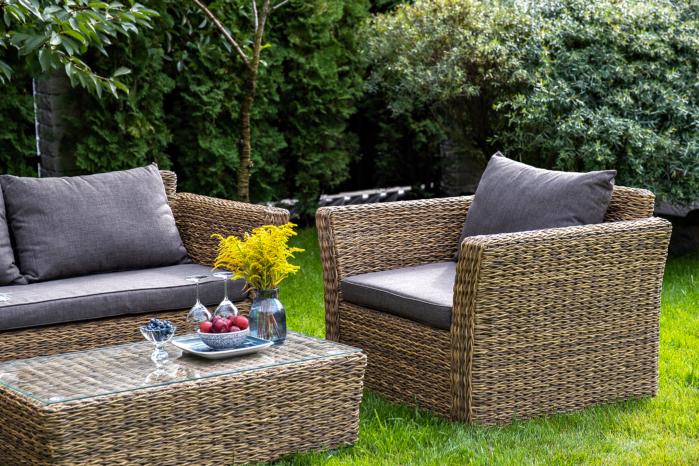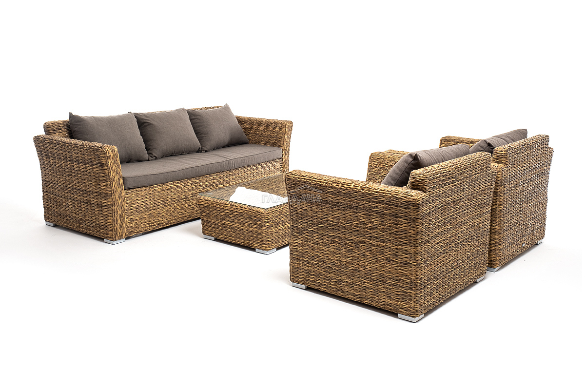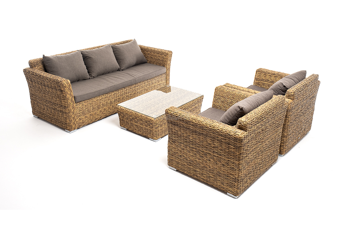 Из алюминия сделан устойчивый каркас мебели. Ее поверхность дополнена искусственным ротангом вида "гиацинт", из которого сделано ручное плетение, цвет соломенный.