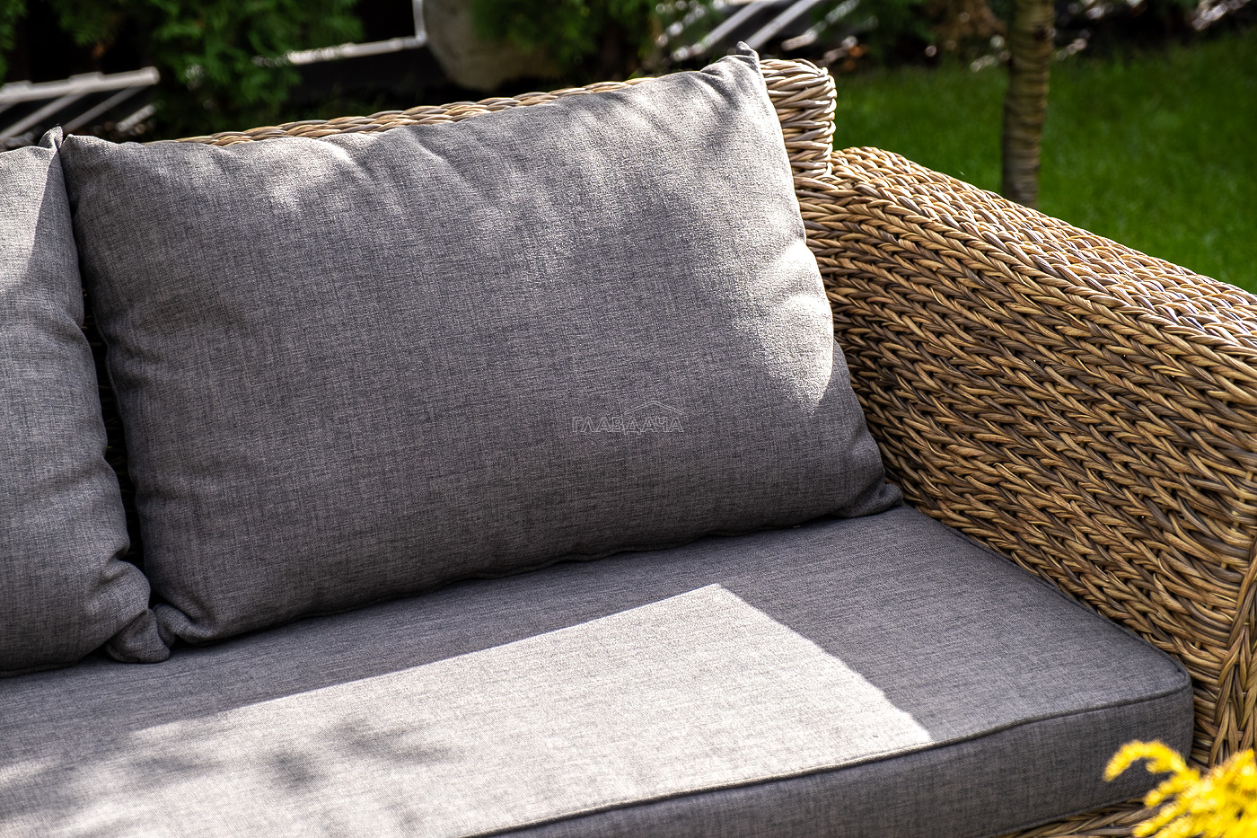 Кресла и диван идут в комплекте с подушками с серыми чехлами. Они пошиты из качественного полиэстера с плотностью 300гр/м2. Материал предварительно проходит обработку влагоотталкивающей пропиткой. Столик дополнен практичной столешницей из стекла толщиной 5 мм.