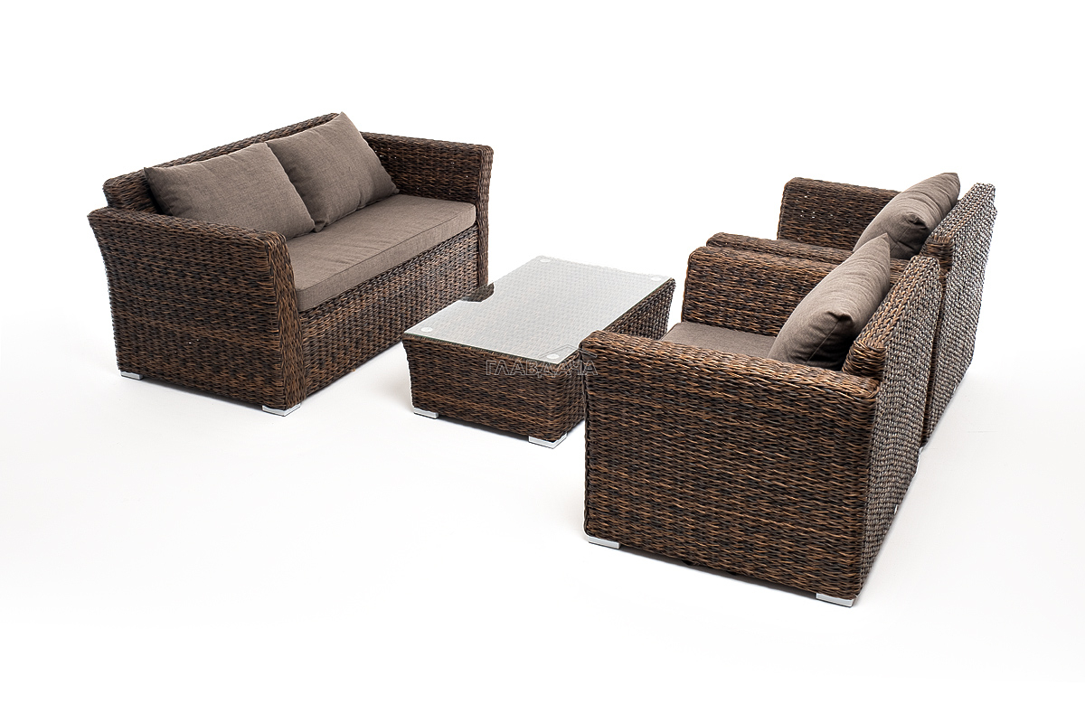 Мебель изготовлена из алюминиевого каркаса и круглого искусственного ротанга "вида гиацинт". Цвет комплекта – коричневый.