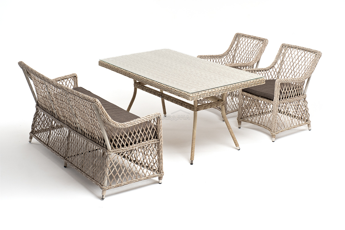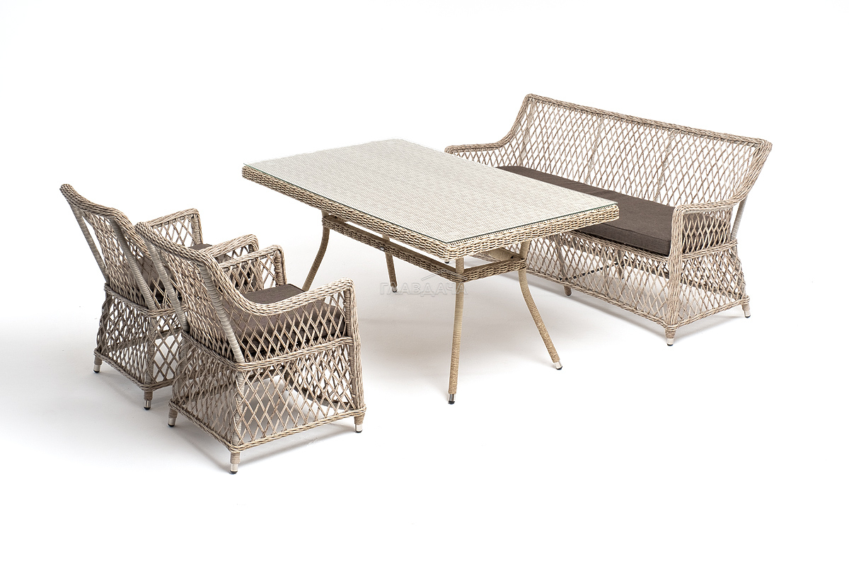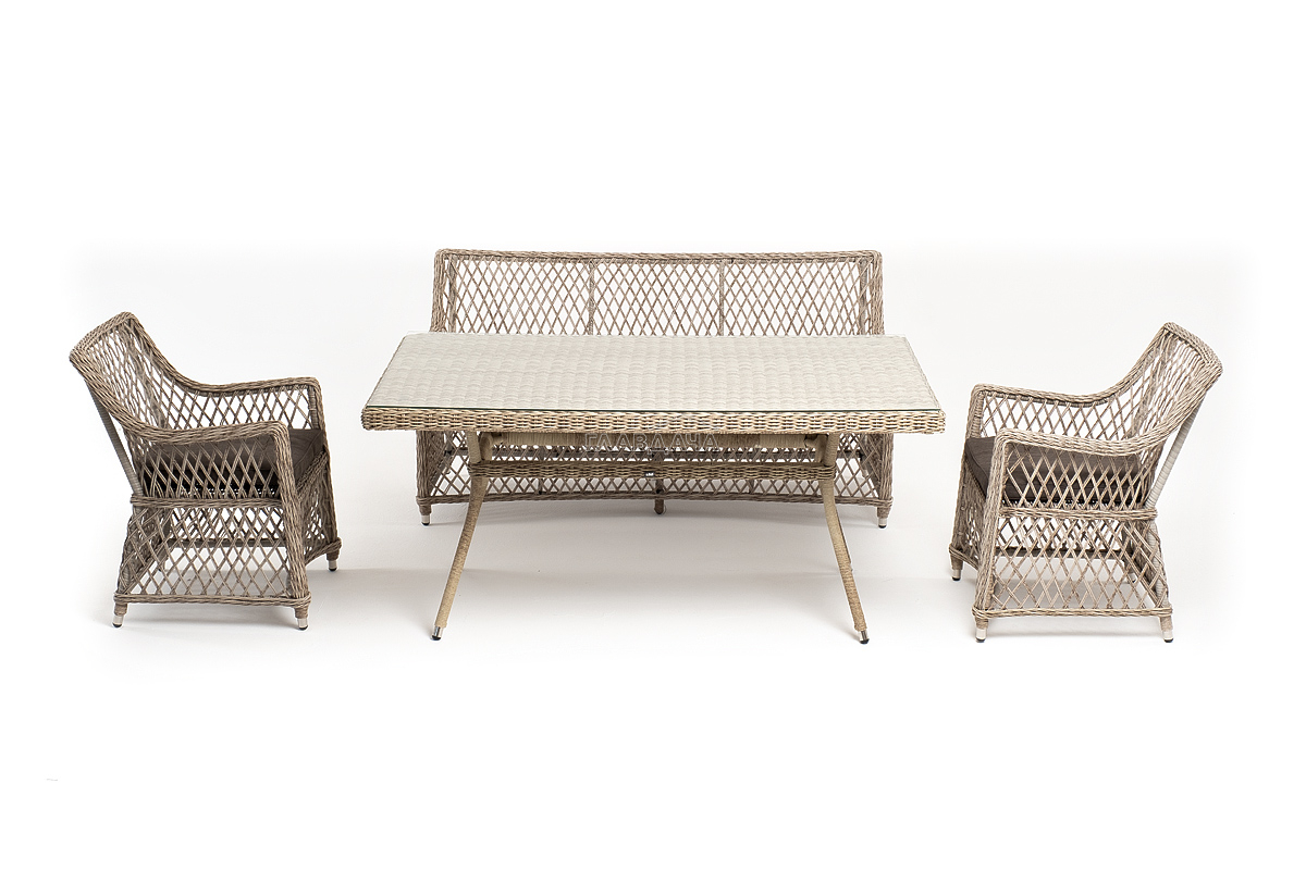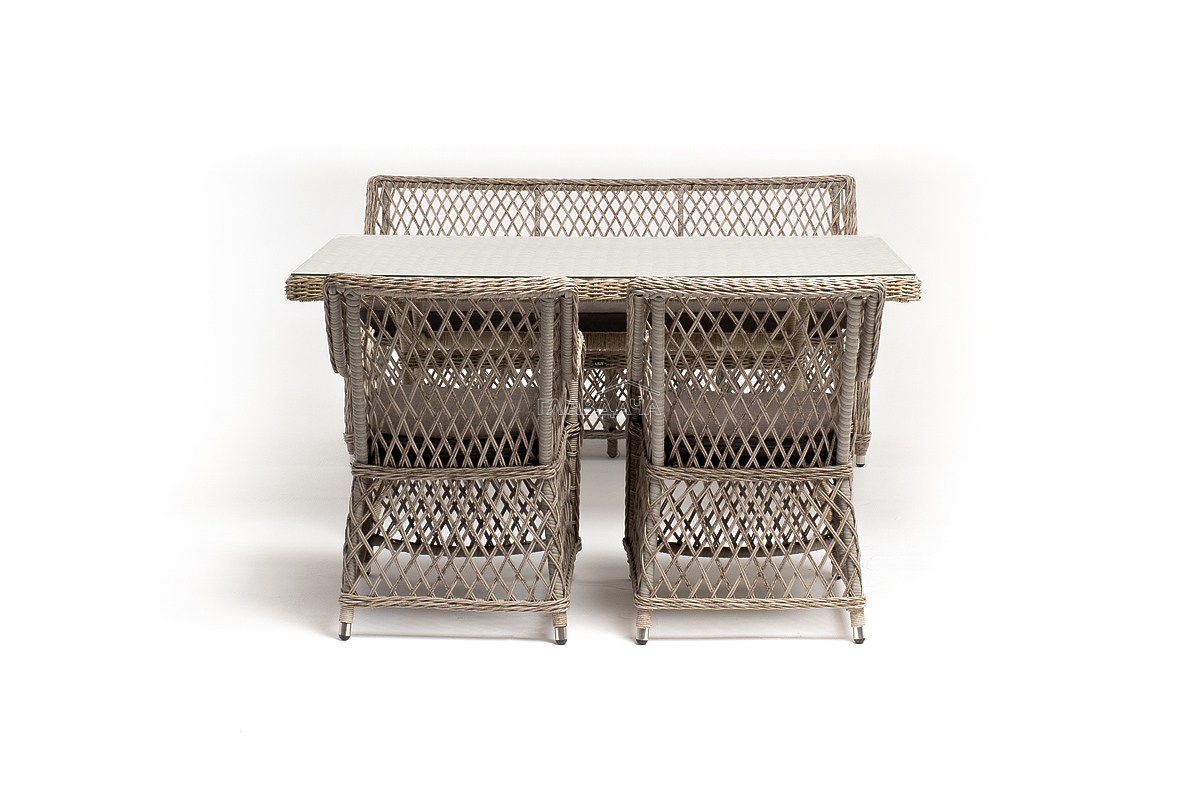Все предметы мебели изготовлены из прочного алюминия, вручную оплетенного долговечным искусственным ротангом. На креслах и диване предусмотрены подушки со съёмными чехлами и влагостойкой пропиткой. Стол укомплектован прочным стеклом толщиной 5 мм для удобства использования.