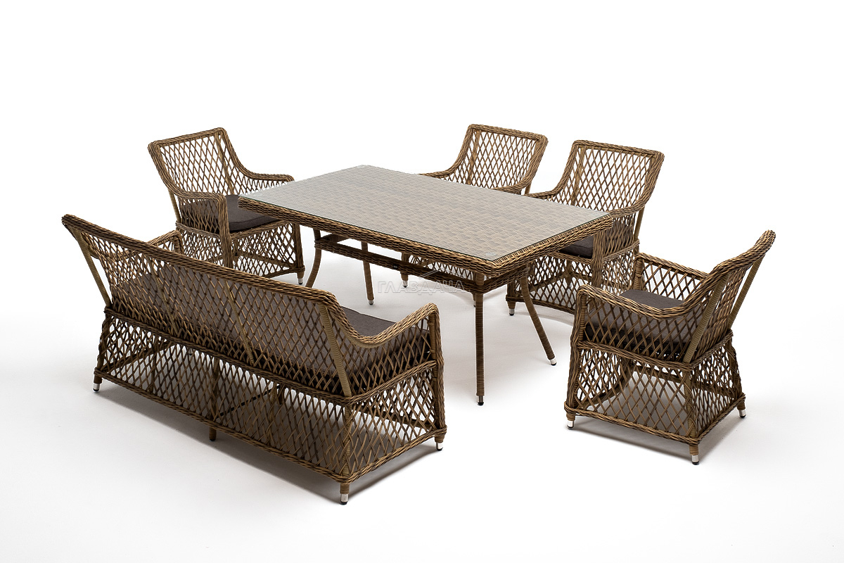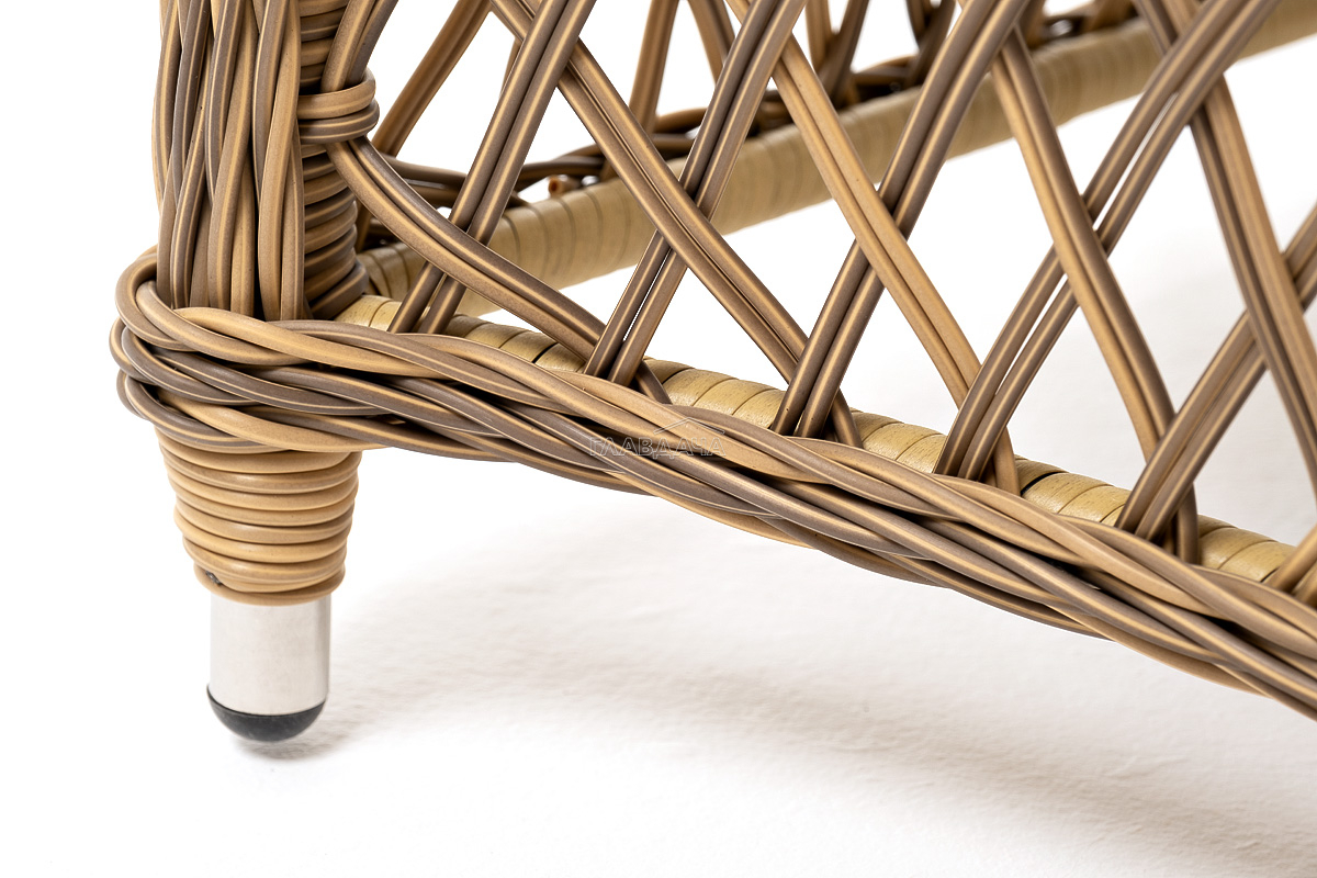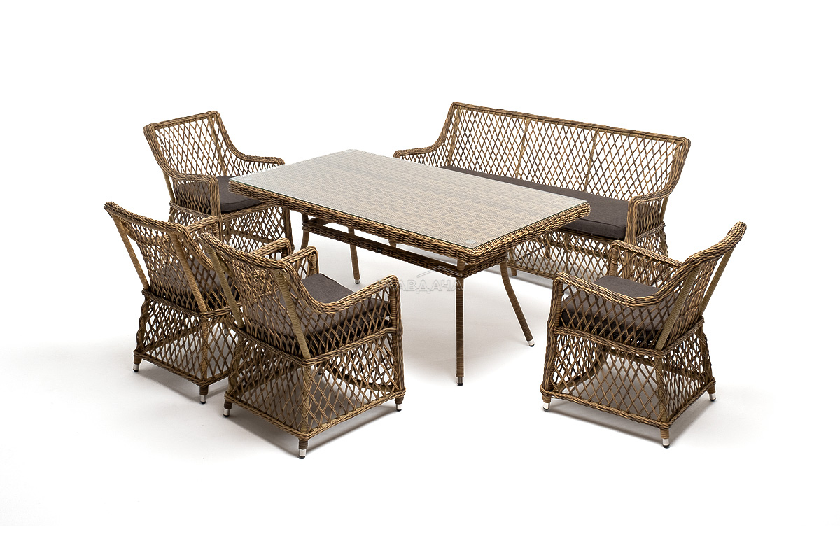 Все предметы мебели изготовлены из прочного алюминия, вручную оплетенного долговечным искусственным ротангом. На креслах и диване предусмотрены подушки со съёмными чехлами и влагостойкой пропиткой. Стол укомплектован прочным стеклом толщиной 5 мм для удобства использования.