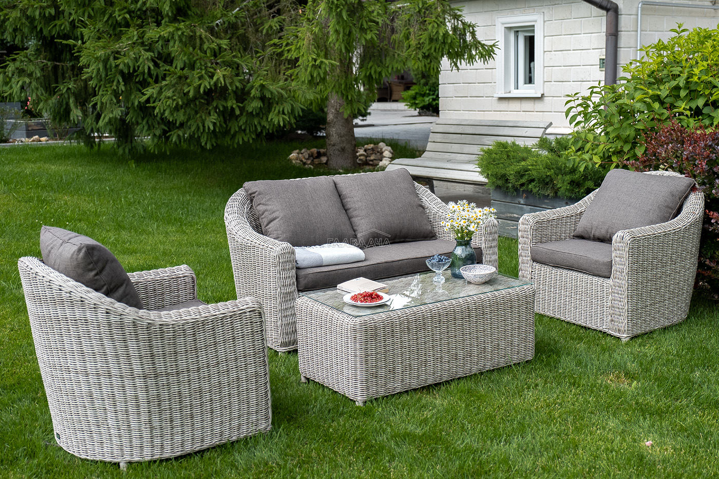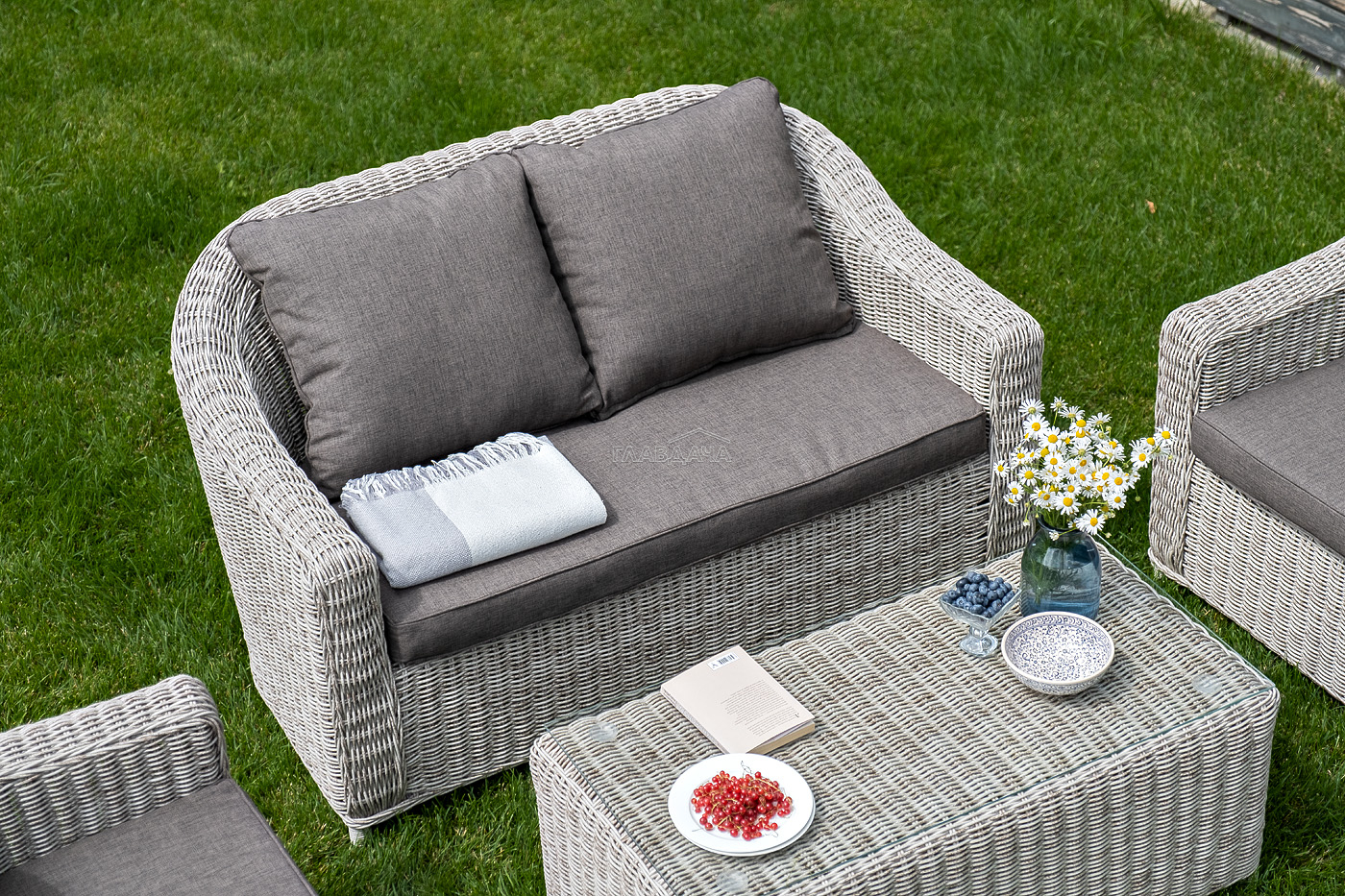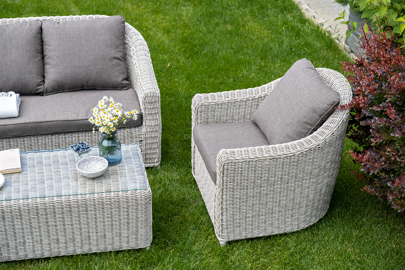 Садовая мебель выполнена из алюминиевого каркаса, выдерживающего большие нагрузки, и круглого искусственного ротанга. Каркас оплетен с помощью ручного метода и представлен в бежевом цвете.