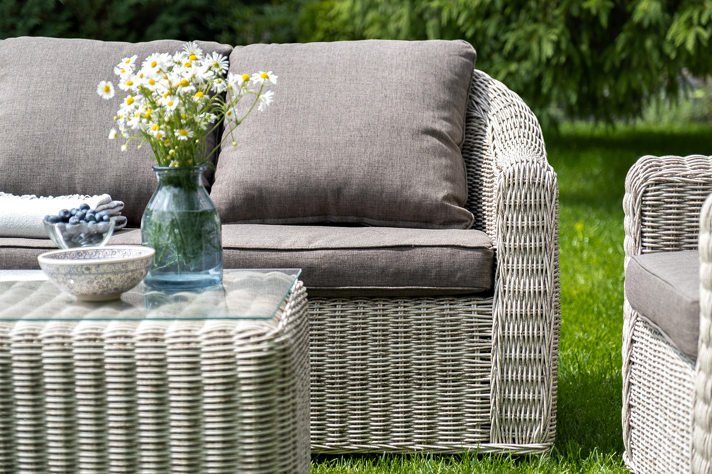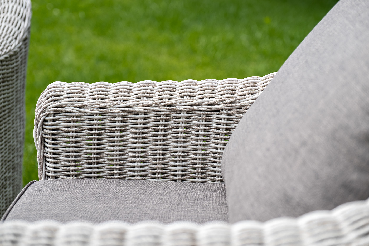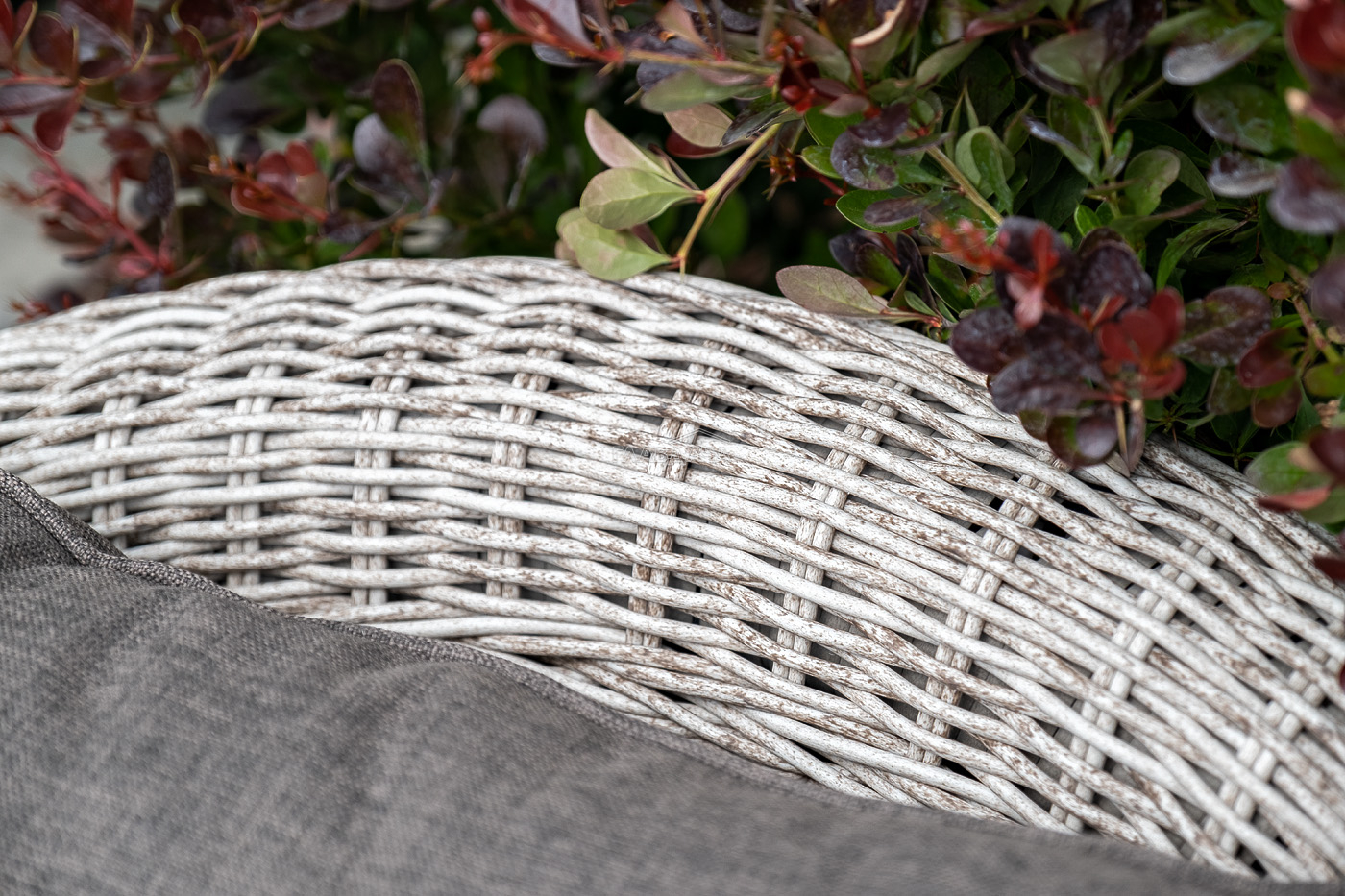 Садовая мебель выполнена из алюминиевого каркаса, выдерживающего большие нагрузки, и круглого искусственного ротанга. Каркас оплетен с помощью ручного метода и представлен в бежевом цвете.