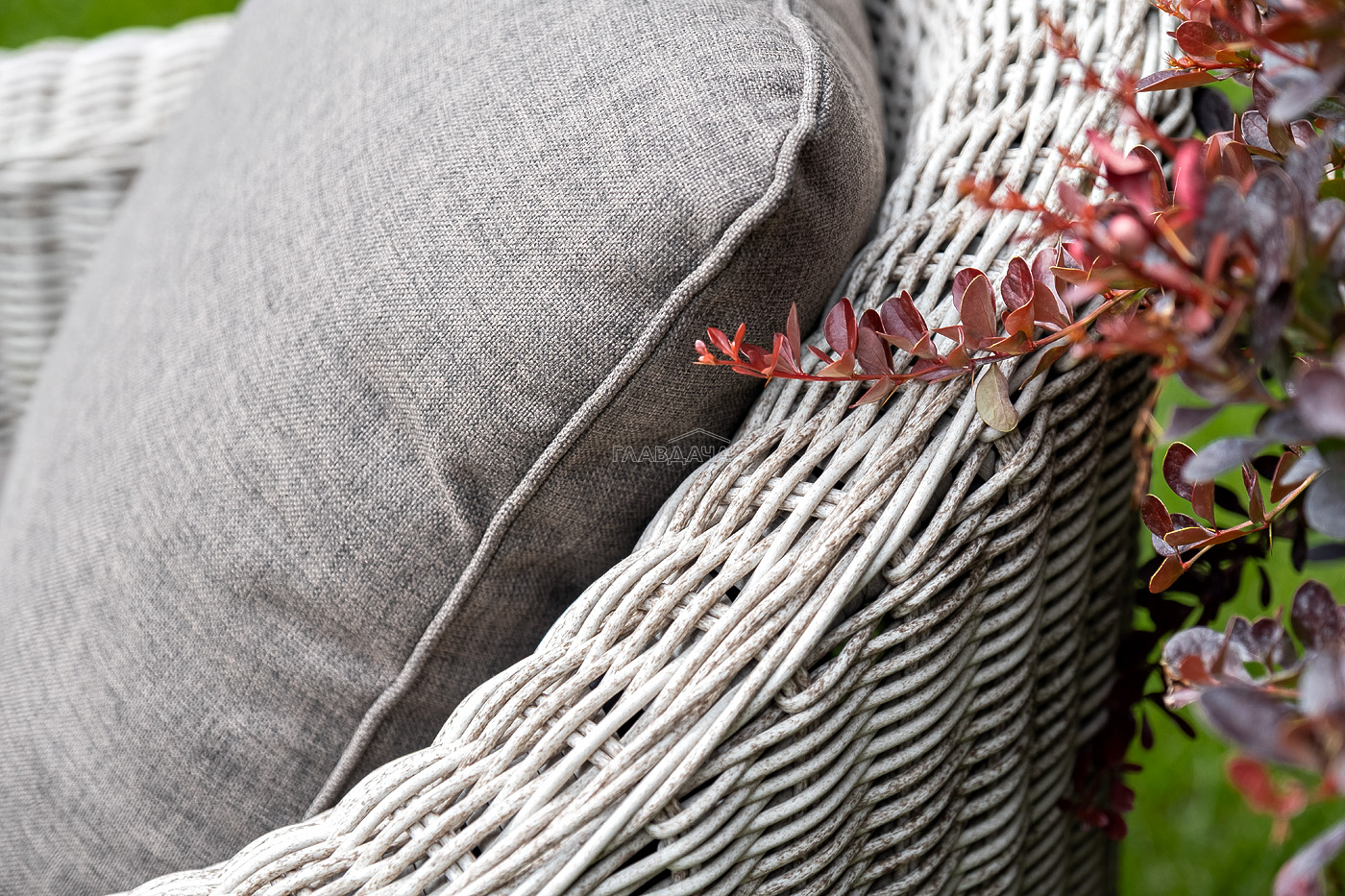 Диван и кресла укомплектованы удобными подушками в серых чехлах. Они пошиты из материала с влагоотталкивающей пропиткой – полиэстера, плотностью 300гр/м2. Чехлы съёмные, их можно стирать в стиральной машине.