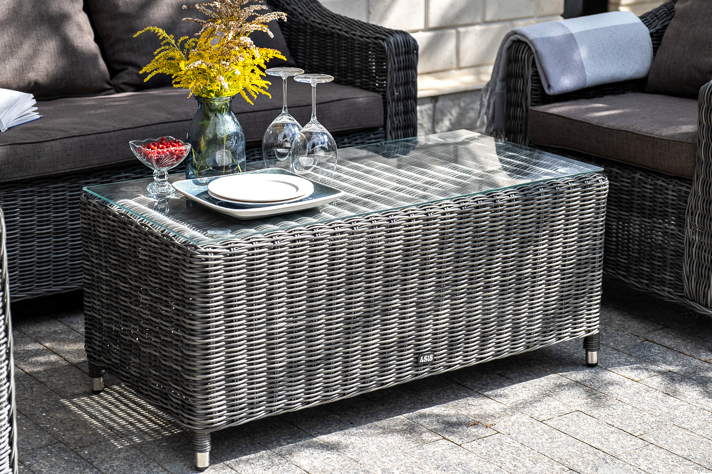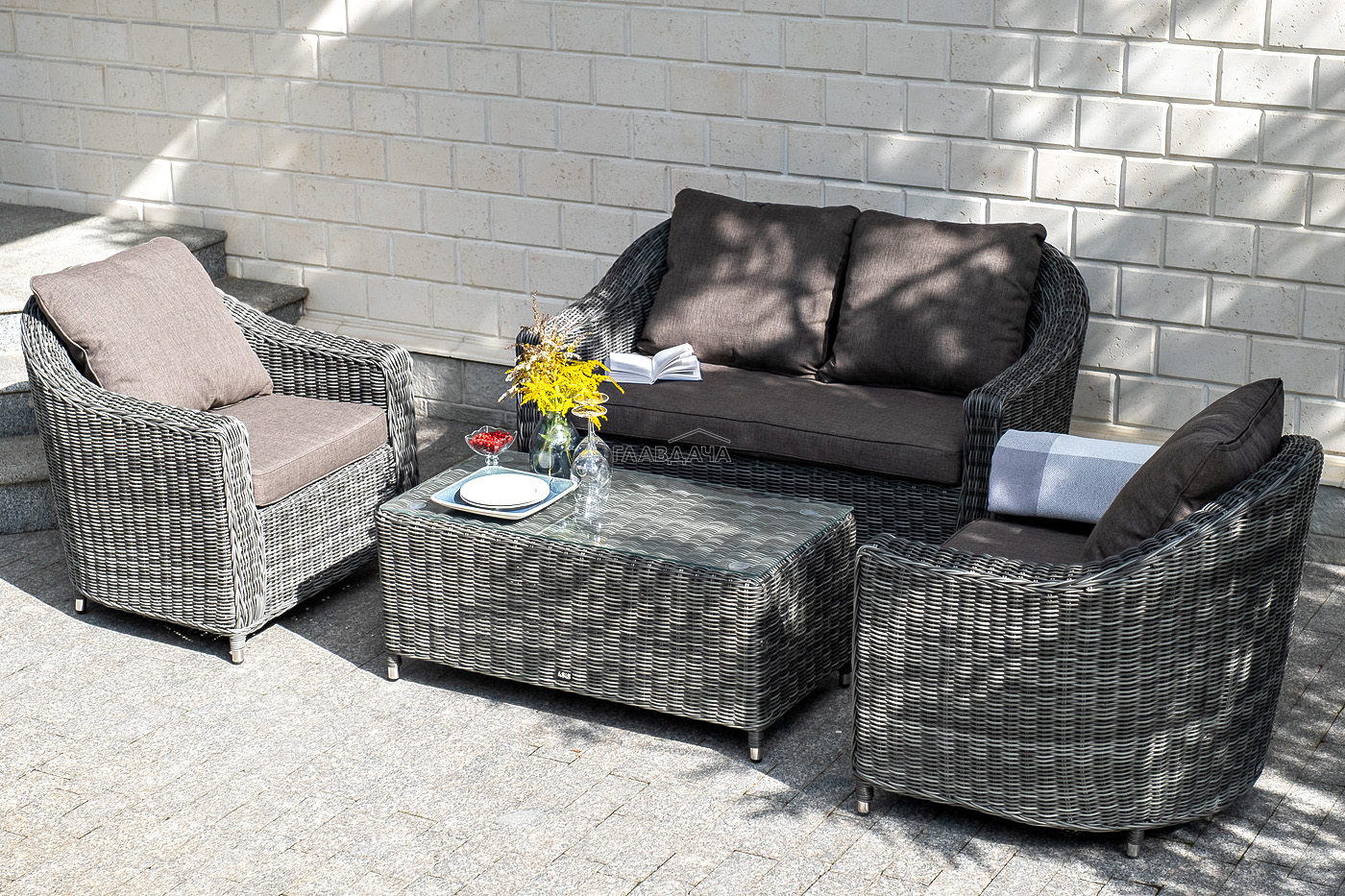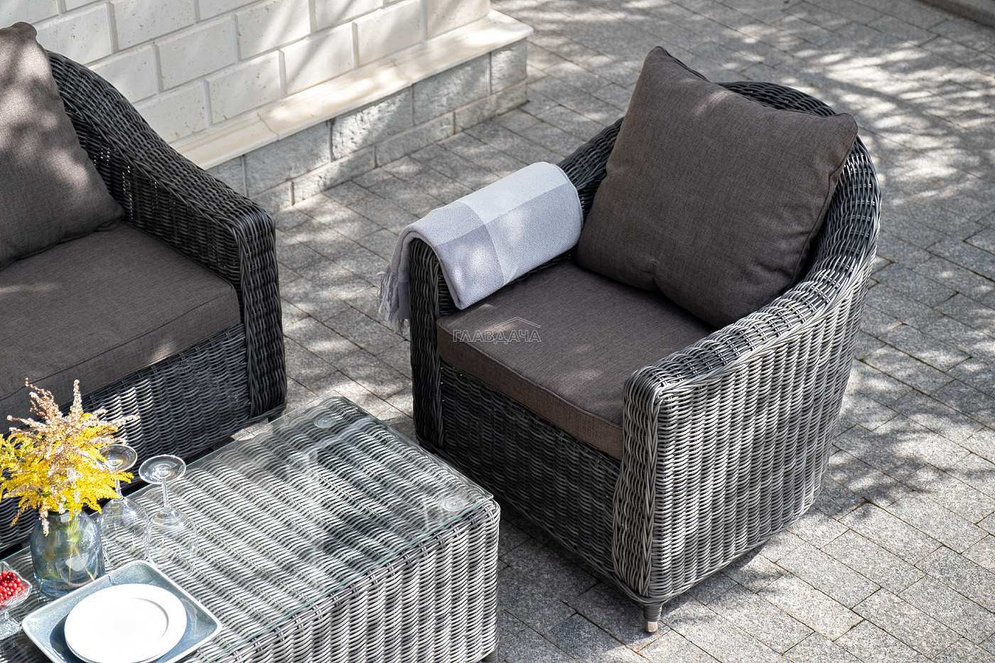 В основе мебели - алюминиевый каркас и круглый искусственный ротанг. Каркас оплетен с помощью ручного метода и представлен в графитовом цвете.