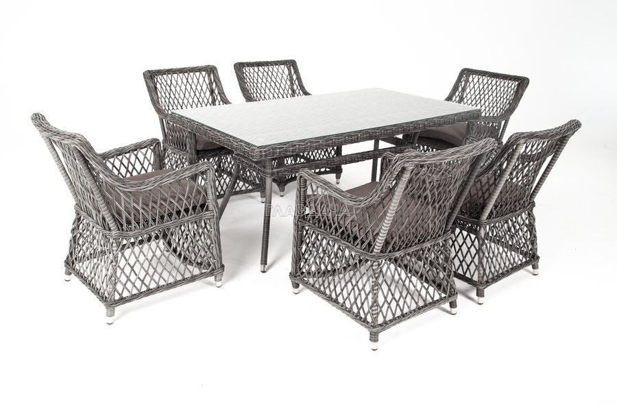 Состоит из прямоугольного стола со стеклянной столешницей, размером 1600×900×750 мм и 6 кресел, размером - 550×660×850 мм.