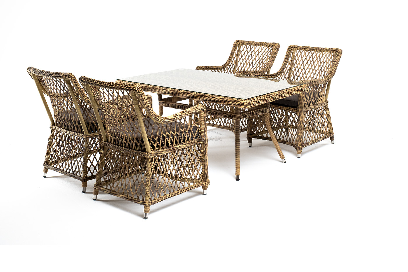 Комплект гармонично сочетает в себе алюминий, из которого выполнен каркас и декор из искусственного ротанга соломенного оттенка. Прекрасным дополнением мебели стали мягкие подушки из всепогодной ткани со съёмными чехлами.