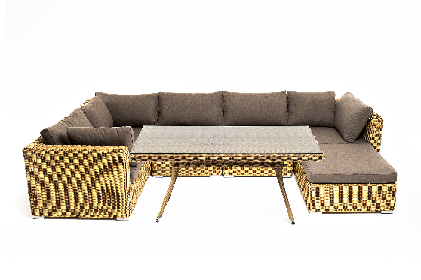 Облегченный алюминиевый каркас, вручную оплетенный долговечным искусственным ротангом натурального соломенного оттенка. Обеденный стол с прочной стеклянной столешницей толщиной 5 мм.