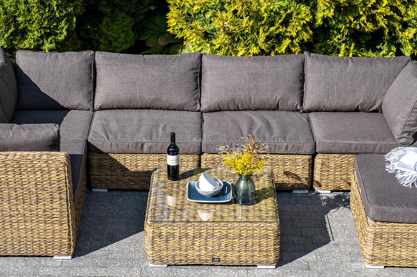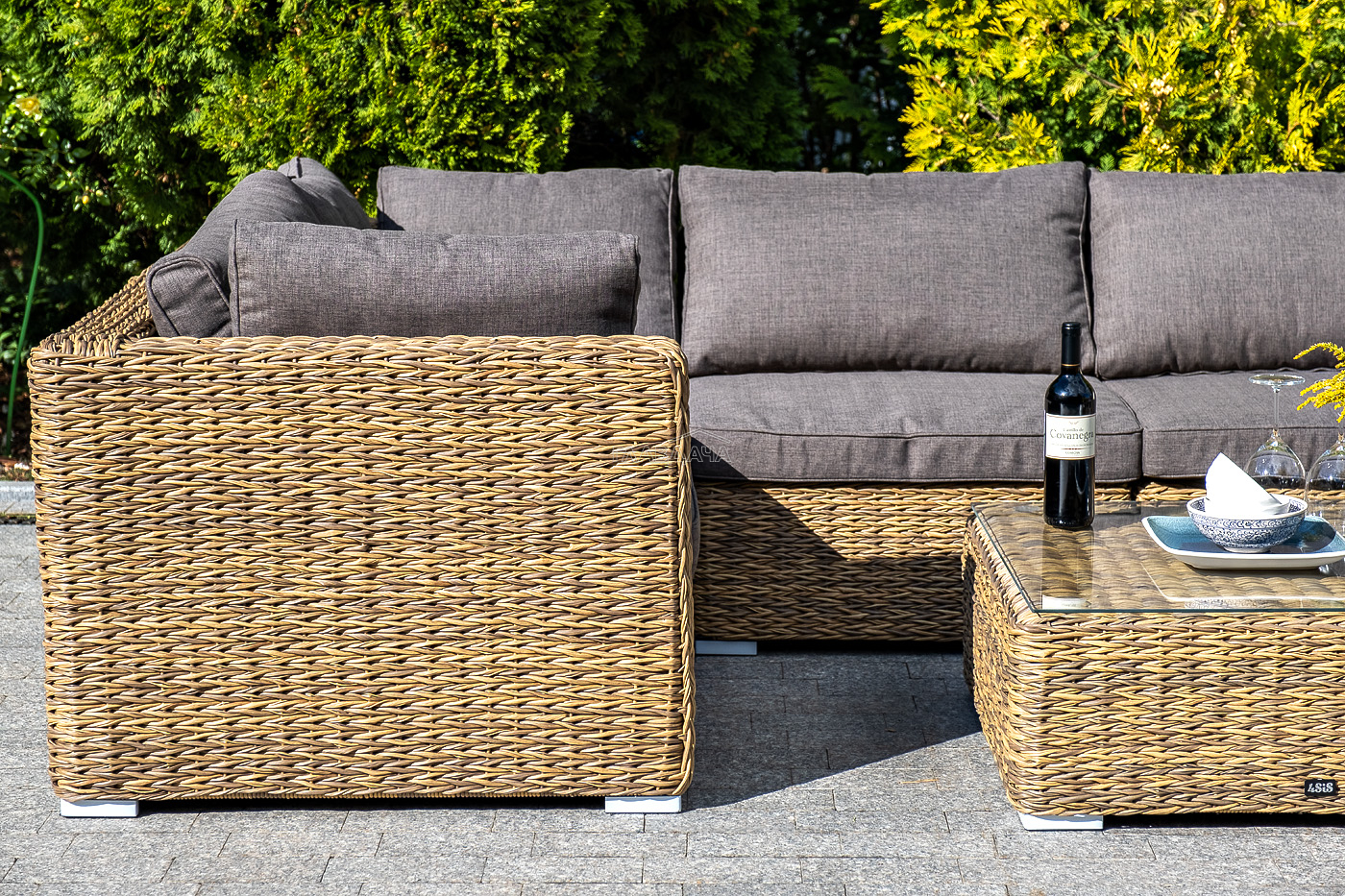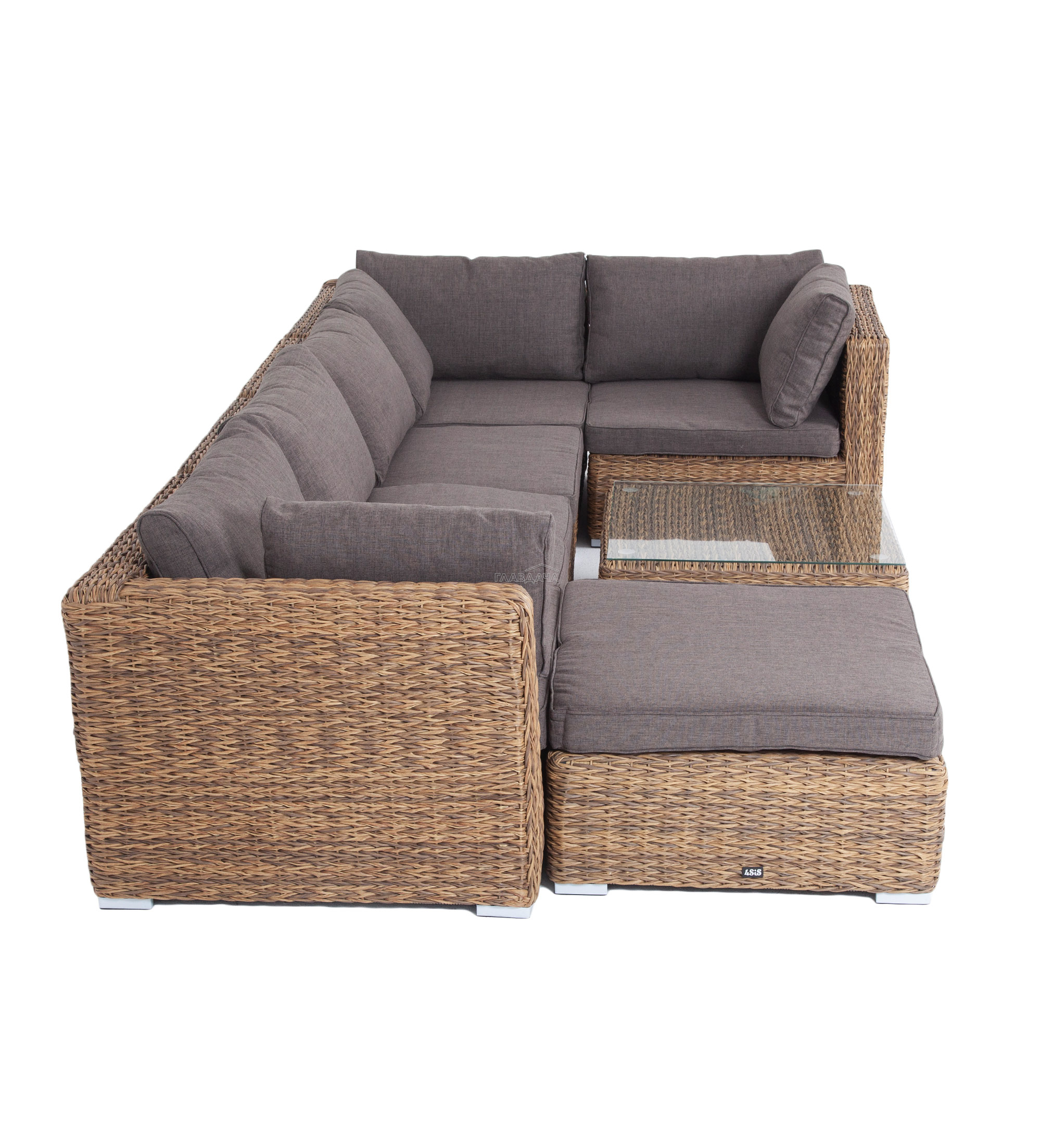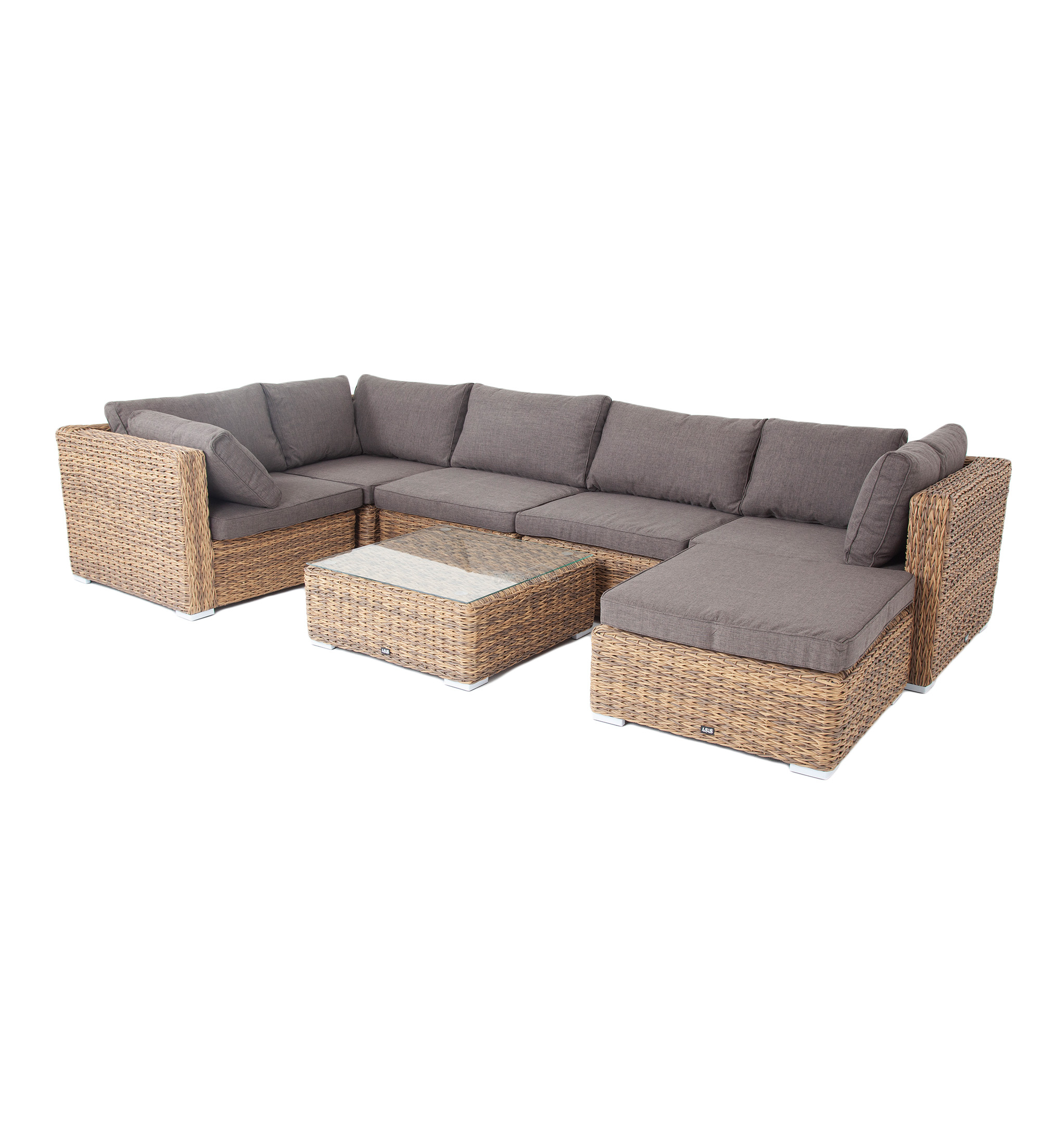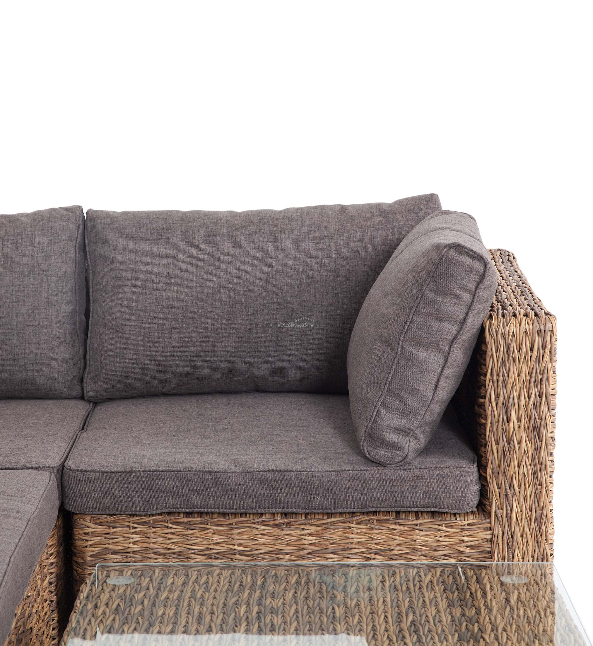 Облегченный алюминиевый каркас, вручную оплетенный искусственным ротангом натурального соломенного оттенка вида "гиацинт". Журнальный столик с прочной стеклянной столешницей толщиной 5 мм.